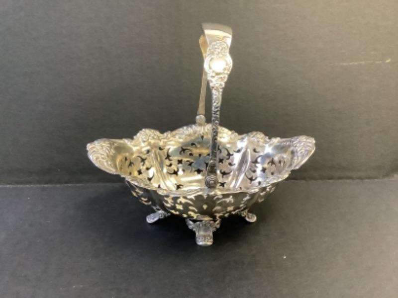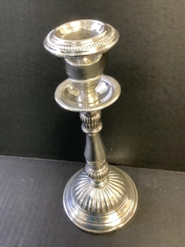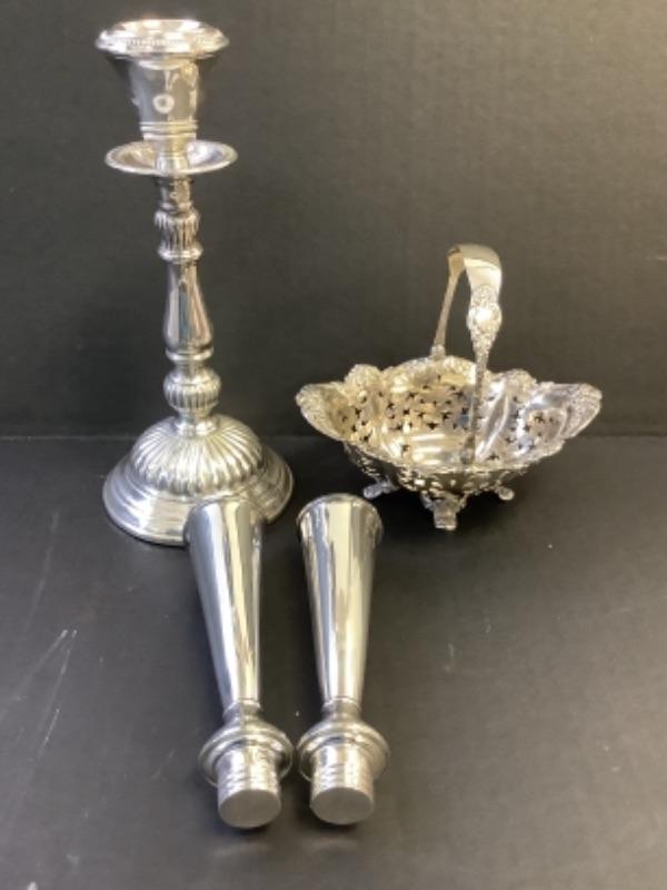 Hallmark sterling silver weighted candlestick measuring 8-1/2” tall, pair of sterling silver candlestick toppers measuring 5-1/2” tall and a small reticulated basket