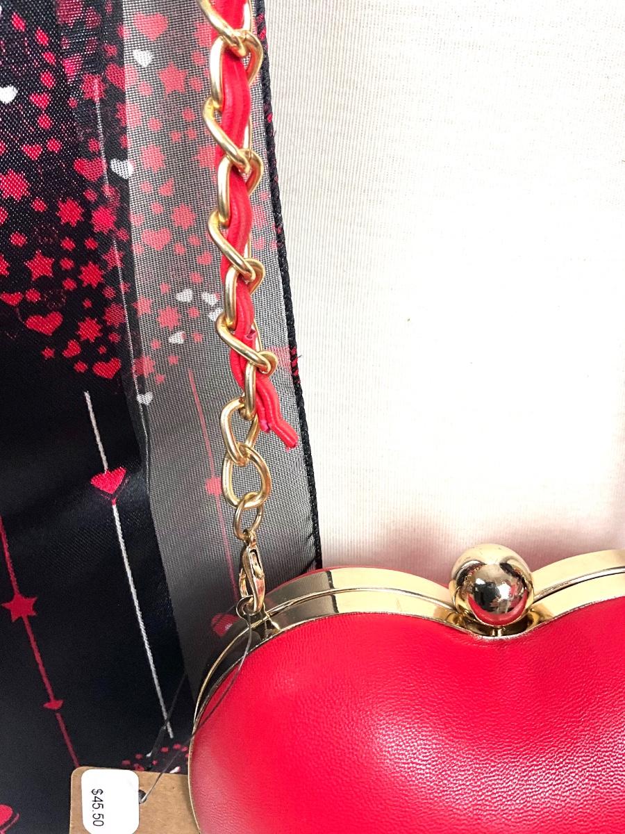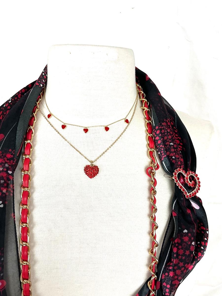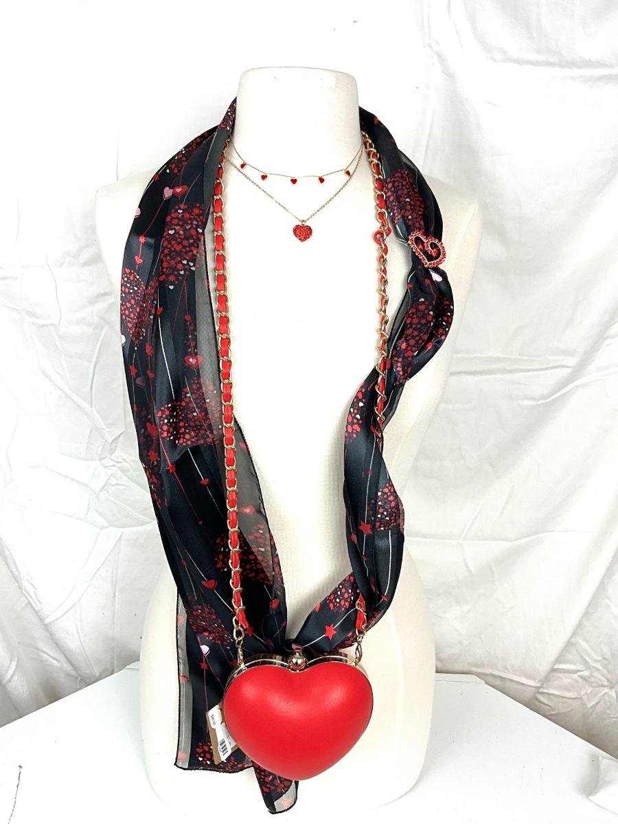 255 Heart Shaped Purse, Heart Black Scarf, Two Enamel & Rhinestone Necklaces, Rhinestone Heart Barrette