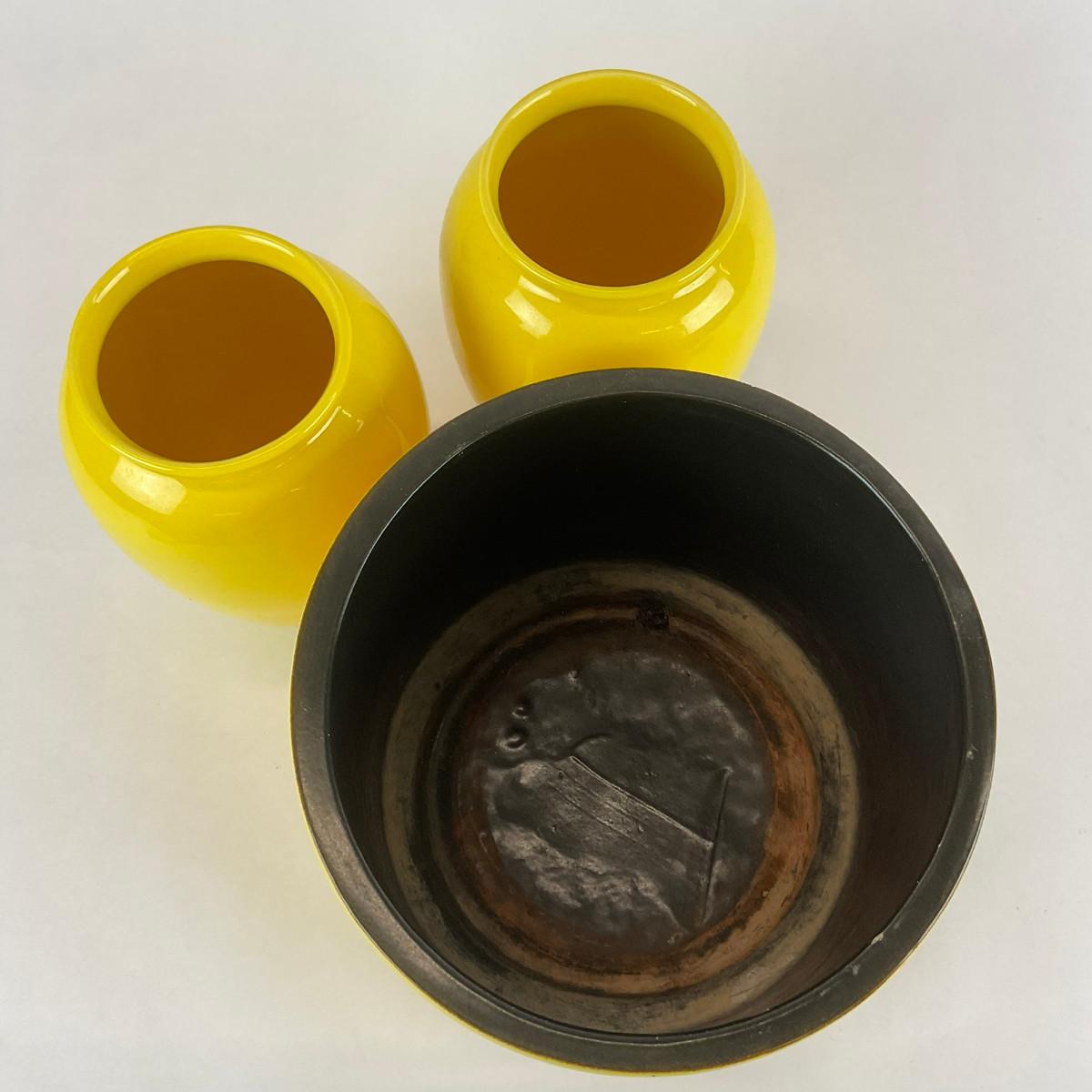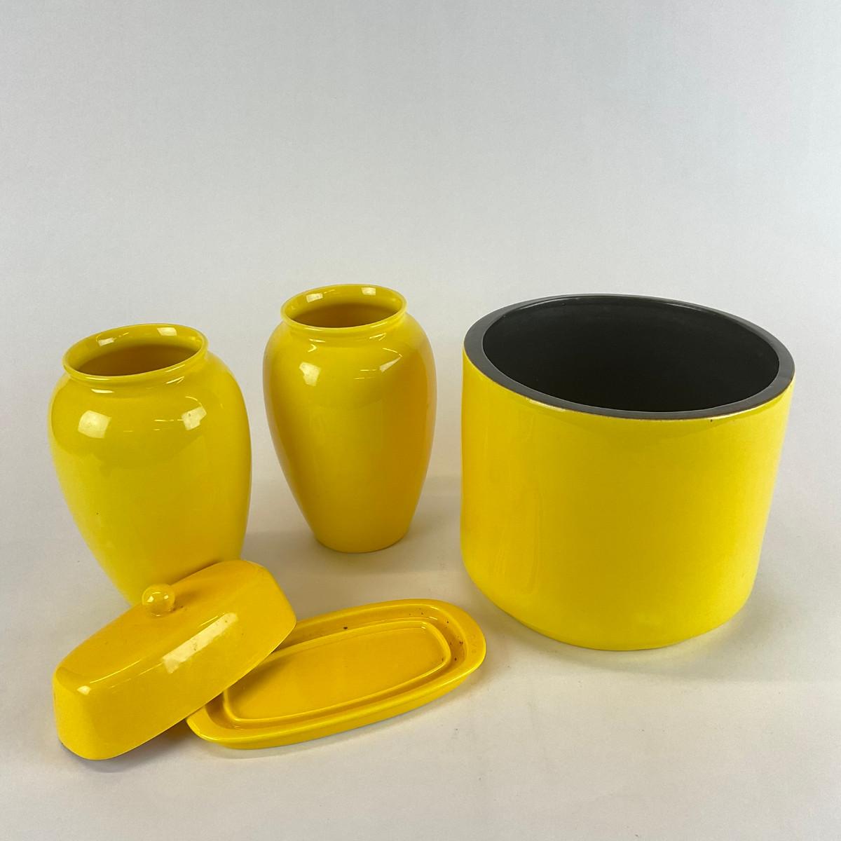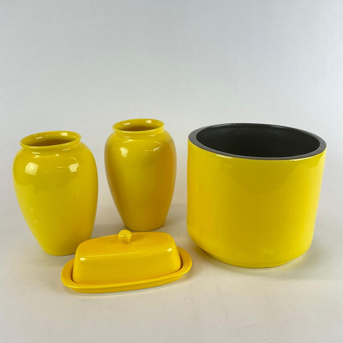 Two Dansk Vases (8" high), Calie USA pot (7" high x 8.5" diameter) & Yellow butter dish