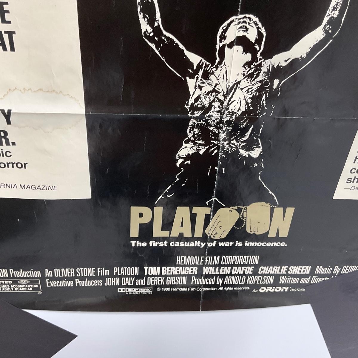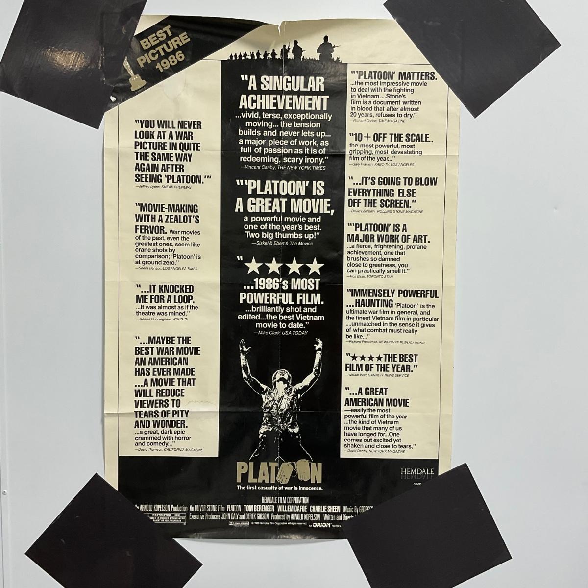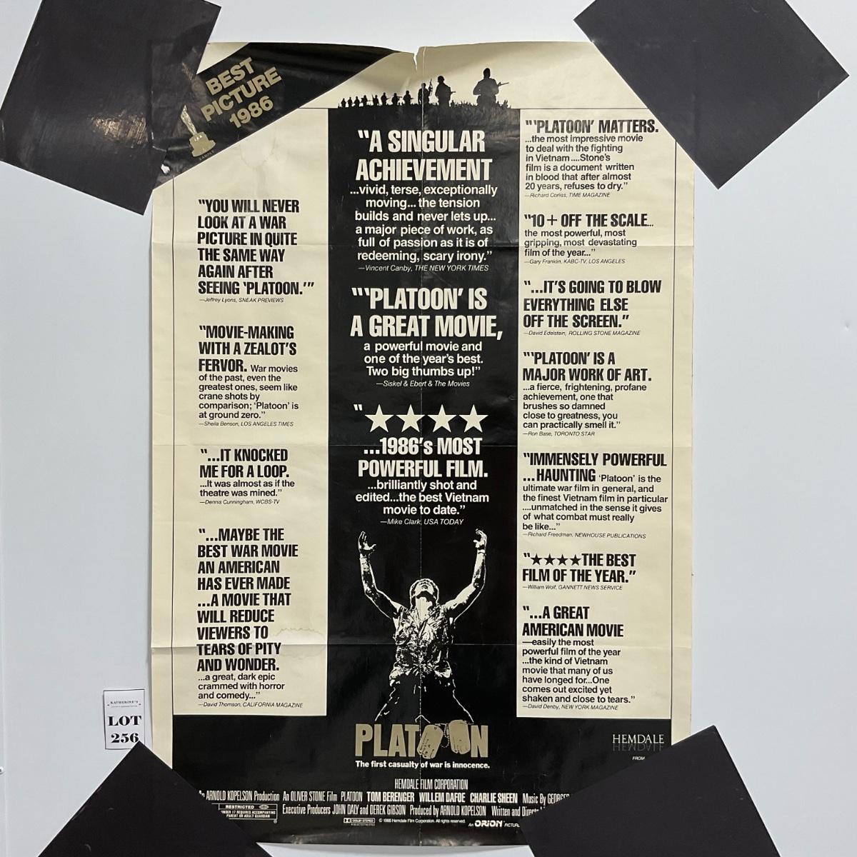 One 1986 Platoon Movie Poster Good amount of damage creases small rips. Please see photos for details and condition. ::: Shipping is available on this lot. If you require shipping you must let us know at the close of the auction. We will coordinate with you after the item has been won. Shipping fees will include insurance up to or exceeding the value of all items being mailed. If you have any questions regarding this lot please contact the auctioneer either via this website, by direct email or by phone. PICK UP TIMES and other important information can be found in the TERMS and DESCRIPTION of the auction. Please take a look for pertinent information. Thanks!