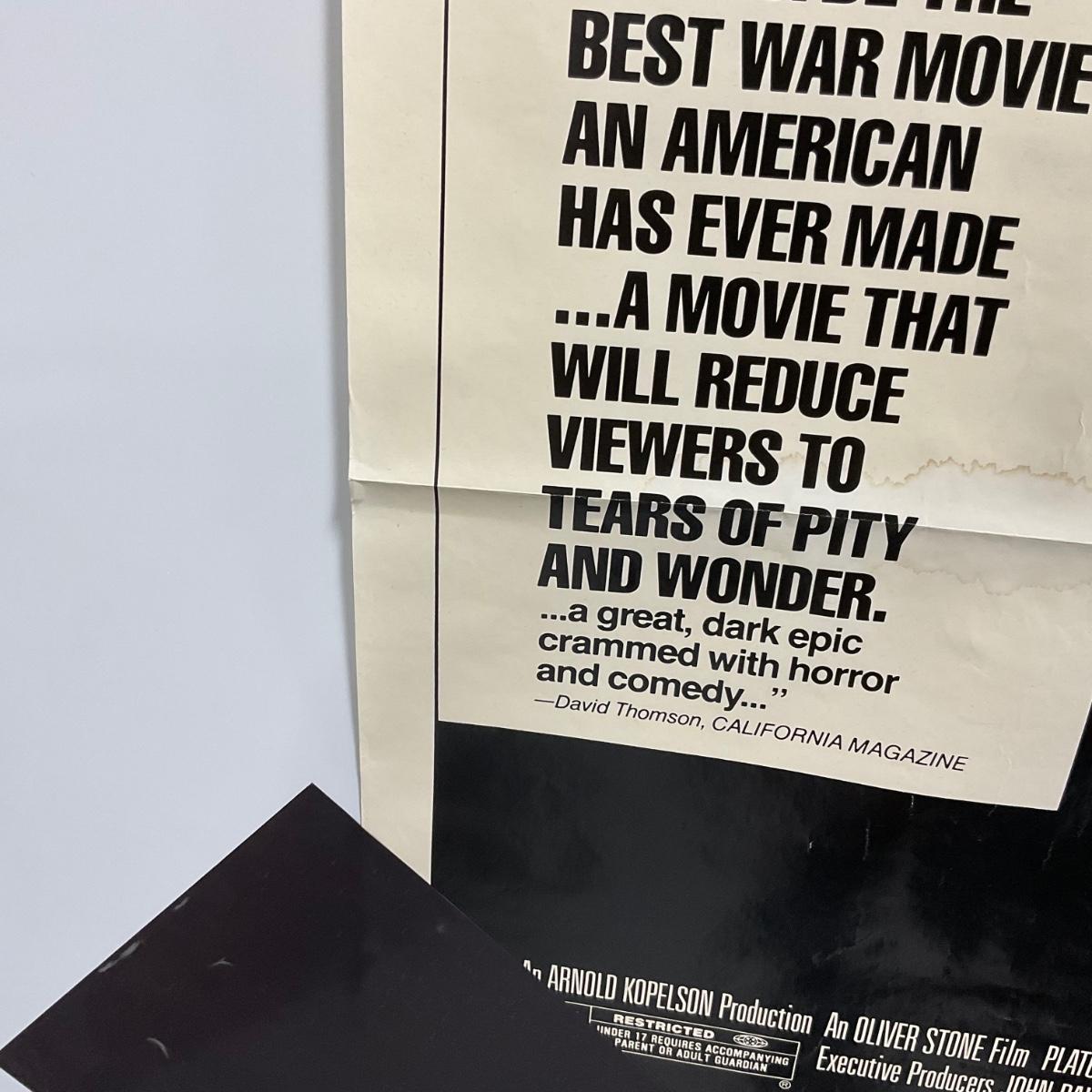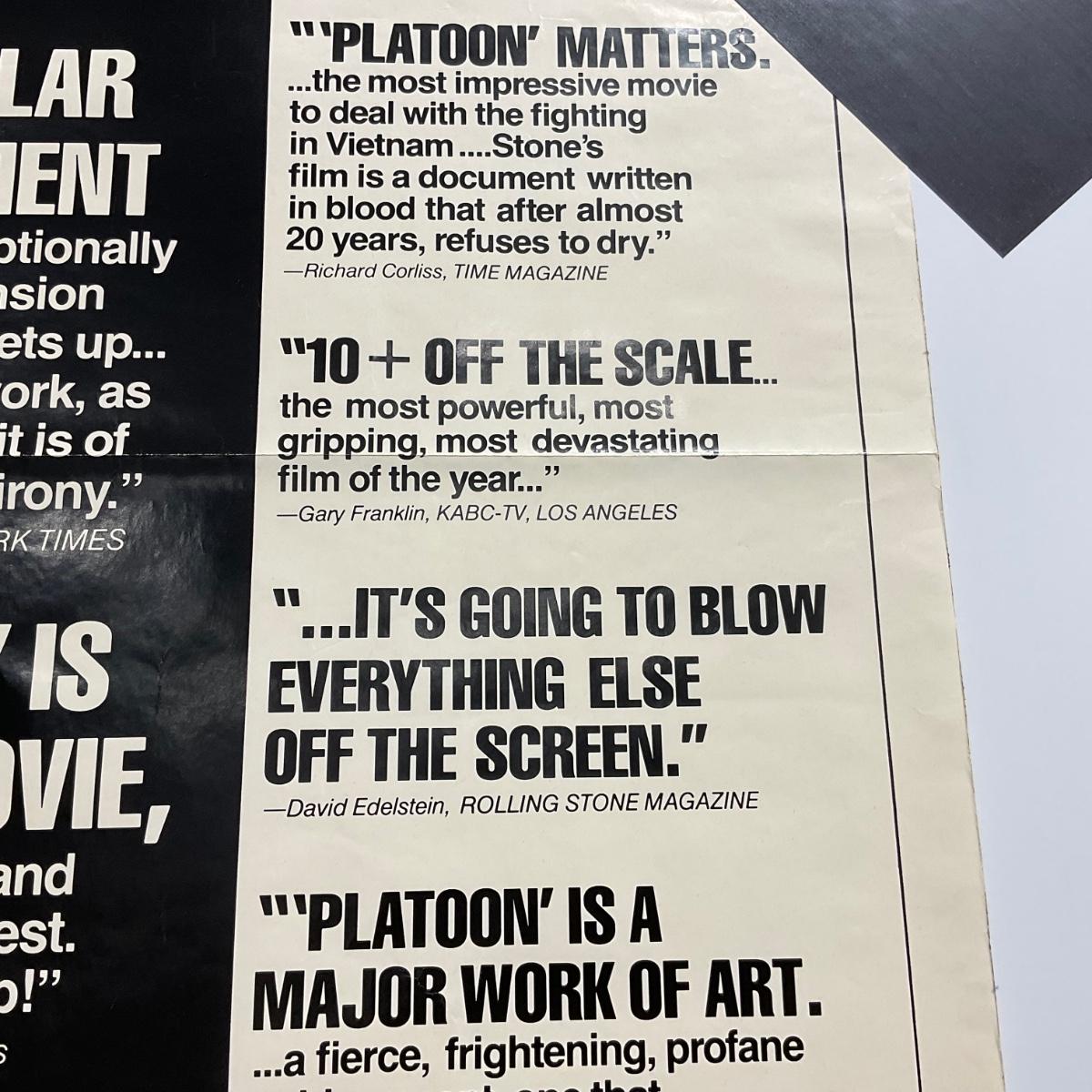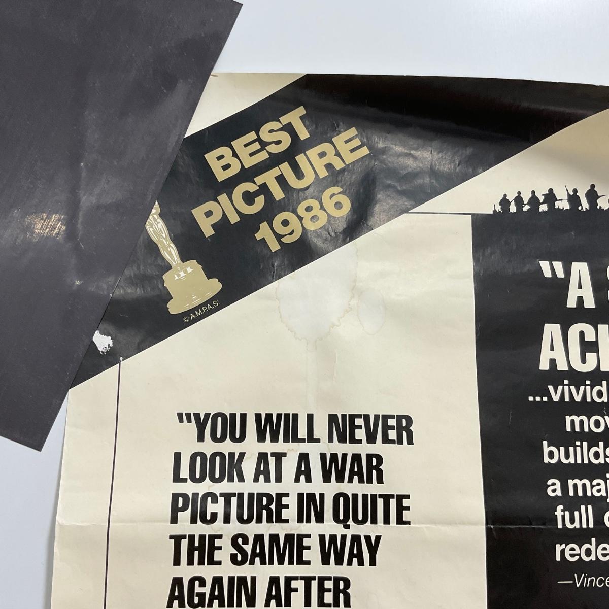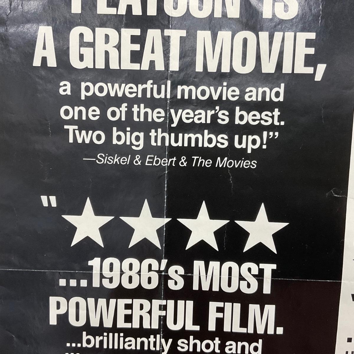 One 1986 Platoon Movie Poster Good amount of damage creases small rips. Please see photos for details and condition. ::: Shipping is available on this lot. If you require shipping you must let us know at the close of the auction. We will coordinate with you after the item has been won. Shipping fees will include insurance up to or exceeding the value of all items being mailed. If you have any questions regarding this lot please contact the auctioneer either via this website, by direct email or by phone. PICK UP TIMES and other important information can be found in the TERMS and DESCRIPTION of the auction. Please take a look for pertinent information. Thanks!
