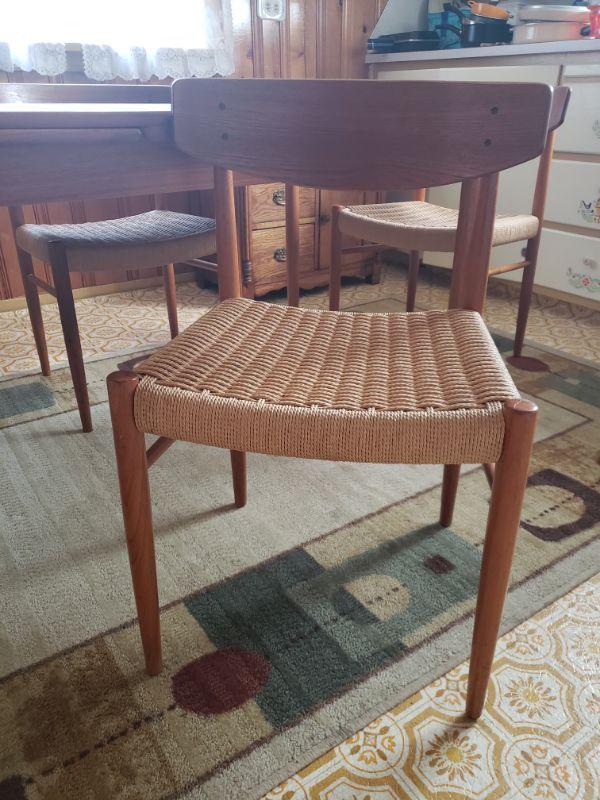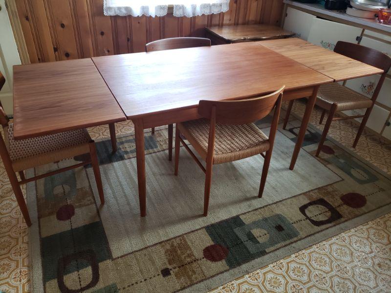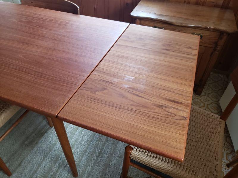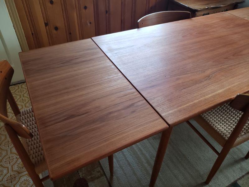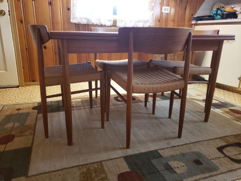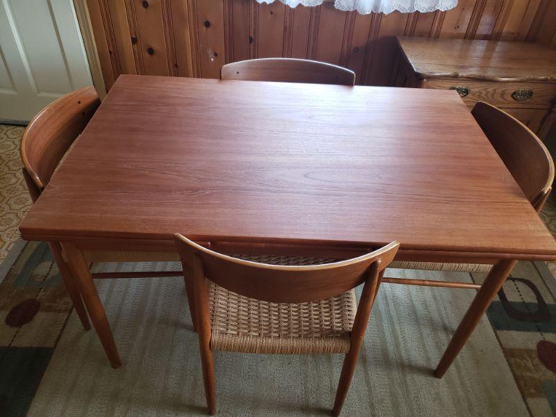 2-58: Mid Century Danish Table and Chairs (51"× 33" × 29" without extension and 86" long when fully extended)