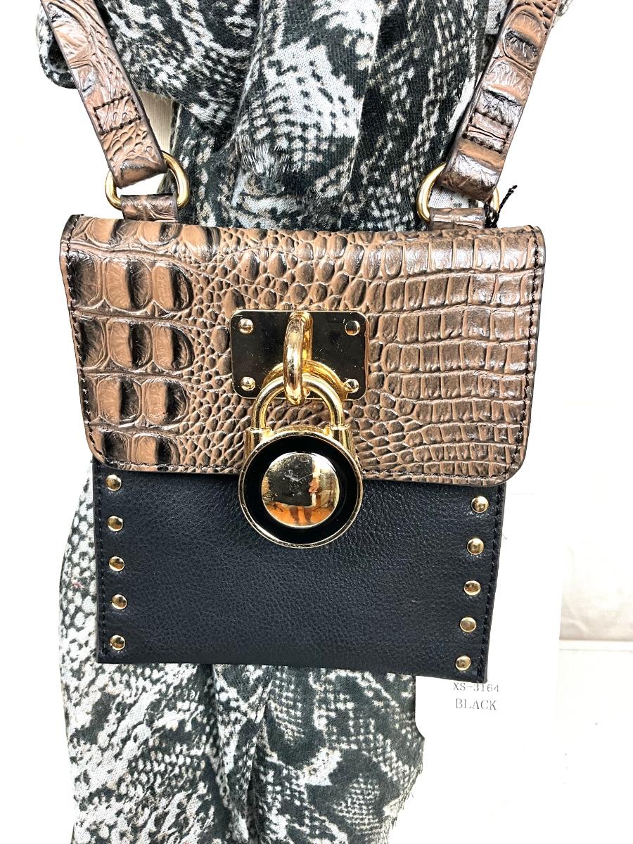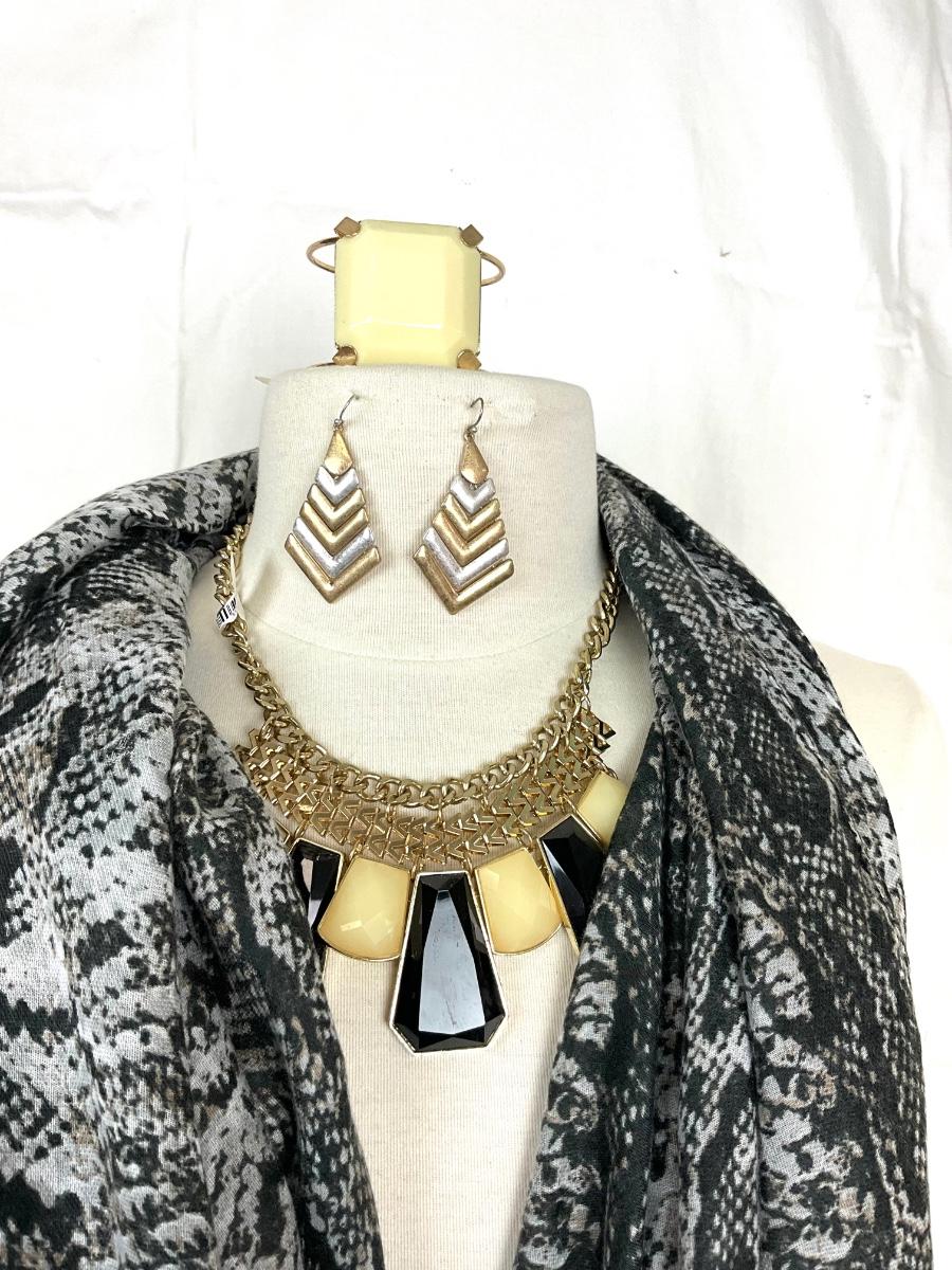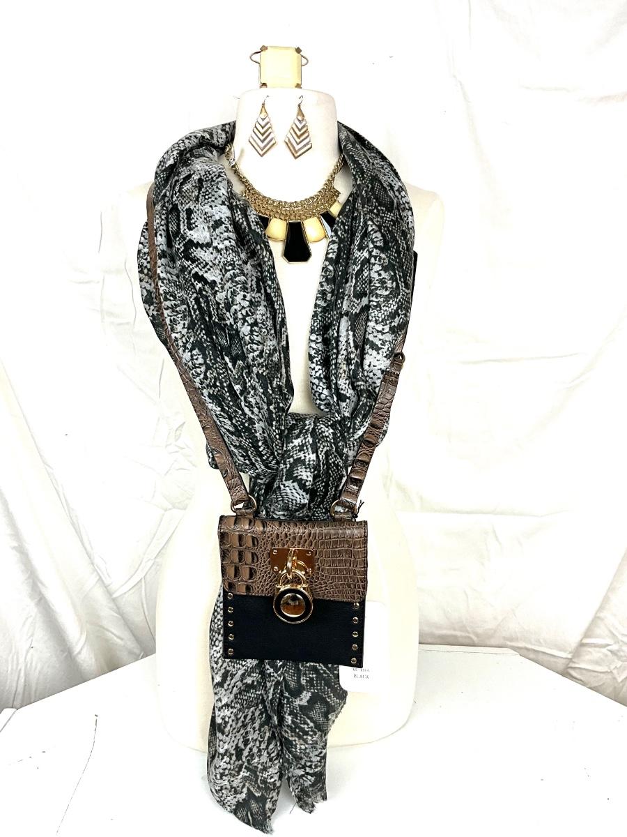 258 Black and White Snake Skin Style Scarf, Small Handbag, Statement Necklace, Silver & Gold Earrings