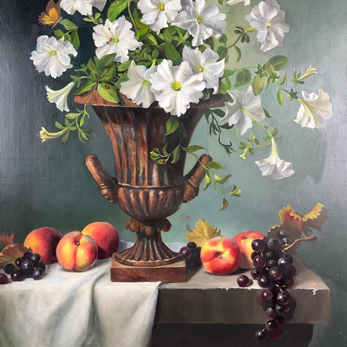 Oil on canvas still life in the classical tradition, featuring floral and fruit motifs. The work reflects mid-20th-century decorative realism.