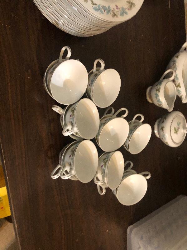 16 cups and saucers , 8 bread plates, 8 salad plates, 7 soup bowls, 11 small bowls, 13 dinner plates, Sugar cream dishes three serving pieces and gravy ladle with tray. This is an ONSITE Auction all items will need to be picked up on location. Please see auction description for pick up procedures.Ê