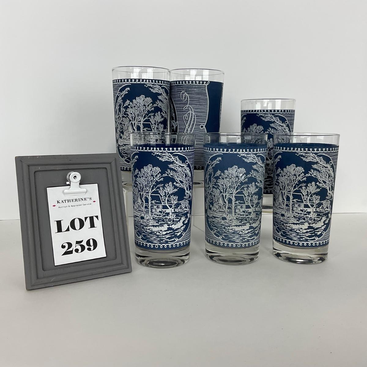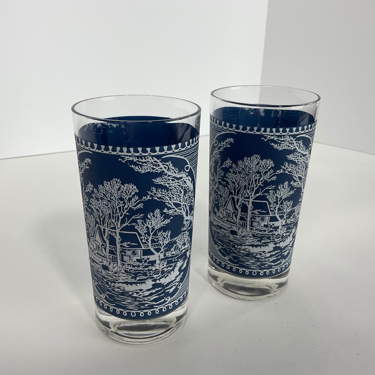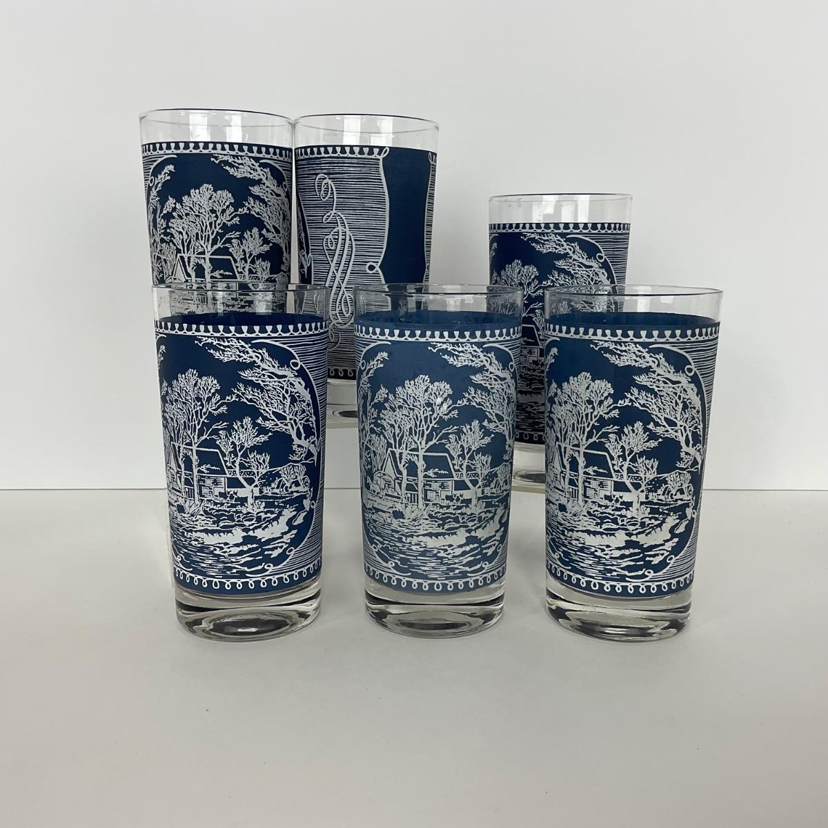 Six Currier & Ives Old Mill Dark Blue drinking glasses. Please see photos for details and condition. ::: Shipping is available on this lot. If you require shipping you must let us know at the close of the auction. We will coordinate with you after the item has been won. Shipping fees will include insurance up to or exceeding the value of all items being mailed. If you have any questions regarding this lot please contact the auctioneer either via this website, by direct email or by phone. PICK UP TIMES and other important information can be found in the TERMS and DESCRIPTION of the auction. Please take a look for pertinent information. Thanks!
