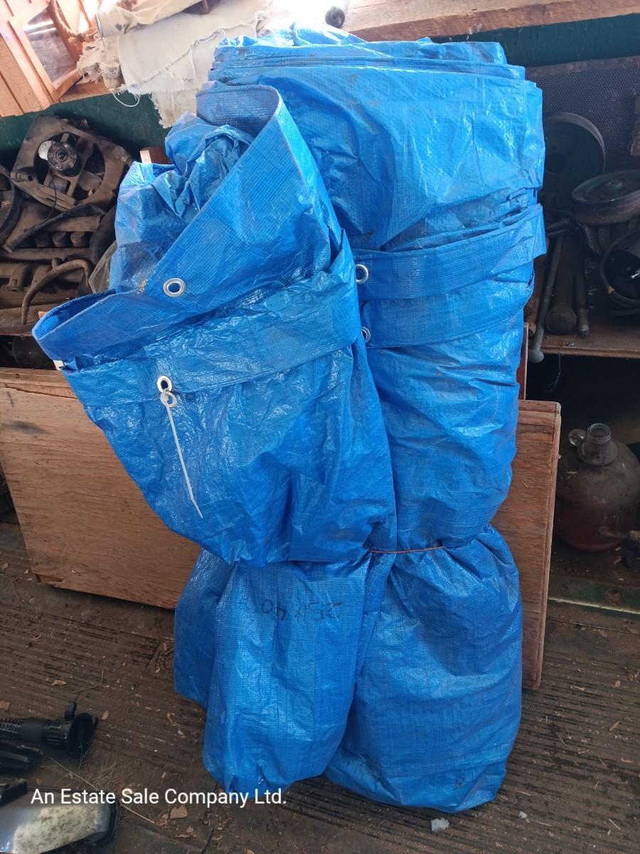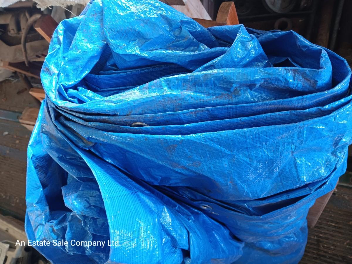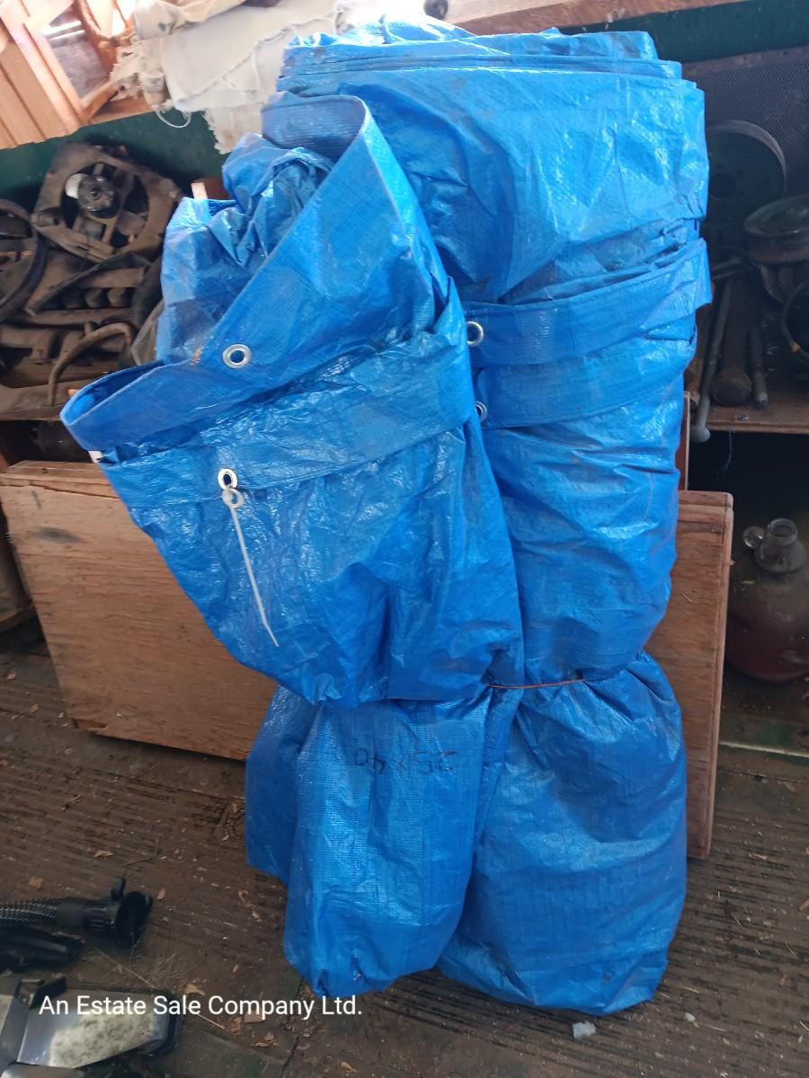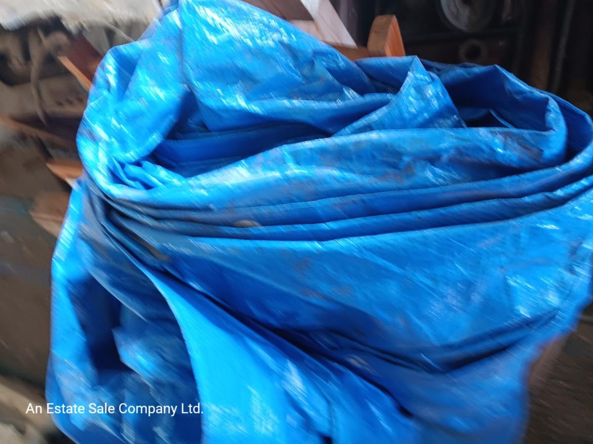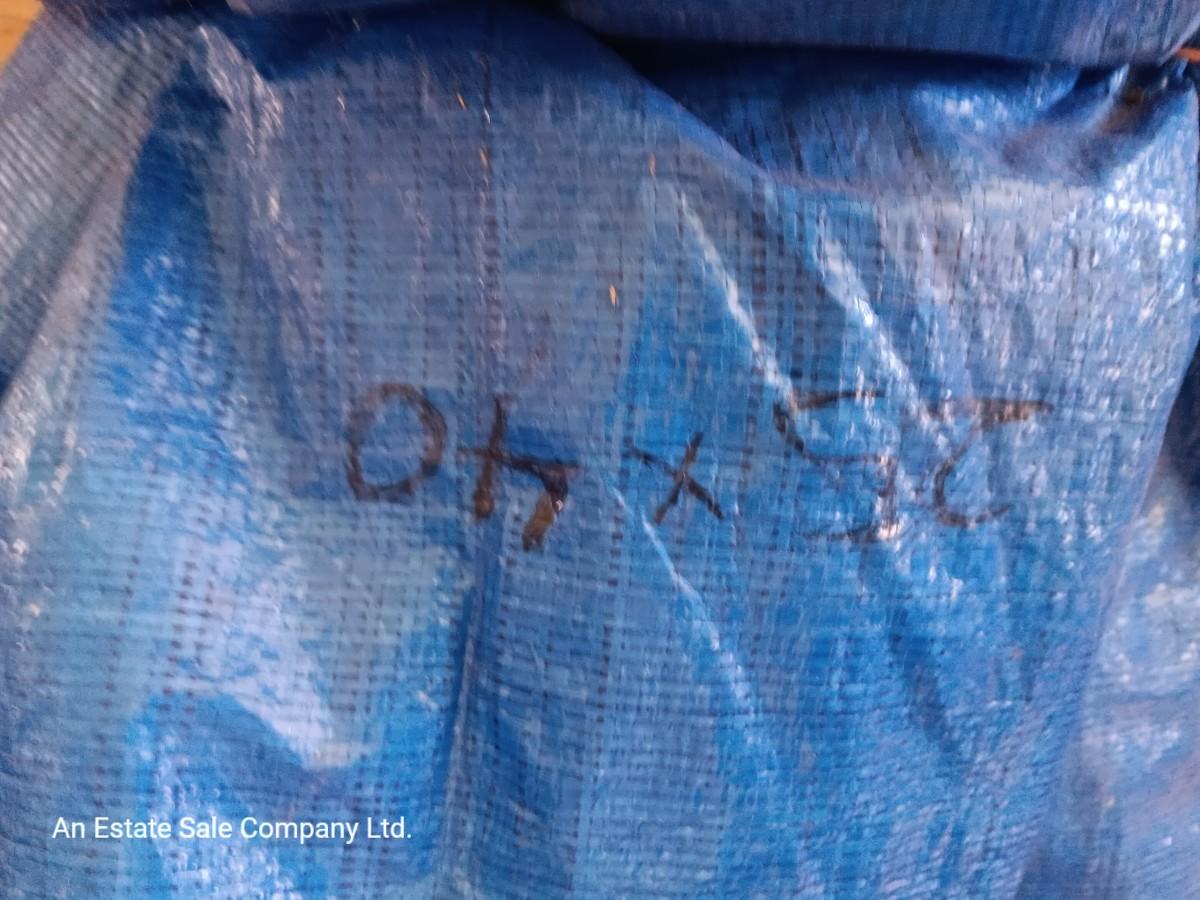 Blue Tarp with metal grommets - This tarp appears to be in good condition. Someone has written 25x40 on it with marker.