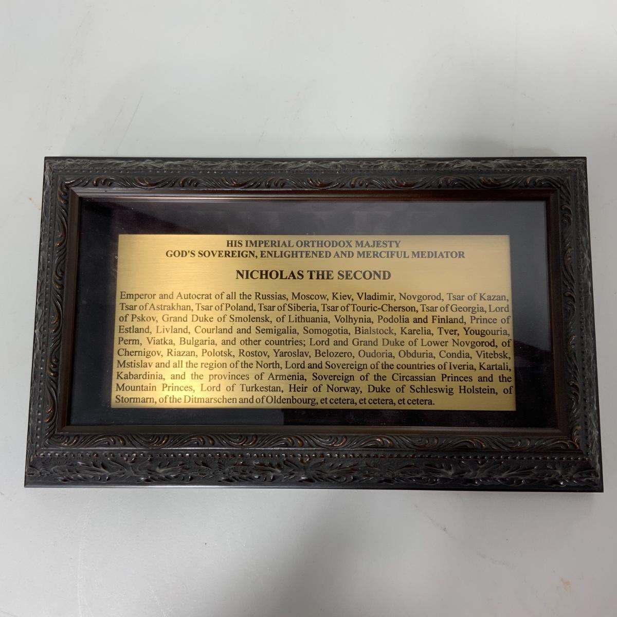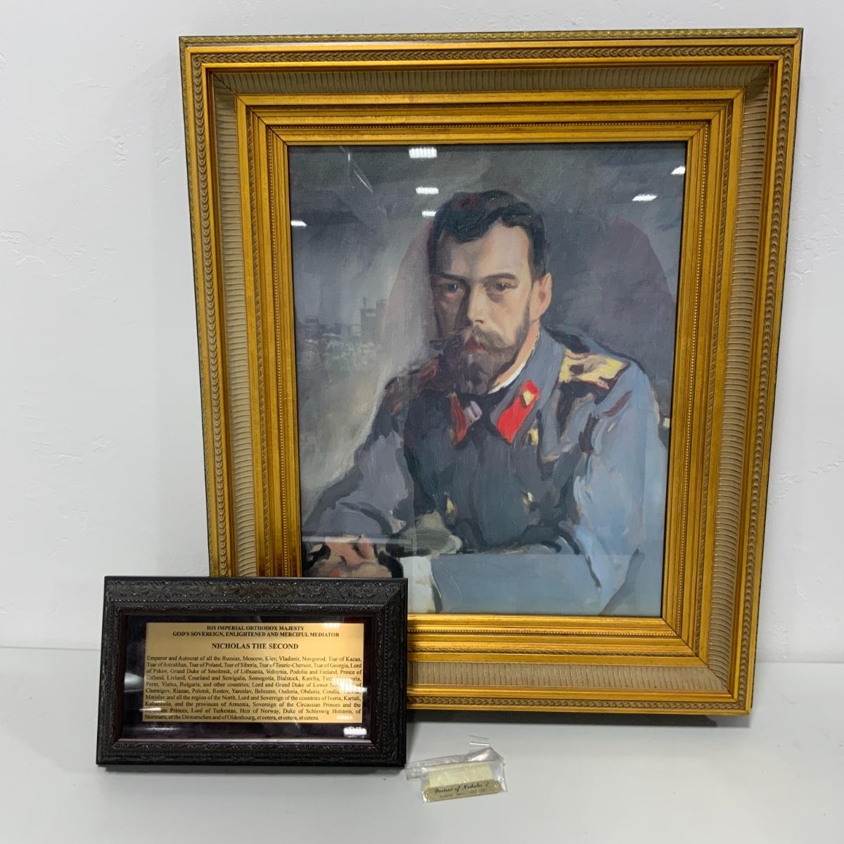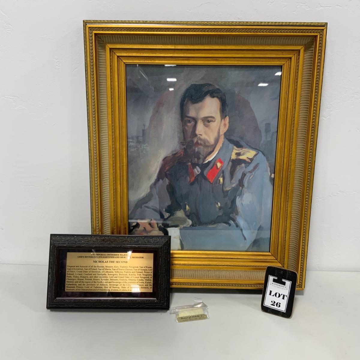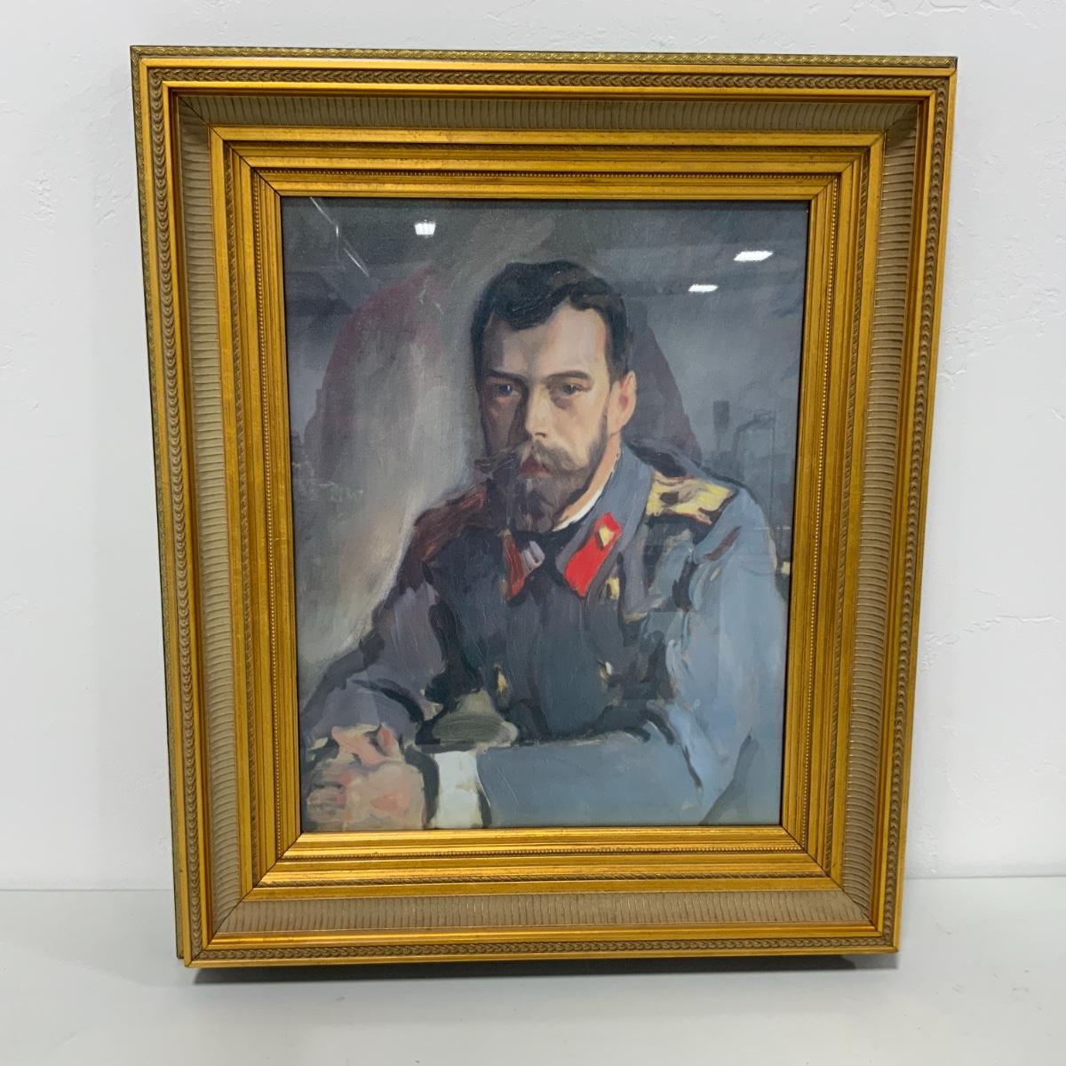 From the Estate of Peter Radovanovich: Exceptional Reproduction, Expertly framed Oil Painting of Czar Nicholas II by Serov. Painted originally in 1900 this is how history will remember him. Framed under Conservation Glass by a reputable local frame shop. This piece comes with two plaques, one framed - to make a bold statement, and one smaller - for those with space constraints. The frame measures 27” x 22”. The larger plaque measures 12” x 7”. The painting has been printed onto a stretched canvas and treated with an over coating to simulate brush strokes. Please see photos for details and condition. ::: Shipping is available on this lot. If you require shipping you must let us know at the close of the auction. We will coordinate with you after the item has been won. Shipping fees will include insurance up to or exceeding the value of all items being mailed. If you have any questions regarding this lot please contact the auctioneer either via this website, by direct email or by phone. PICK UP TIMES and other important information can be found in the TERMS and DESCRIPTION of the auction. Please take a look for pertinent information. Thanks!