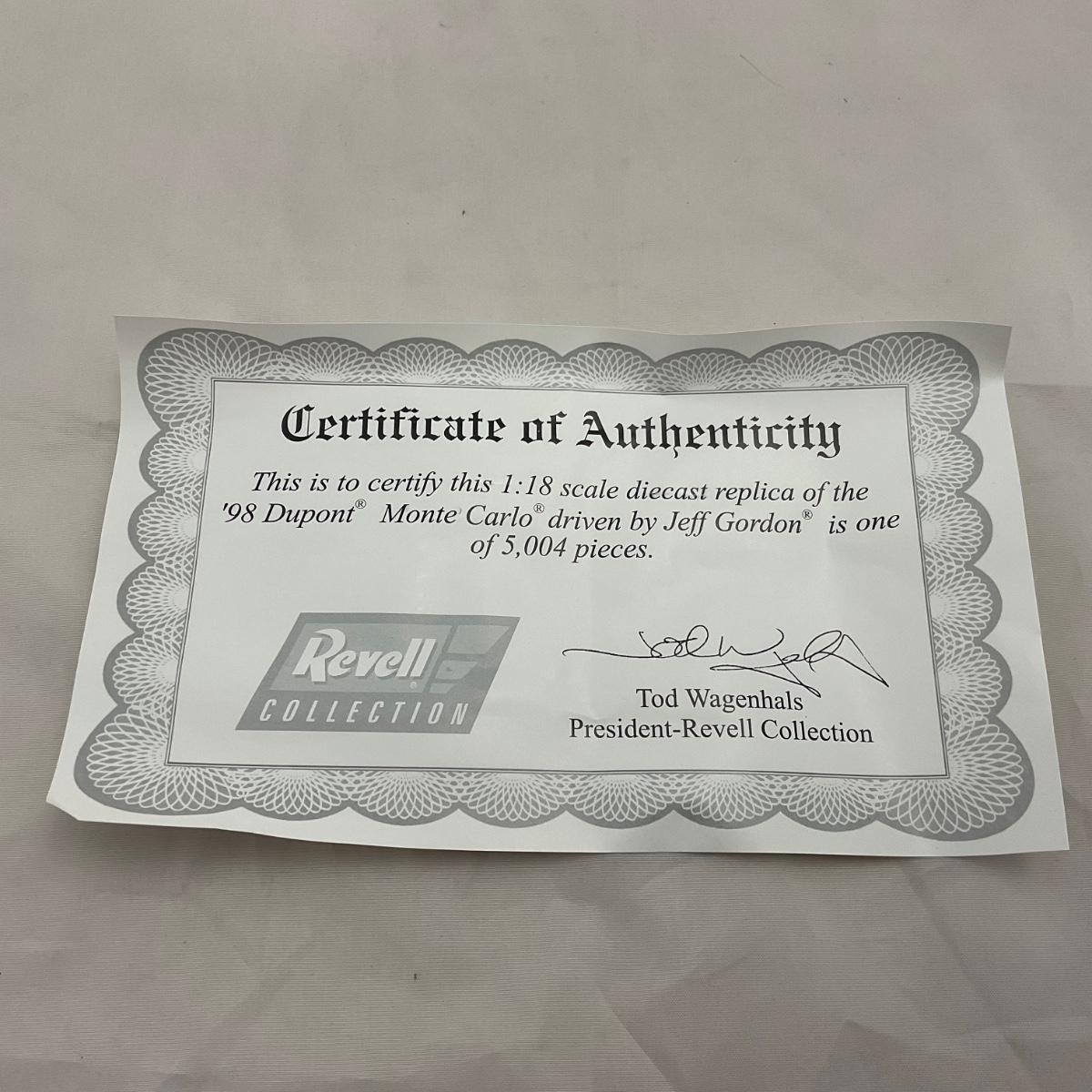 One NASCAR die cast 1:18 scale 1998 DuPoint Chevrolet Monte Carlo figure. Jeff Gordon. Comes with a Certificate of Authenticity. Please see photos for details and condition. ::: Shipping is available on this lot. If you require shipping you must let us know at the close of the auction. We will coordinate with you after the item has been won. Shipping fees will include insurance up to or exceeding the value of all items being mailed. If you have any questions regarding this lot please contact the auctioneer either via this website, by direct email or by phone. PICK UP TIMES and other important information can be found in the TERMS and DESCRIPTION of the auction. Please take a look for pertinent information. Thanks!