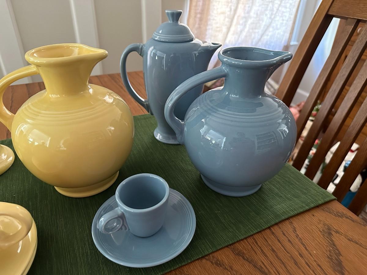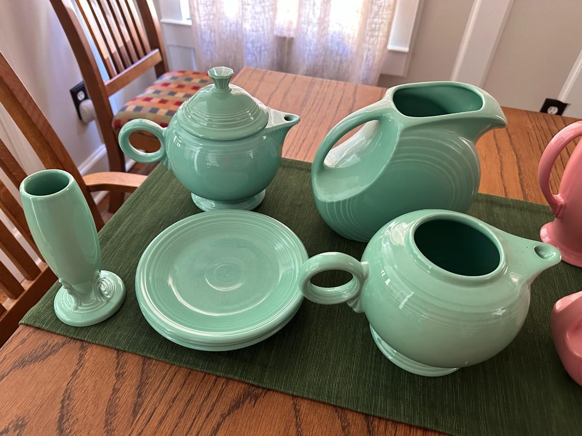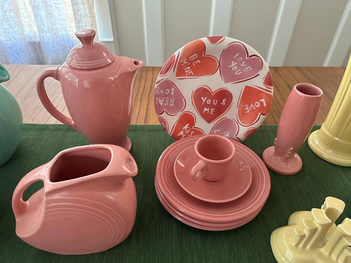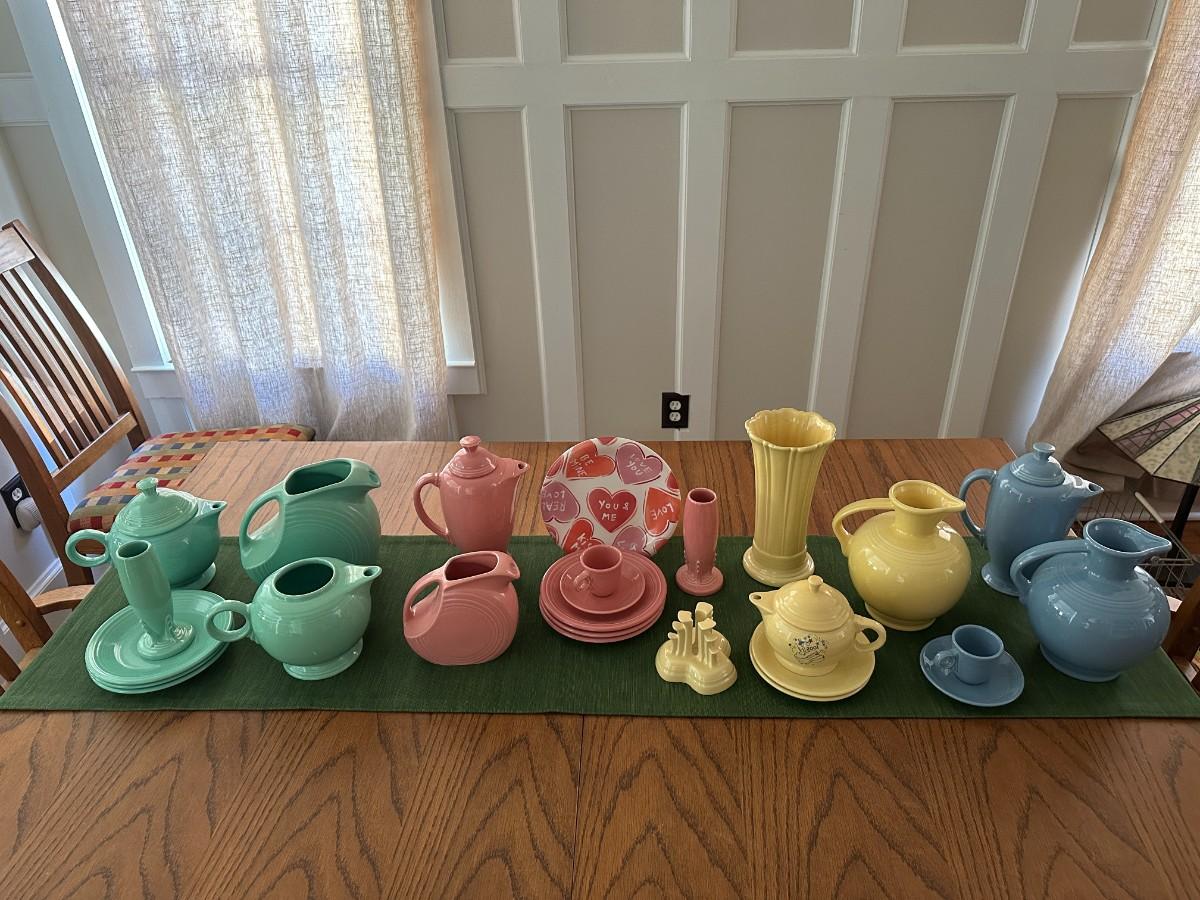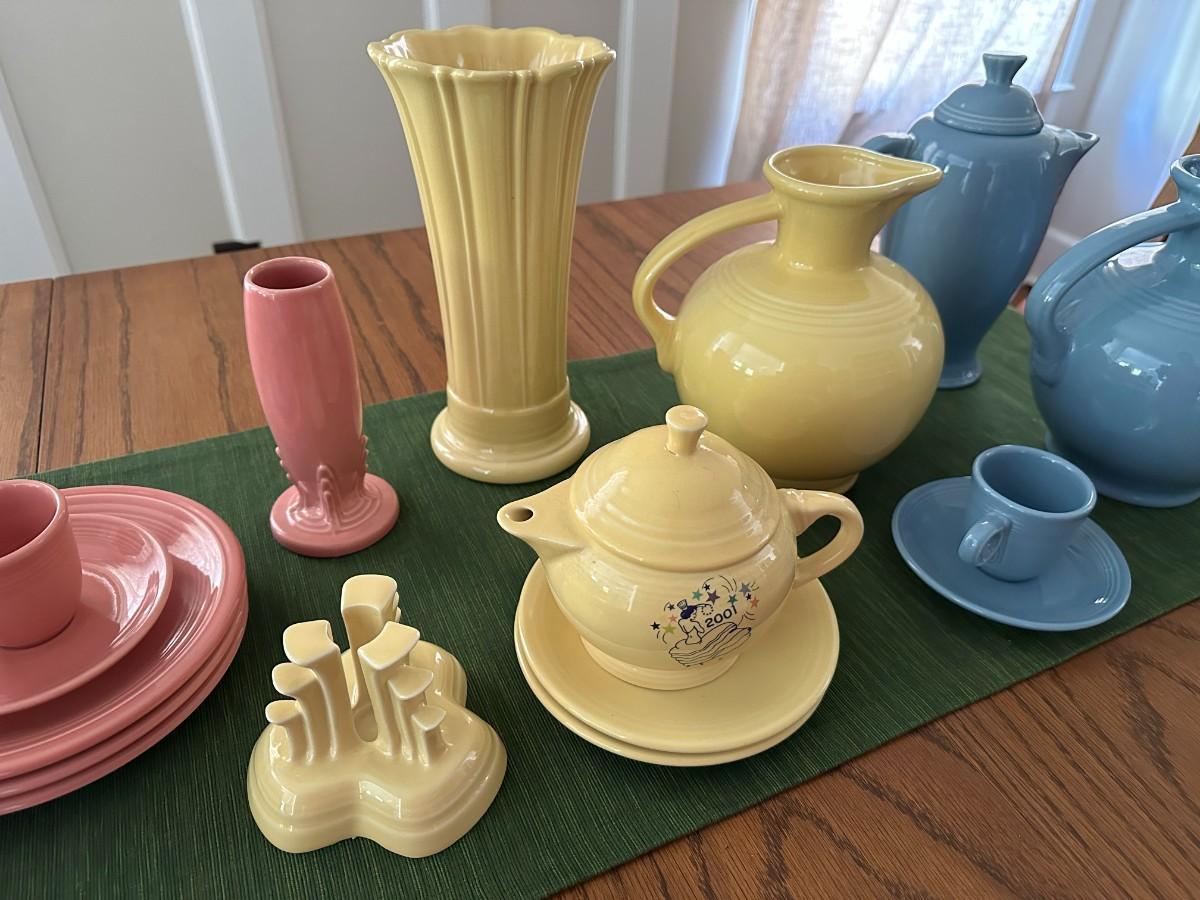 Sea Foam: 3 Salad Plates, 1 Bud Vase, 1 Teapot, 1 Teapot missing top, 1 Pitcher. Pink: 1 Coffee Pot, 1 Pitcher, 3 Salad Plates, 1 Cup w/ 1 Saucer, 1 Bud Vase, 1 Valentine 1 Hearts Plate. Yellow: 1 Pyramid Taper Candle Holder, 1 Tall Vase, 1 Pitcher, 1 "2001" Teapot, 2 Dessert Plates. Blue: 1 Cup w/1 Saucer, 1 Coffee Pot, 1 Pitcher