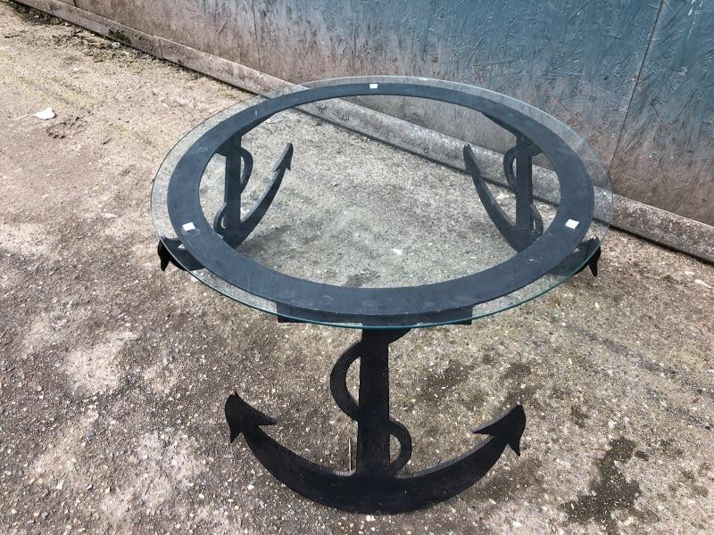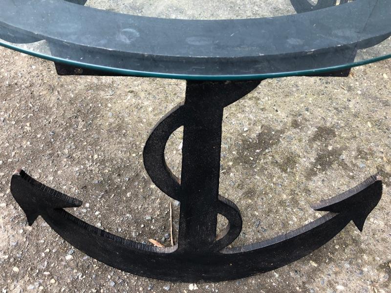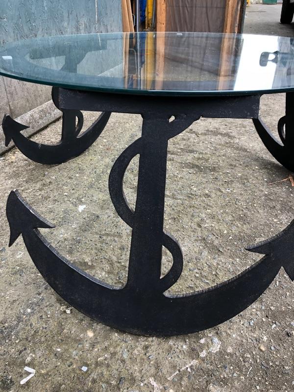 Cool, custom, nautical coffee table. It is a solid piece and is topped with a round piece of glass. It is in great shape!