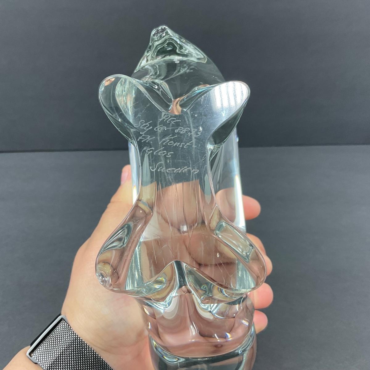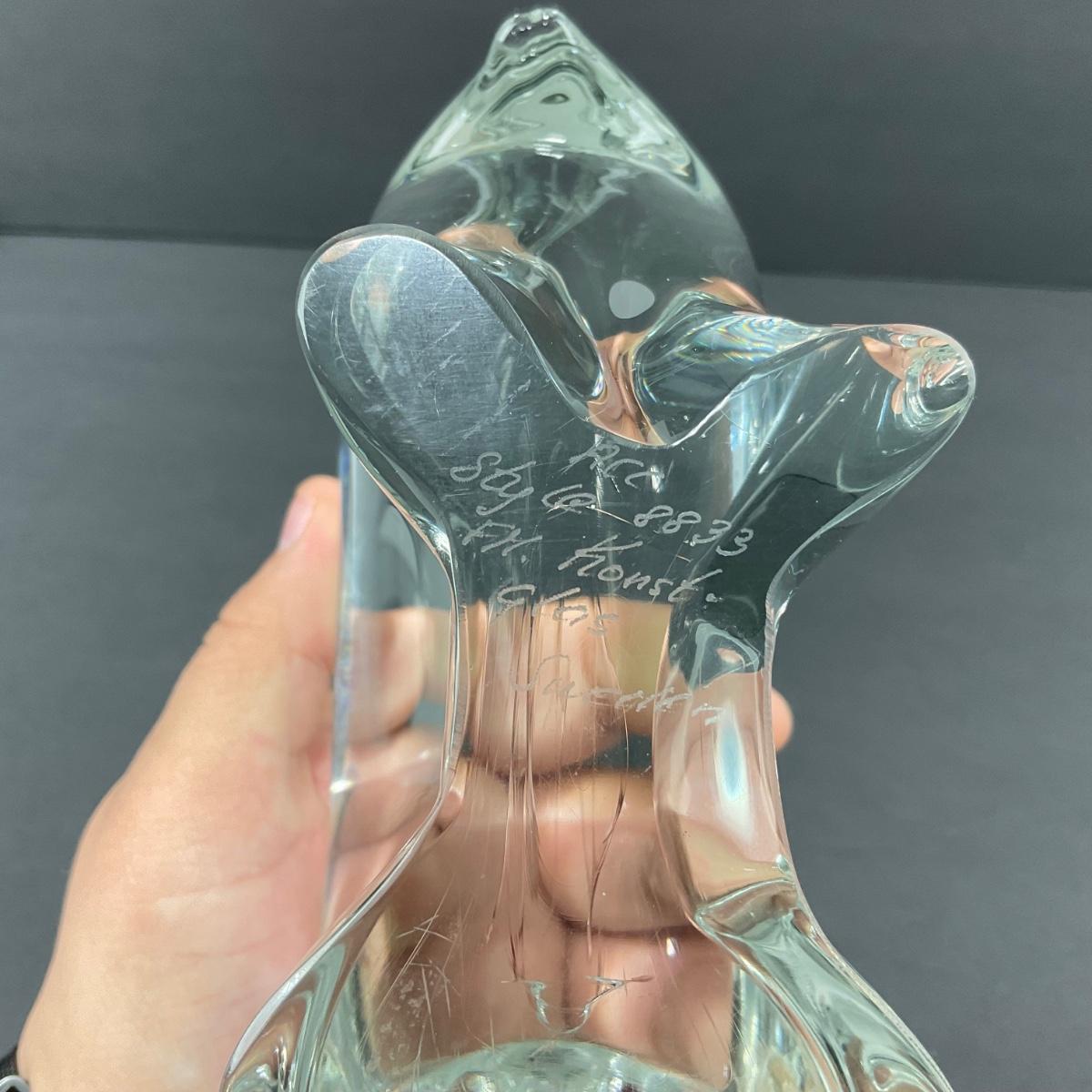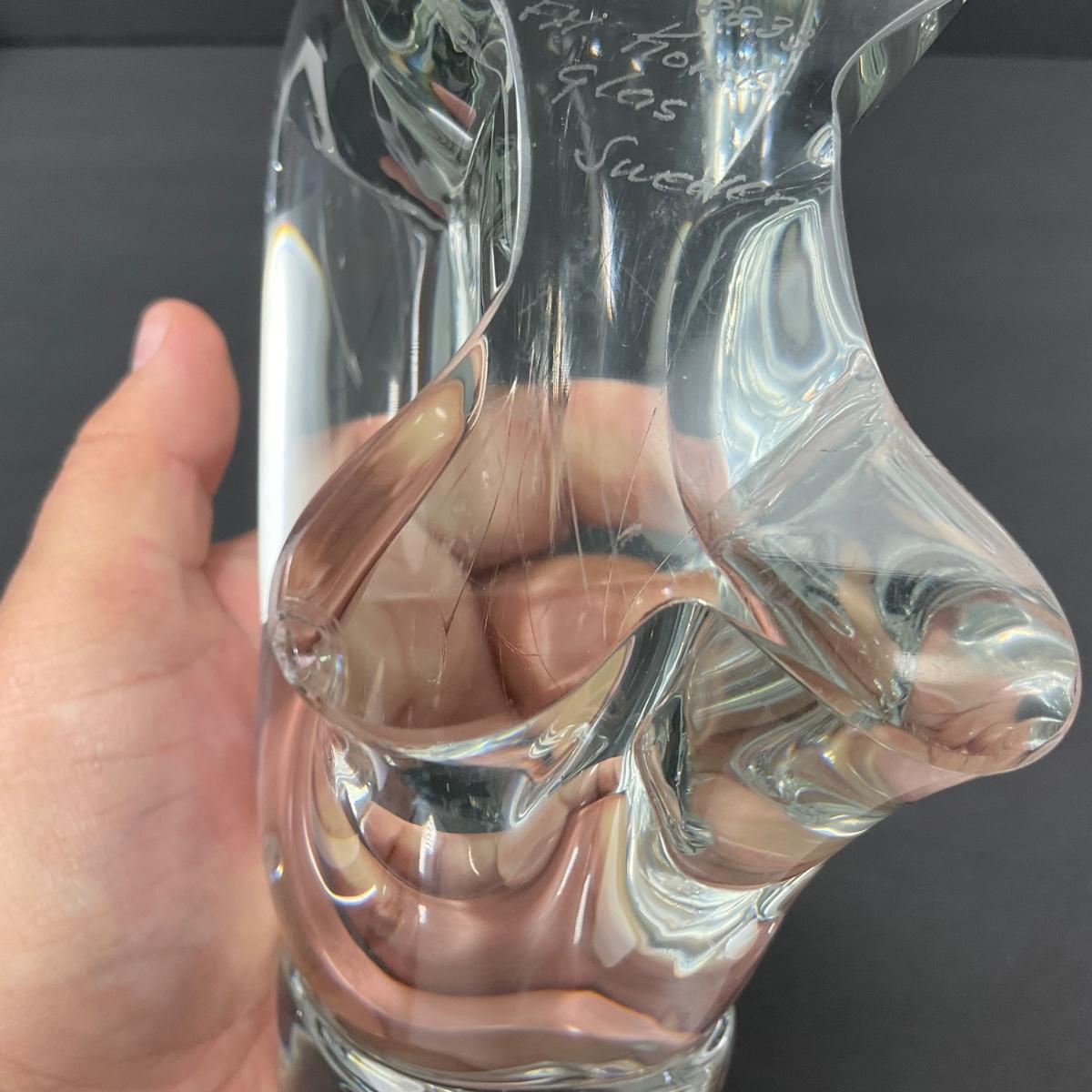 One vintage signed Sweden glass Hipp figure. This piece is signed acc style 8833 FM. Konst. There does appear to be a small chip at the bottom base of this piece. Please see photos for details and condition. Any condition statement is given as a courtesy to a client, is an opinion, and should not be treated as a statement of fact. Reference to condition written, oral or within a condition report shall not be regarded as a full account of condition and may not include all defects, alterations, or restorations. Absence of a condition report does not imply a lot is flawless or lacking imperfections or damage. Katherine’s Auction & Appraisal Service shall have no responsibility for any error or omission. Returns shall not be accepted on the basis of condition. ::: Shipping is available on this lot. If you require shipping you must let us know at the close of the auction. We will coordinate with you after the item has been won. Shipping fees will include insurance up to or exceeding the value of all items being mailed. If you have any questions regarding this lot please contact the auctioneer either via this website, by direct email or by phone. PICK UP TIMES and other important information can be found in the TERMS and DESCRIPTION of the auction. Please take a look for pertinent information. Thanks!