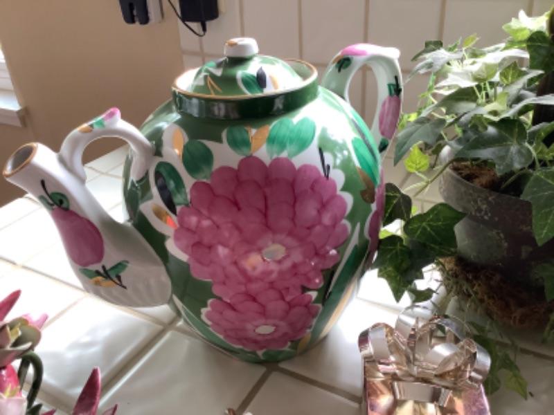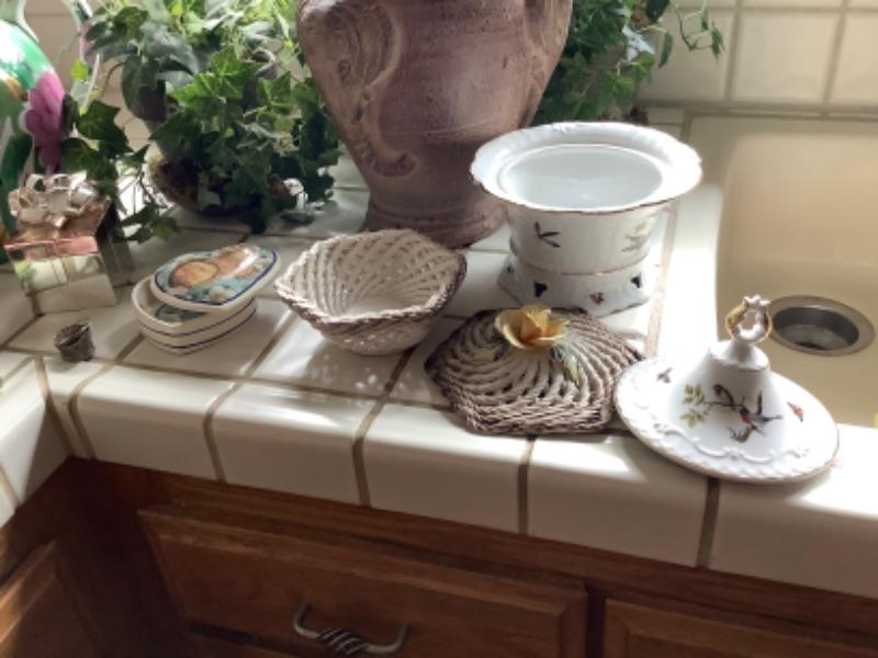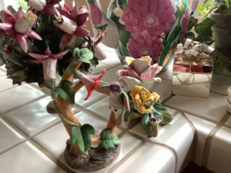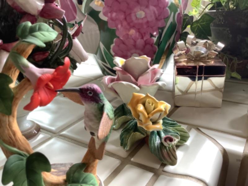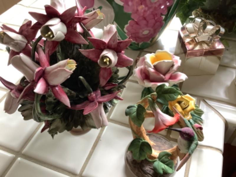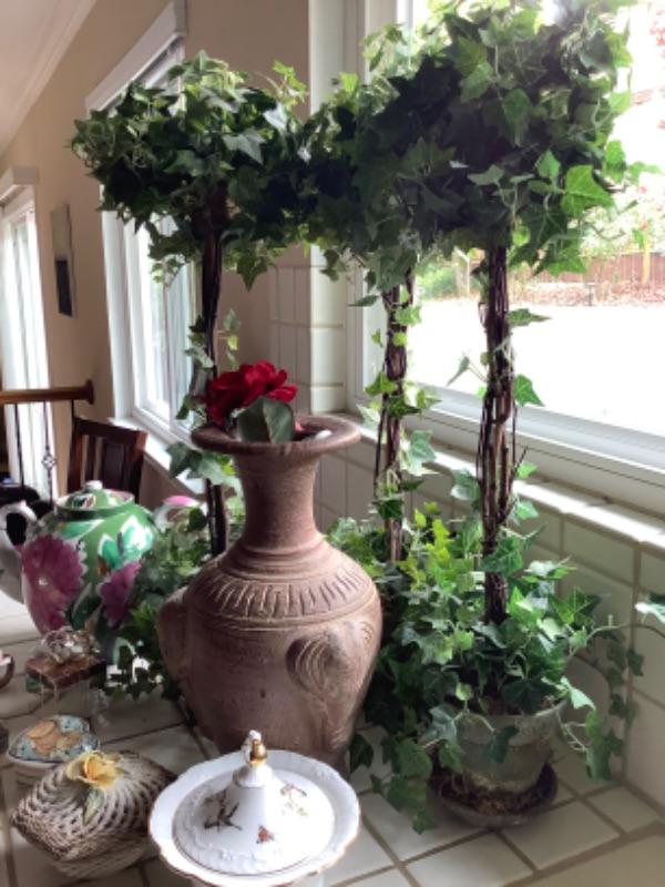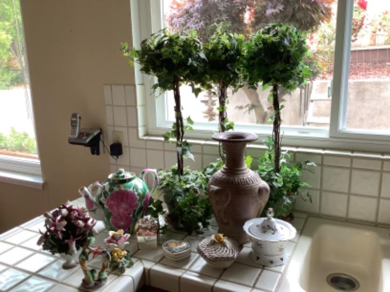 Gorgeous collection of small porcelain boxes, 3 silk topiaries, ceramic vase and tea pot. Wonderful condition