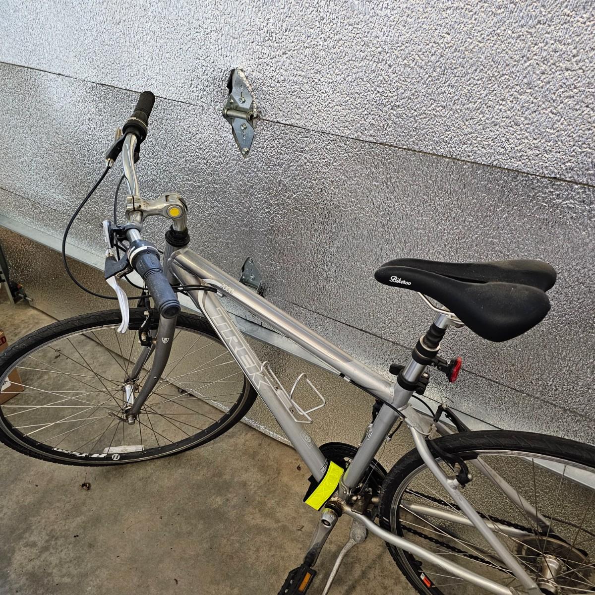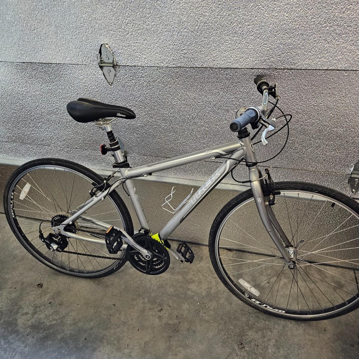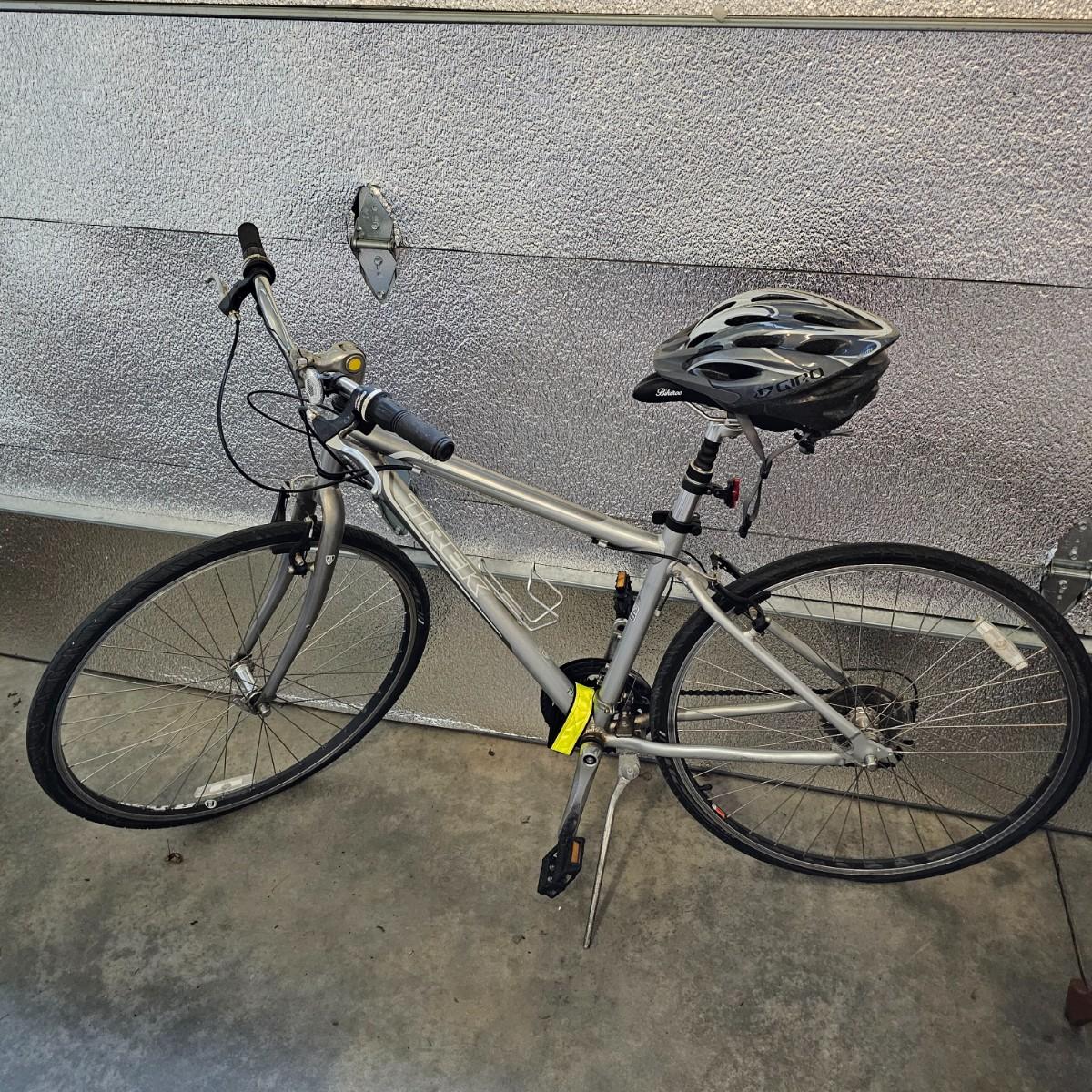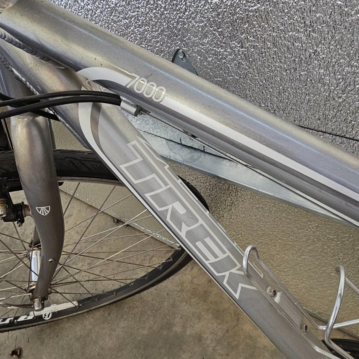 Silver 26" Trek brand model 7000 21 speed bicycle. Side pull brakes, twist grip gear selectors, Shimano Tourney gears and a water bottle mount, plus a kickstand. Adjustable seat post with a Bikeroo split seat and a Giro adult helmet with visor. Tires are currently flat. See photos for details.