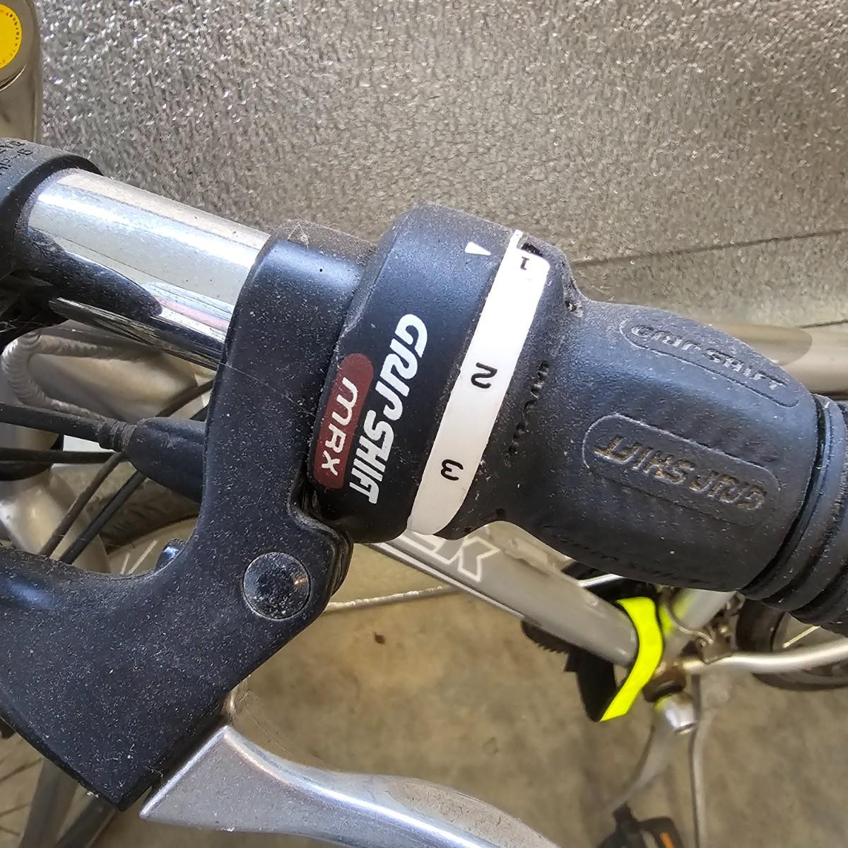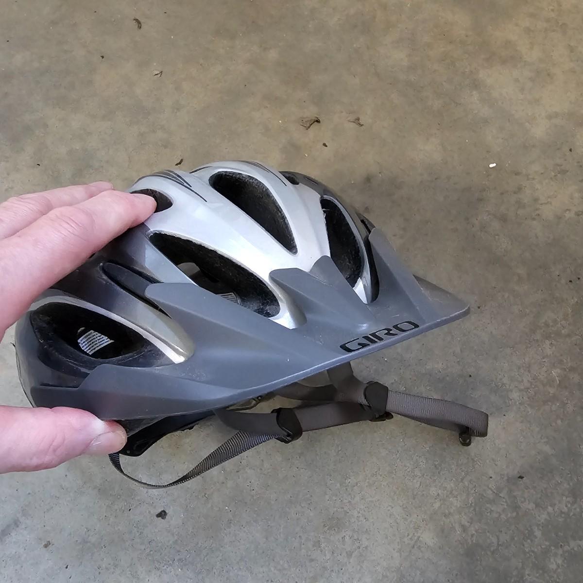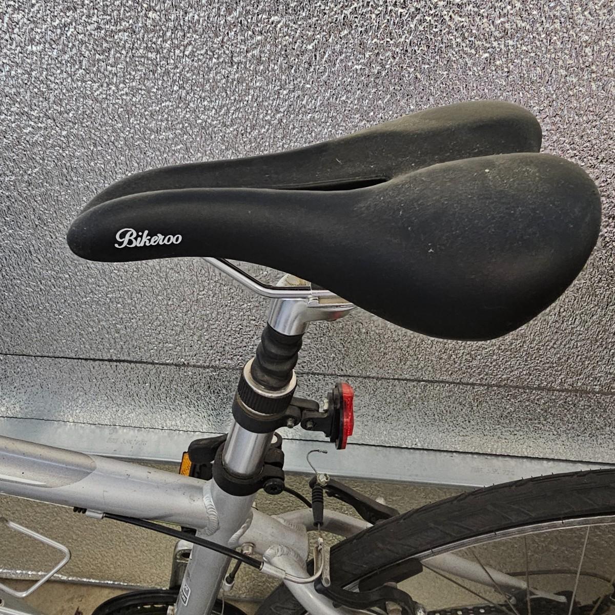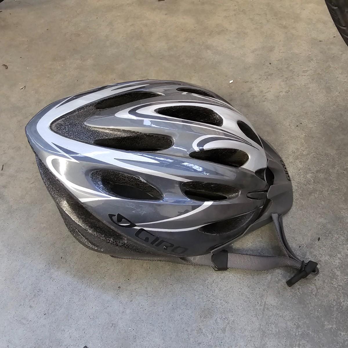Silver 26" Trek brand model 7000 21 speed bicycle. Side pull brakes, twist grip gear selectors, Shimano Tourney gears and a water bottle mount, plus a kickstand. Adjustable seat post with a Bikeroo split seat and a Giro adult helmet with visor. Tires are currently flat. See photos for details.