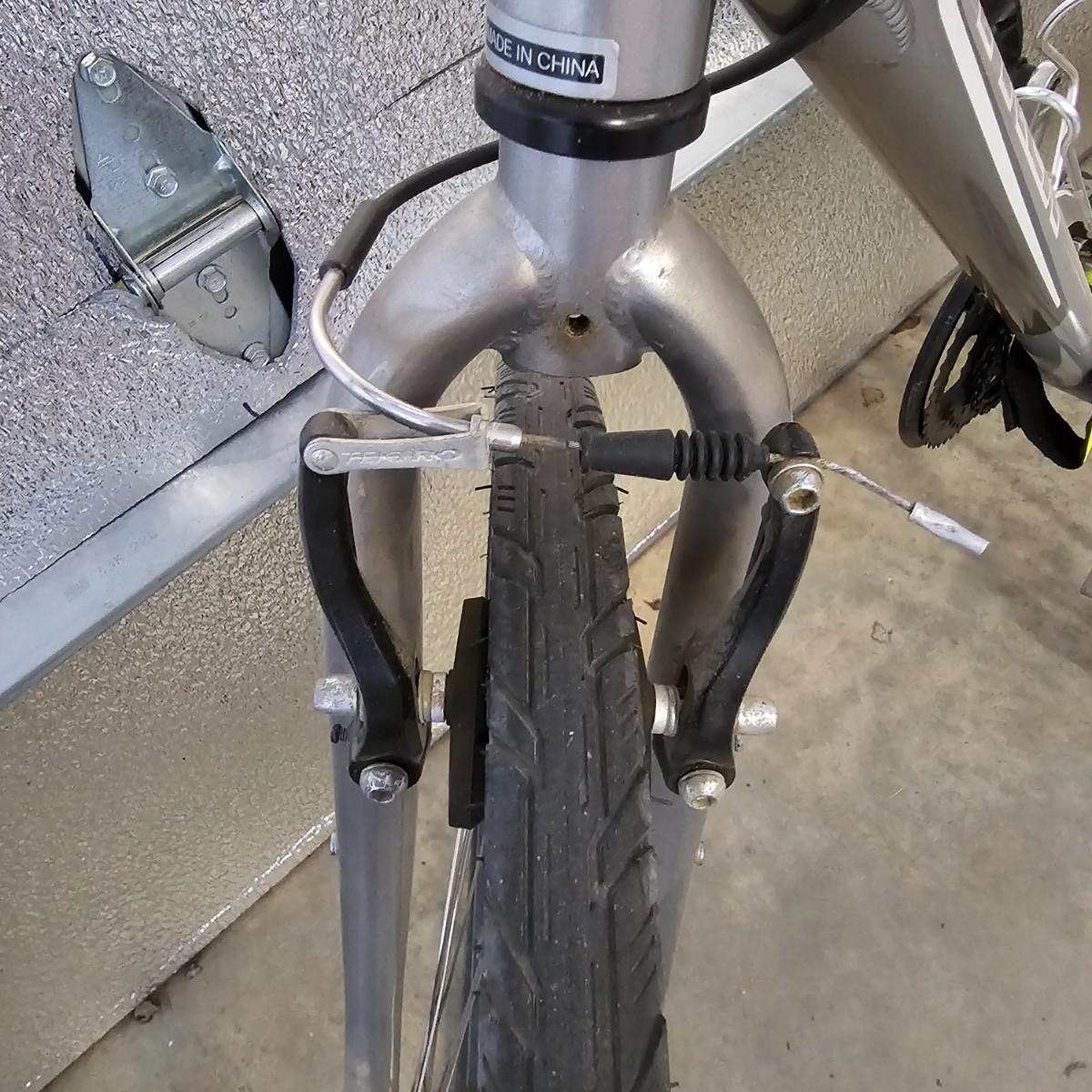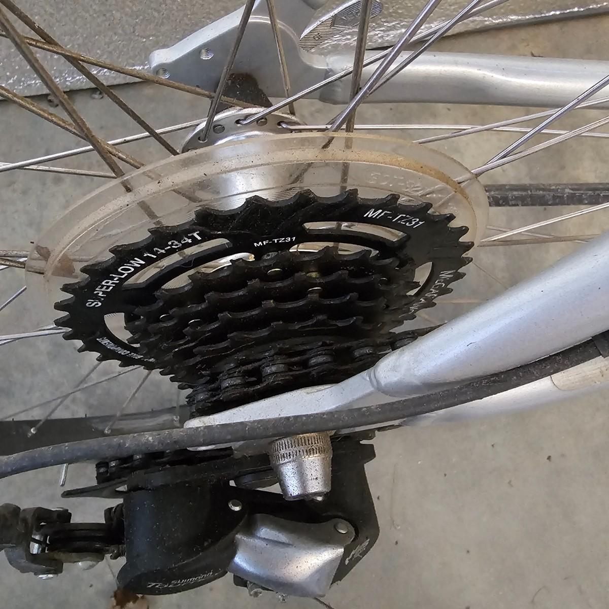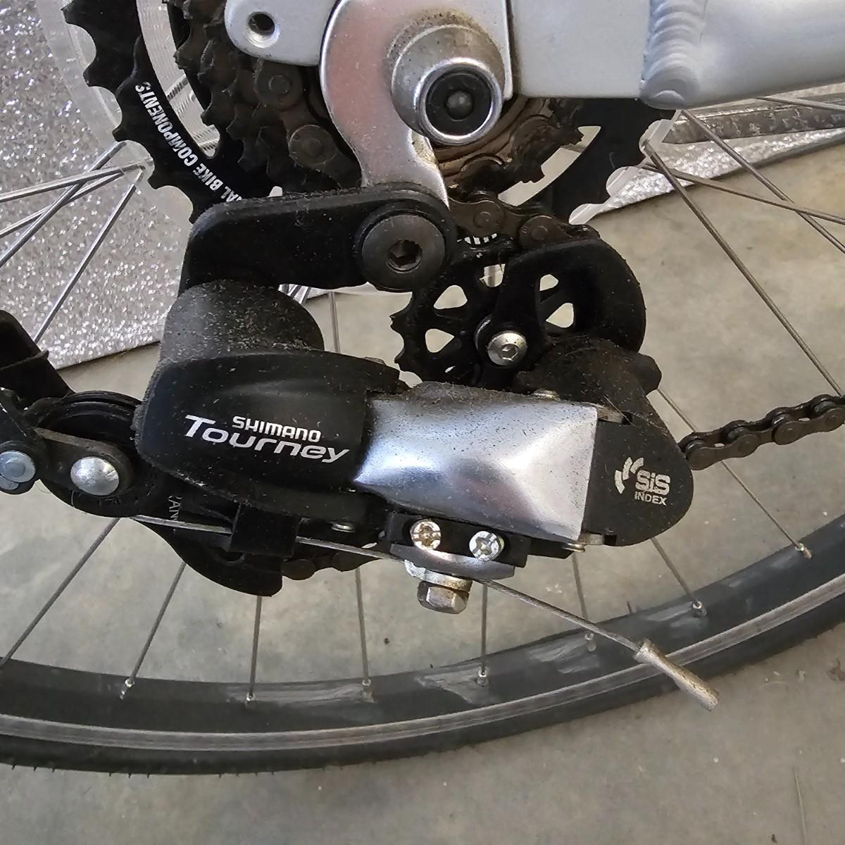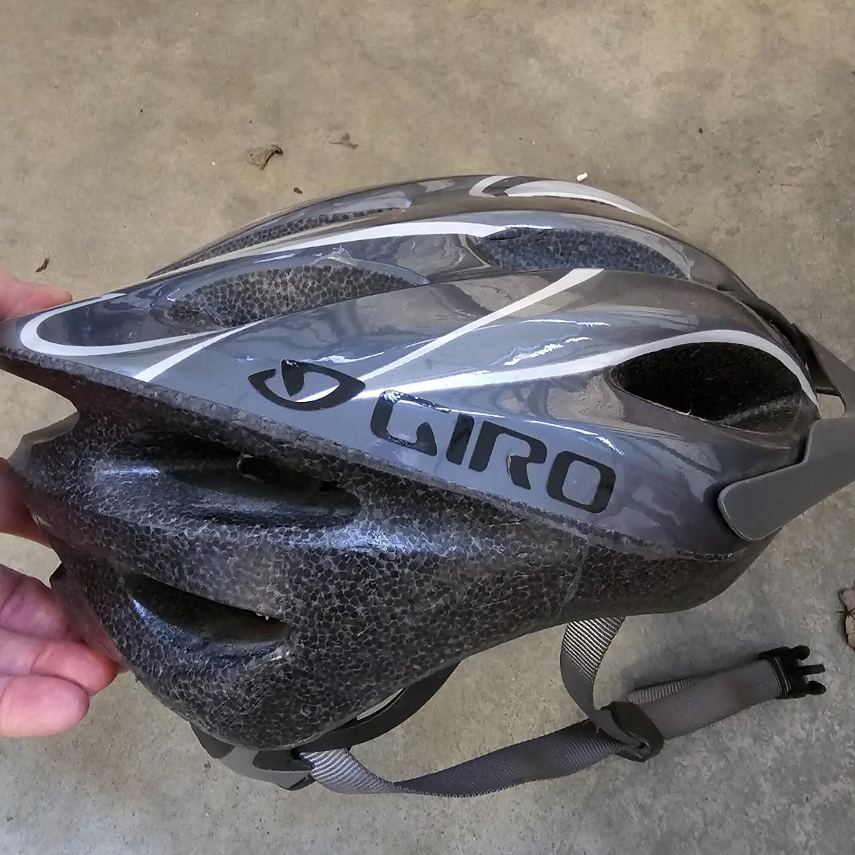 Silver 26" Trek brand model 7000 21 speed bicycle. Side pull brakes, twist grip gear selectors, Shimano Tourney gears and a water bottle mount, plus a kickstand. Adjustable seat post with a Bikeroo split seat and a Giro adult helmet with visor. Tires are currently flat. See photos for details.