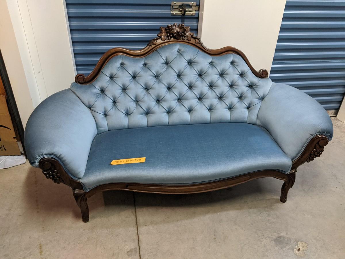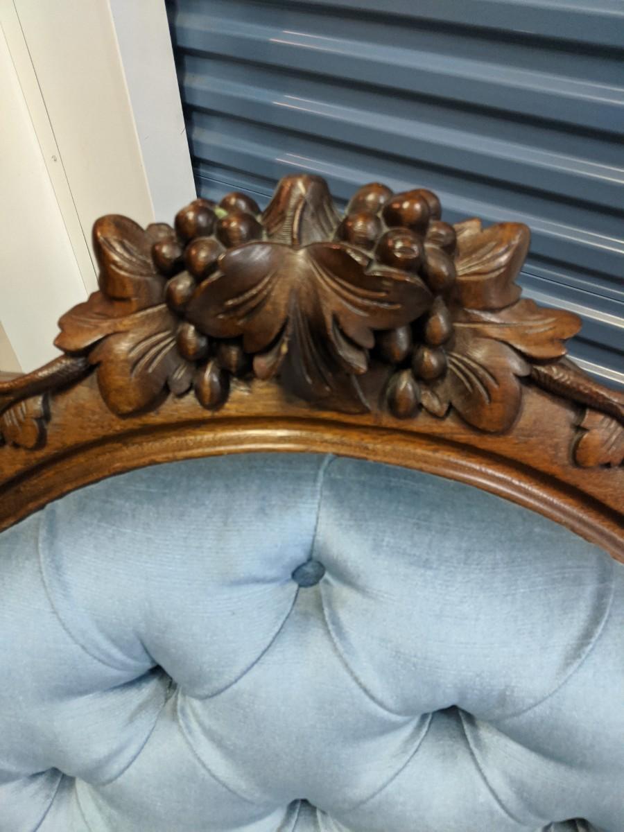 Camelback, tufted sofa and features a carved grape vine motif on the frame.