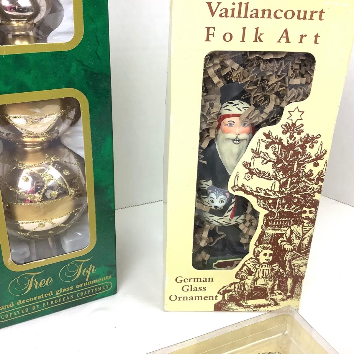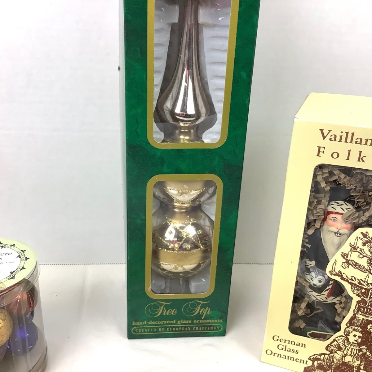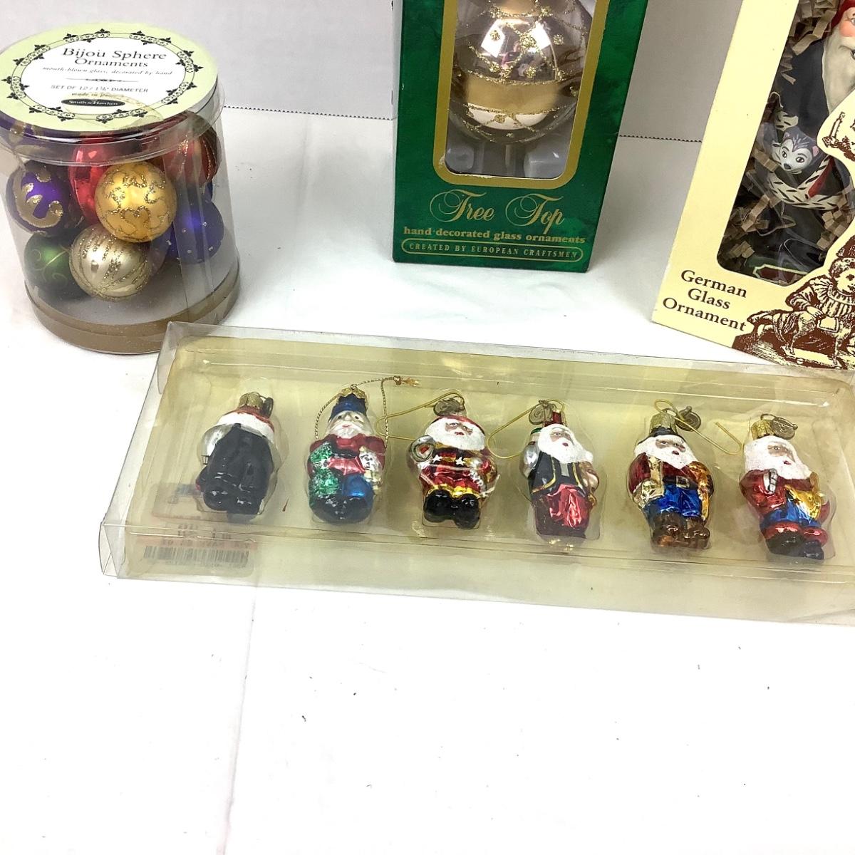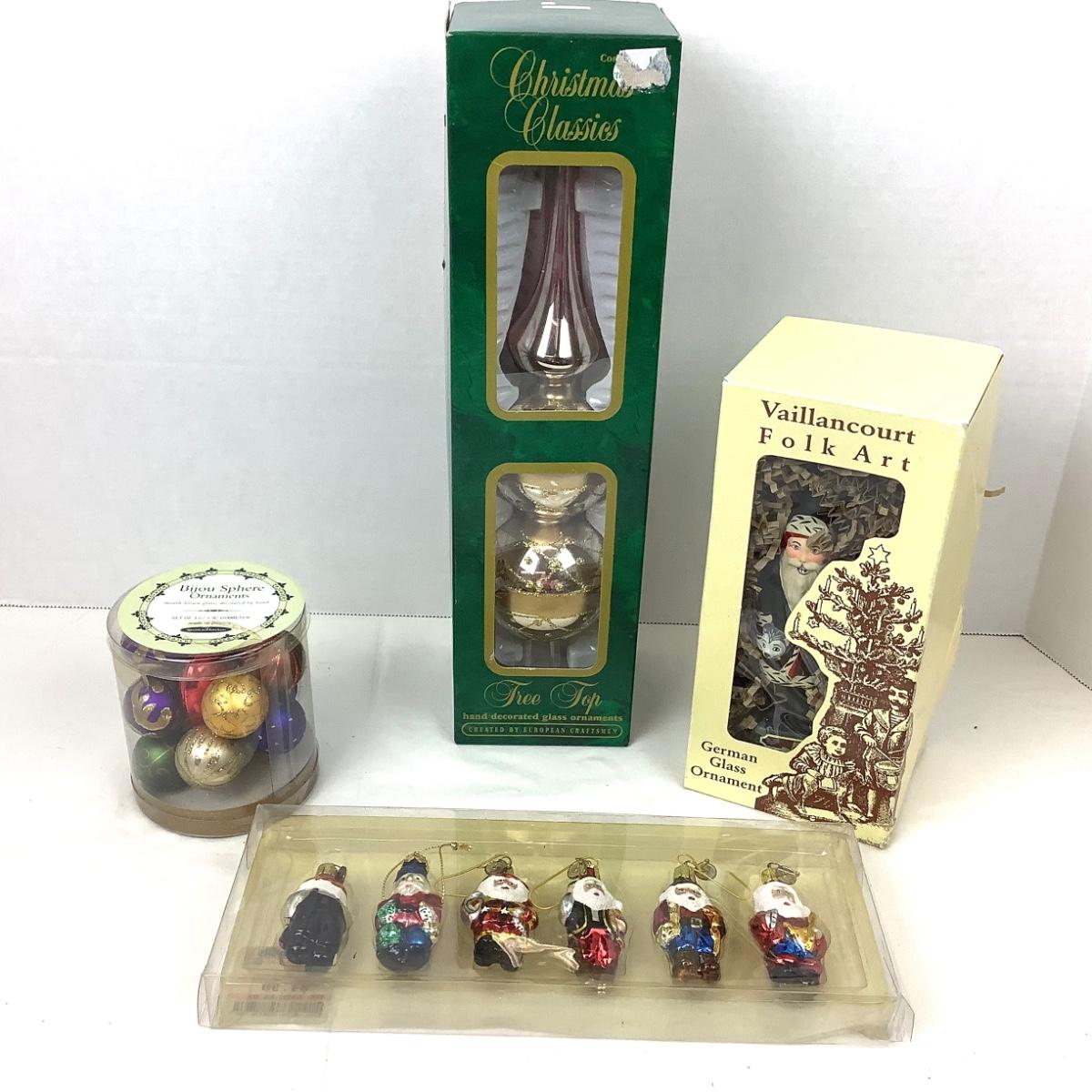The lot contains-Christmas classics tree topper 12", Vaillancourt folk art Santa made of German glass 6" x 2", Smith & Hawken multicolored metallic balls, and KSA miniature glass santa ornaments.