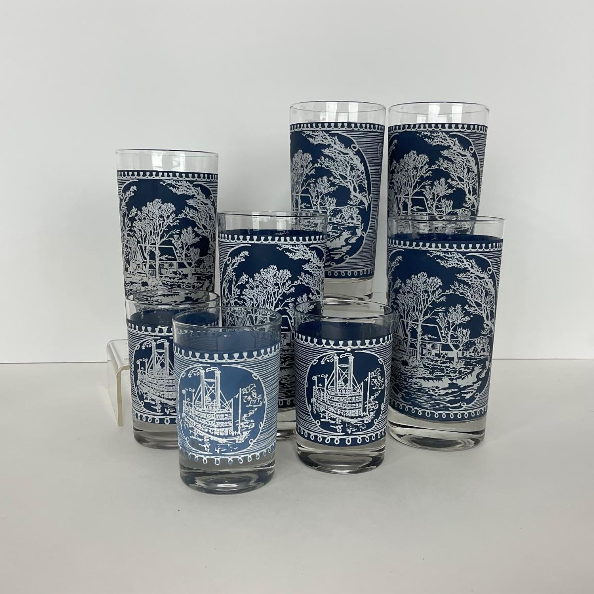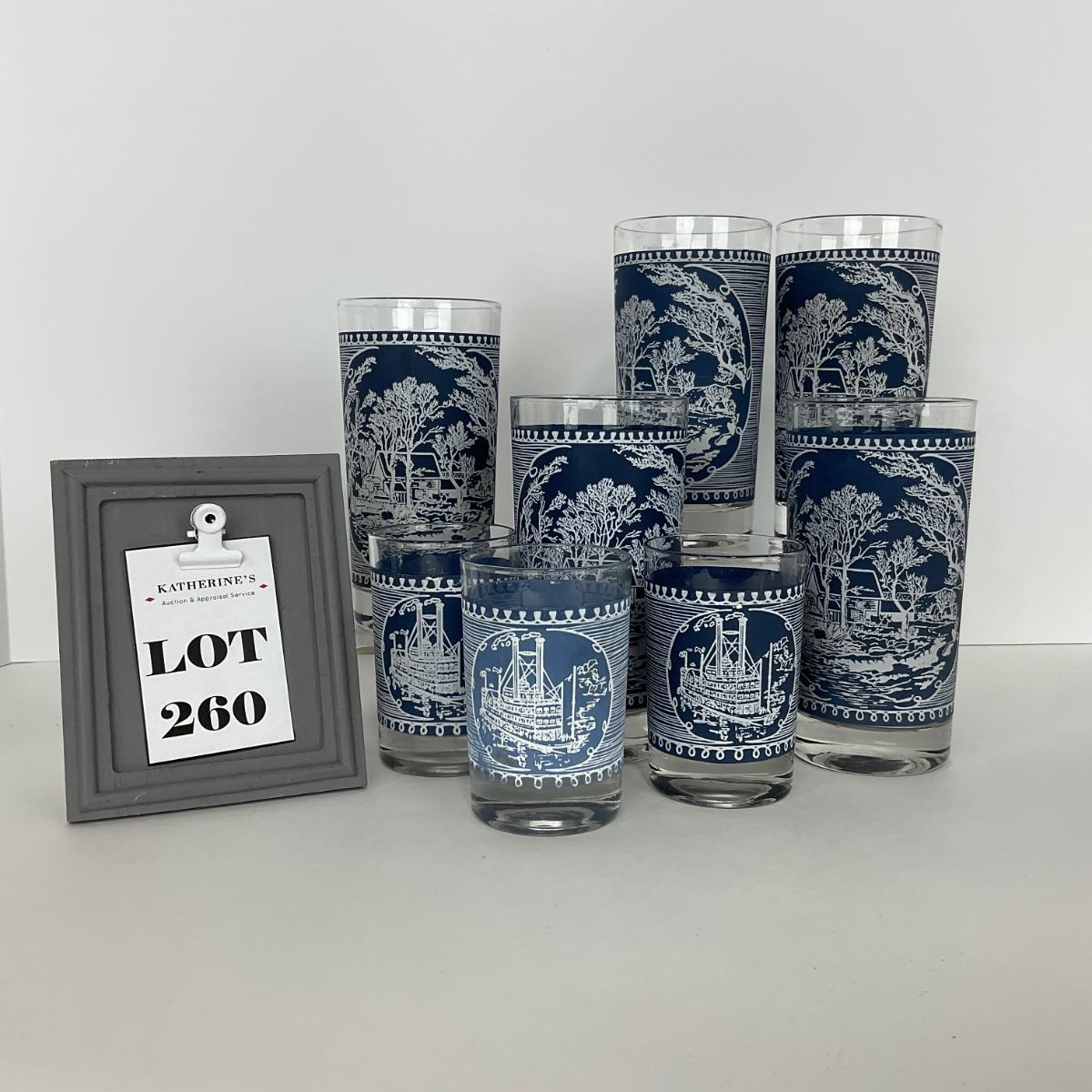 Eight Currier & Ives glasses including five Old mill blue drinking glasses and three small juice glasses. Please see photos for details and condition. ::: Shipping is available on this lot. If you require shipping you must let us know at the close of the auction. We will coordinate with you after the item has been won. Shipping fees will include insurance up to or exceeding the value of all items being mailed. If you have any questions regarding this lot please contact the auctioneer either via this website, by direct email or by phone. PICK UP TIMES and other important information can be found in the TERMS and DESCRIPTION of the auction. Please take a look for pertinent information. Thanks!