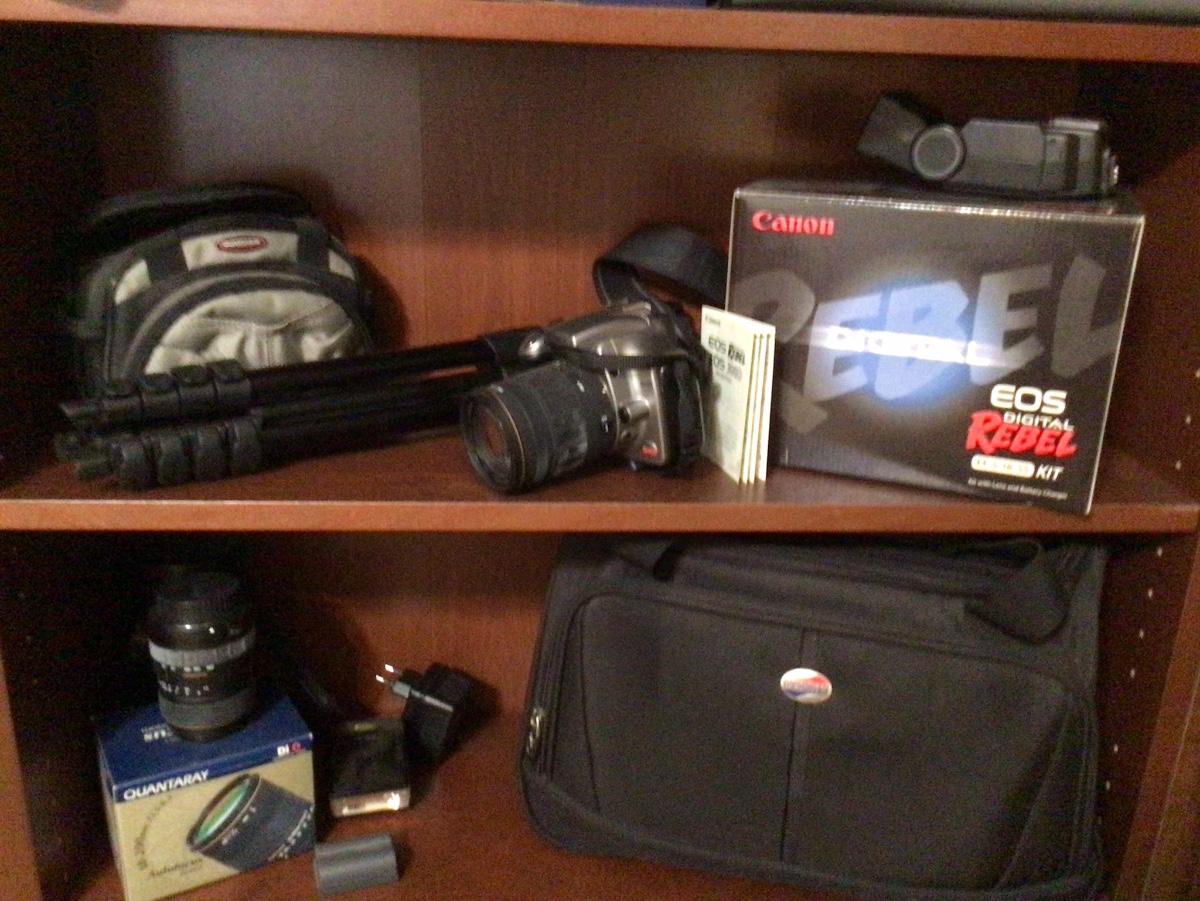 Canon rebel and assorted camera, lens, bags, tripod, etc.