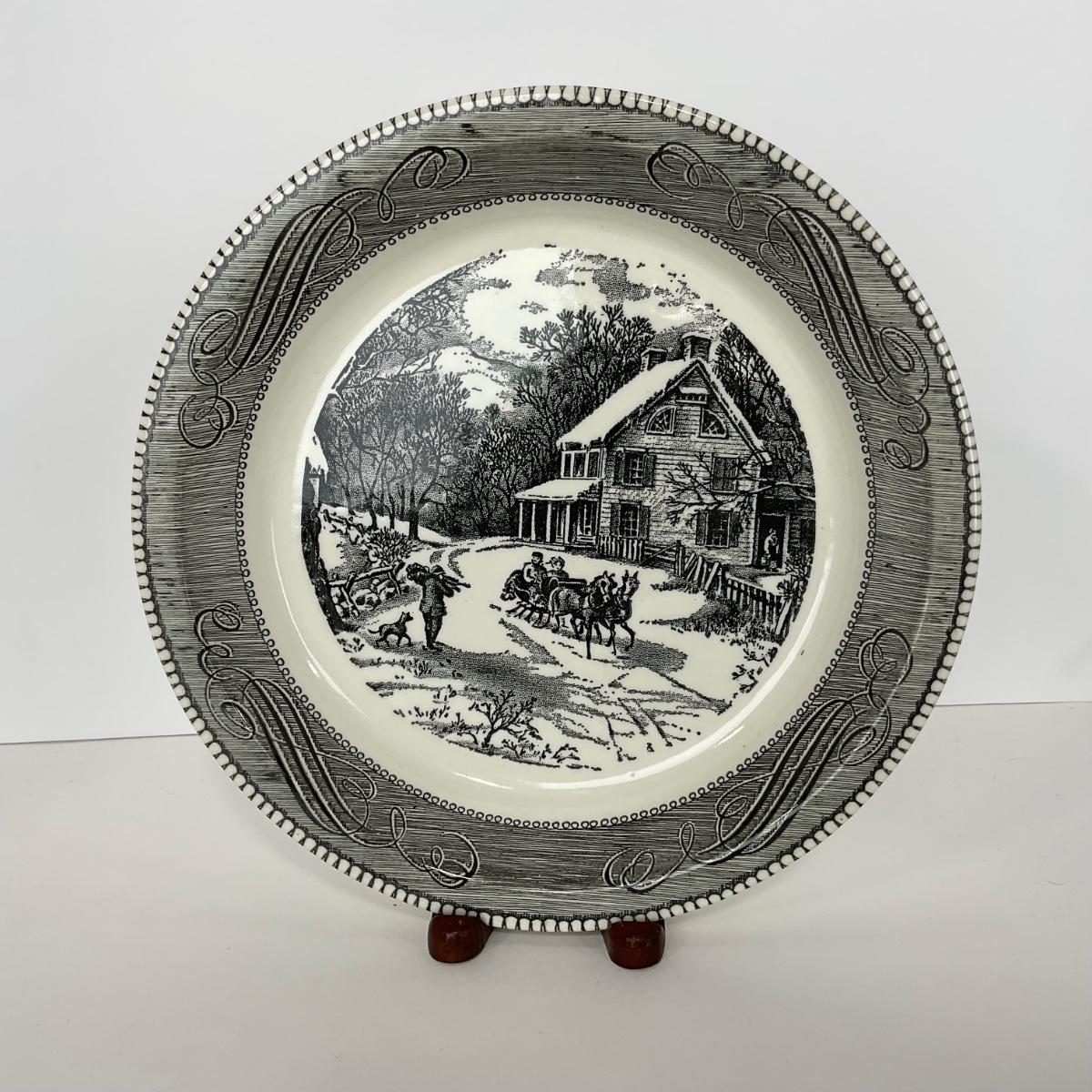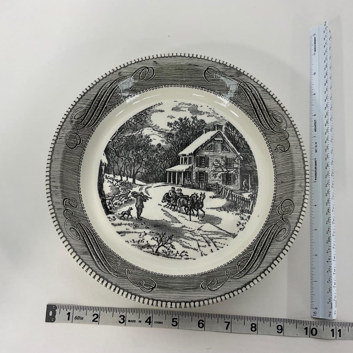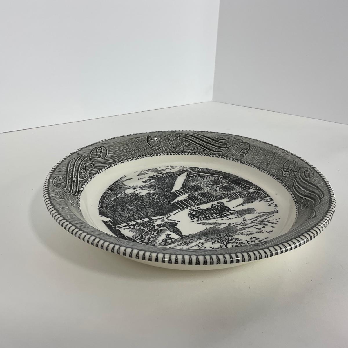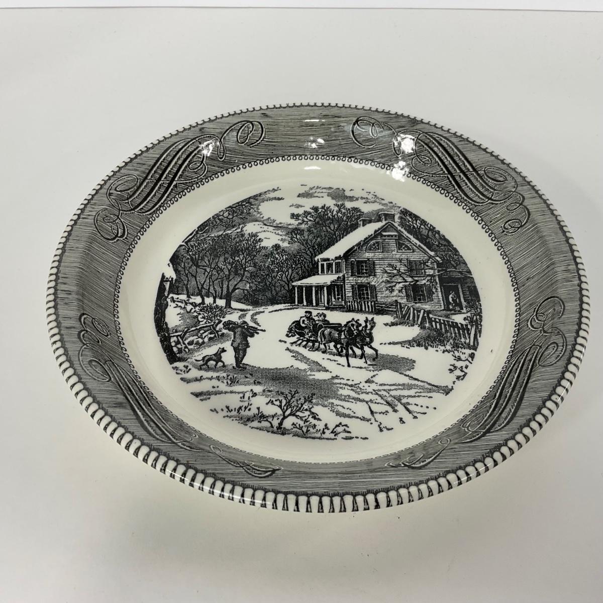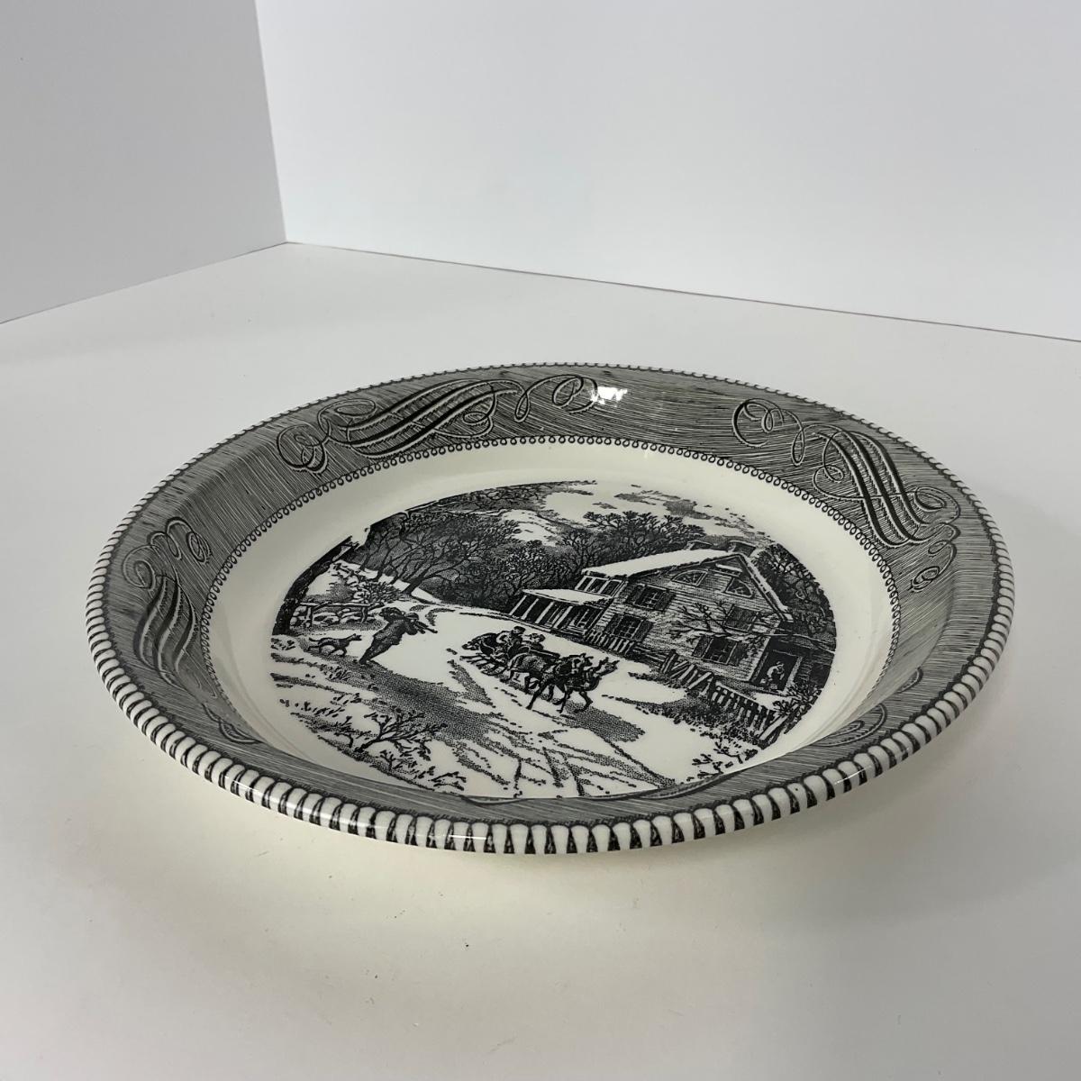 One Royal China Currier & Ives large serving plate black grey and white. Please see photos for details and condition. ::: Shipping is available on this lot. If you require shipping you must let us know at the close of the auction. We will coordinate with you after the item has been won. Shipping fees will include insurance up to or exceeding the value of all items being mailed. If you have any questions regarding this lot please contact the auctioneer either via this website, by direct email or by phone. PICK UP TIMES and other important information can be found in the TERMS and DESCRIPTION of the auction. Please take a look for pertinent information. Thanks!