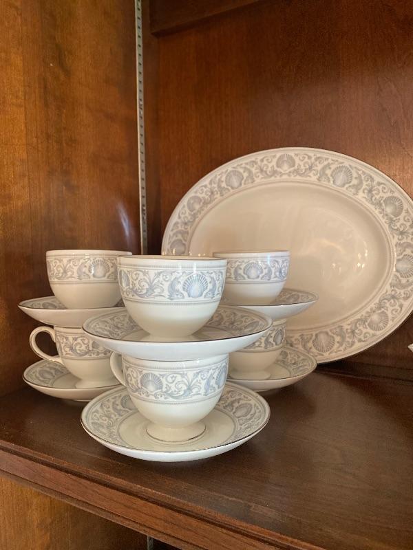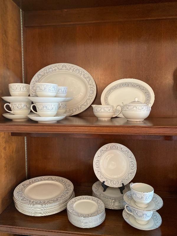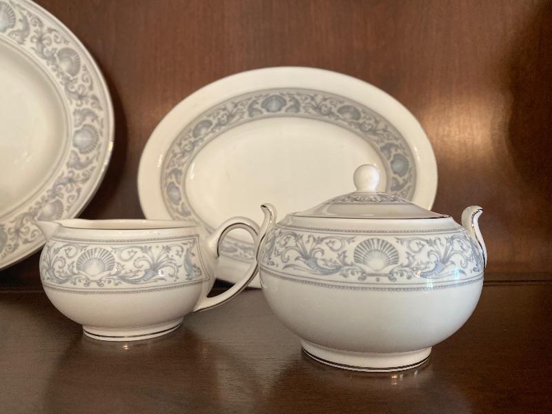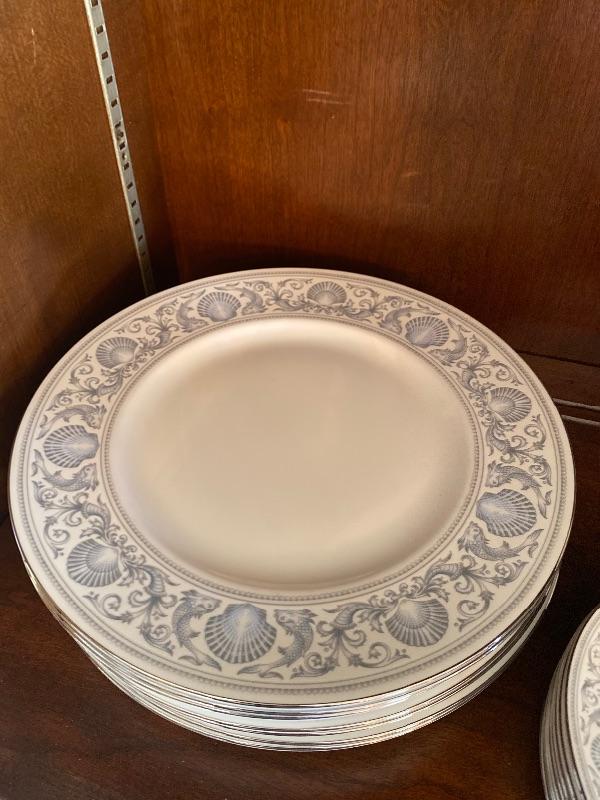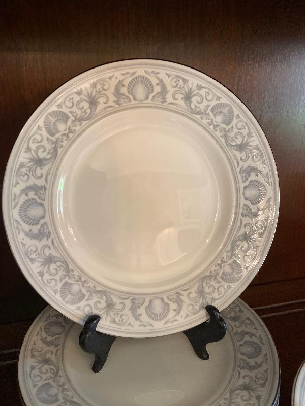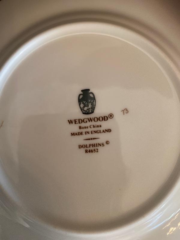 44 piece set of Wedgewood bone china patter name is dolphins there is a large oval open vegetable measuring 10“ x 1.5“ deep, 2-oval platter measuring 14“, 11“, creamer, sugar, 8-5 piece place settings the dinner plate measures 10.5 inches