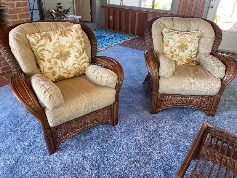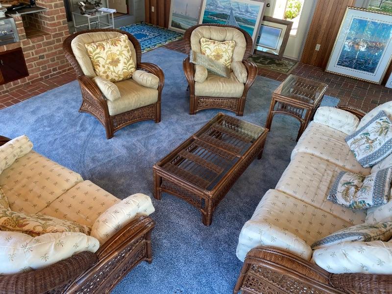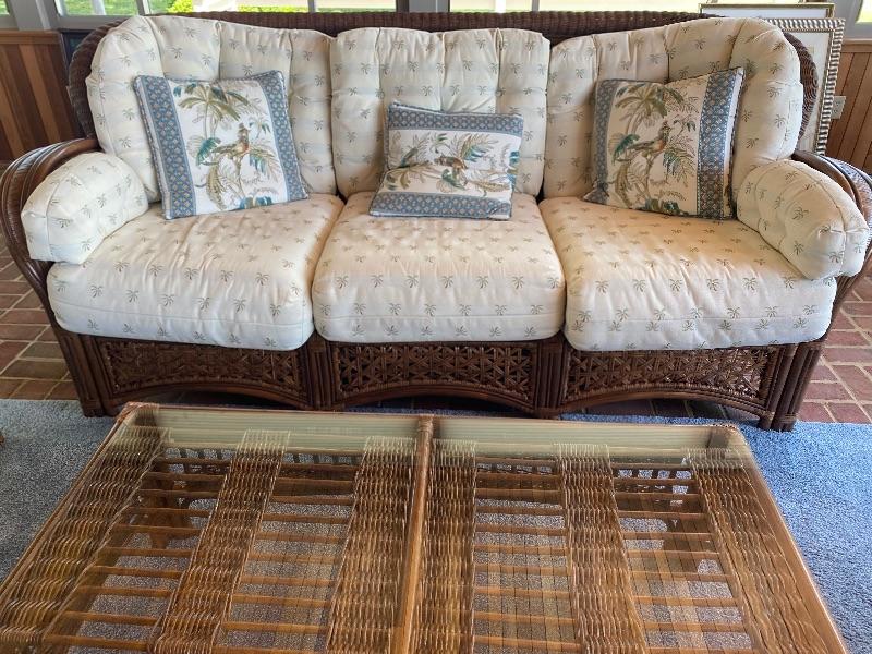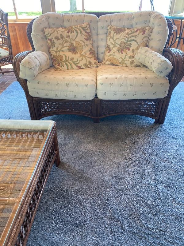 6 pc set of Rattan Furniture set by Benchcraft The sofa measures 40 inches deep by 89 inches long, the loveseat measures 40 inches deep by 62 inches long, with two arm chairs measuring 38 inches wide by 40 inches deep, the coffee table has a glass top it measures 15.5 inches tall by 23.5 inches wide by 28.5 inches long, the end table has a glass top and measures 27“ x 20“ x 22.5“ tall