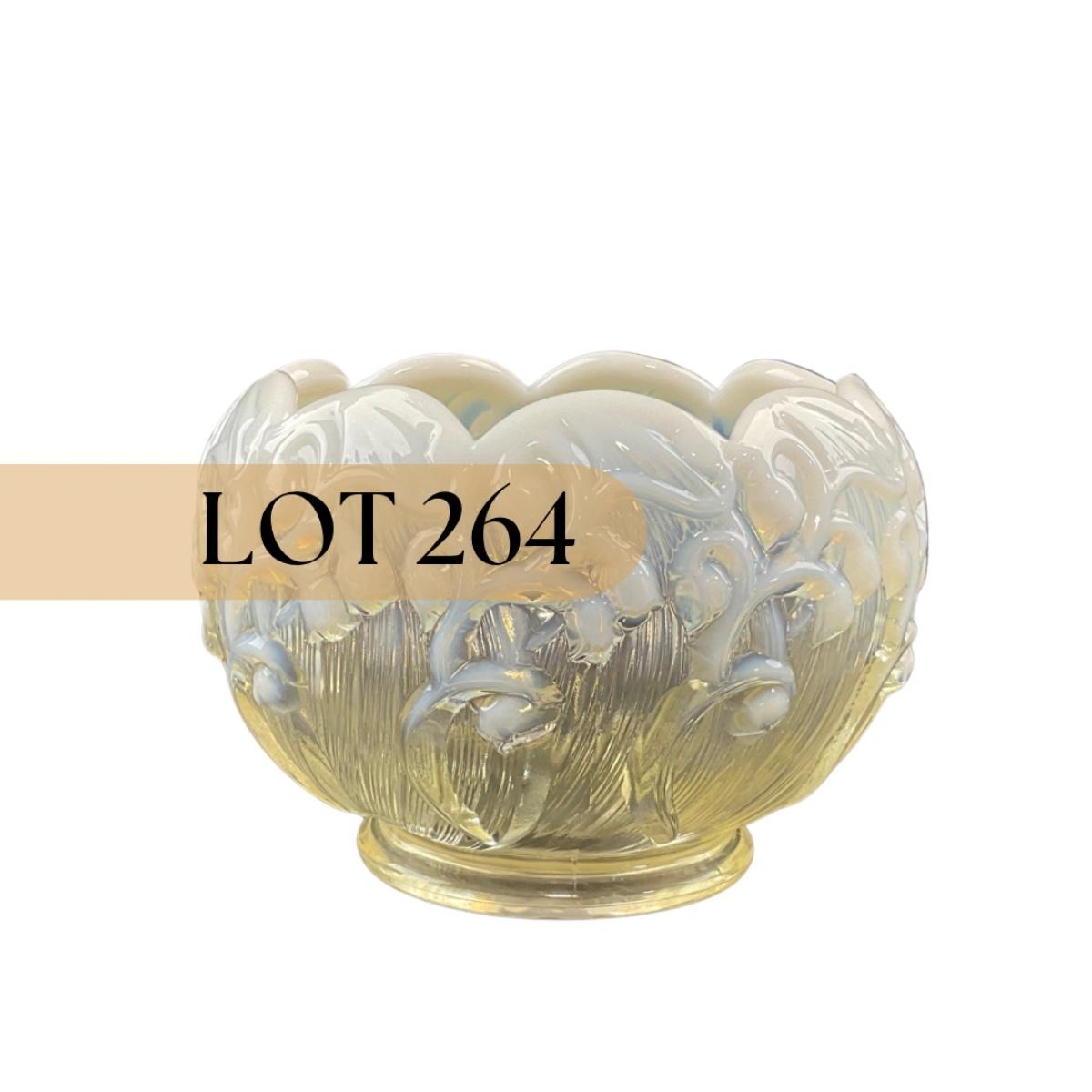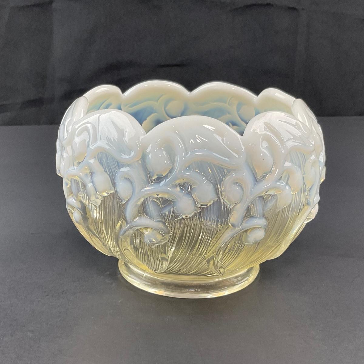 One marked Fenton opalescent white lily of the valley bowl. This piece has no damage, and appears to be in great shape with no visable chips, cracks, or broken pieces. Please see photos for details and condition. Any condition statement is given as a courtesy to a client, is an opinion, and should not be treated as a statement of fact. Reference to condition written, oral or within a condition report shall not be regarded as a full account of condition and may not include all defects, alterations, or restorations. Absence of a condition report does not imply a lot is flawless or lacking imperfections or damage. Katherine’s Auction & Appraisal Service shall have no responsibility for any error or omission. Returns shall not be accepted on the basis of condition. ::: Shipping is available on this lot. If you require shipping you must let us know at the close of the auction. We will coordinate with you after the item has been won. Shipping fees will include insurance up to or exceeding the value of all items being mailed. If you have any questions regarding this lot please contact the auctioneer either via this website, by direct email or by phone. PICK UP TIMES and other important information can be found in the TERMS and DESCRIPTION of the auction. Please take a look for pertinent information. Thanks!
