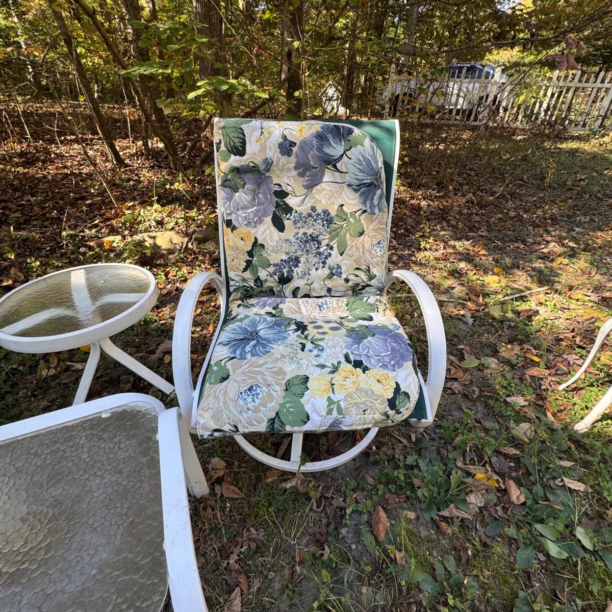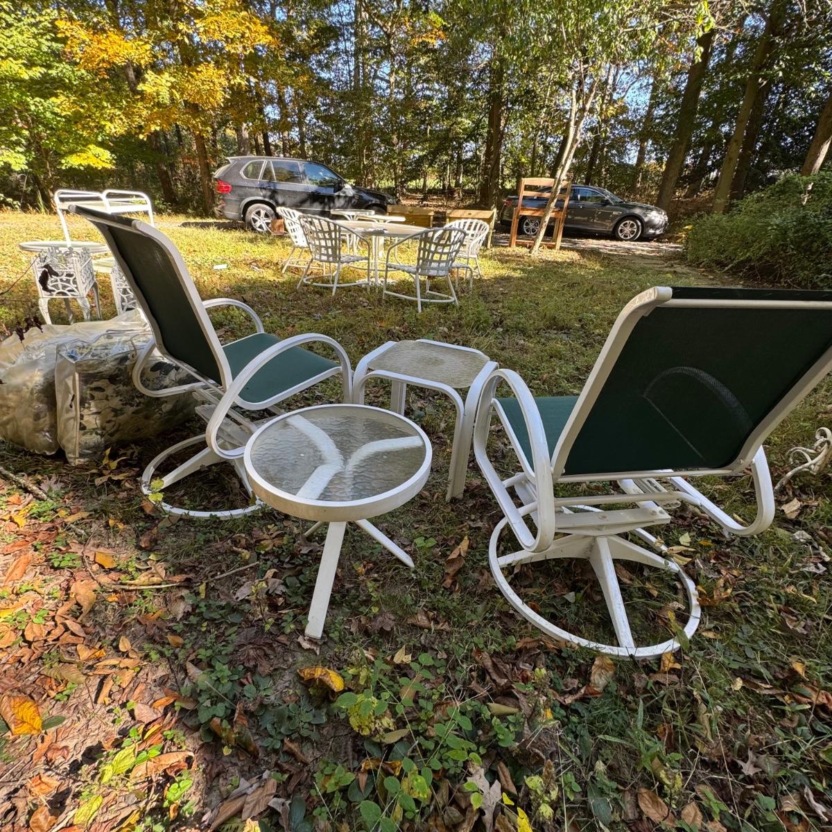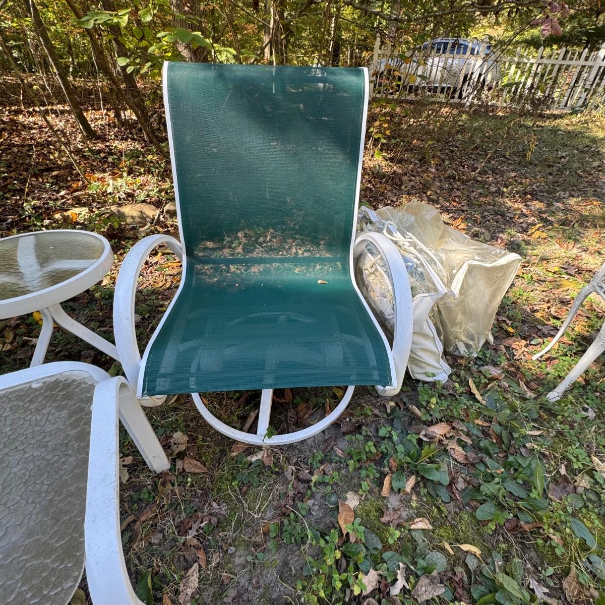 Back 36”H x 24”W x 17.5” seat height x 20” seat width x 17.5” seat depth. Both chairs come with floral seat cushions. Green nylon mesh material. Also included aluminum round and square tables. NOTE: qty (1) cushion is for a bench (not available) that folds for the seat and back and the other cushion is the traditional two pieces for the seat and back.