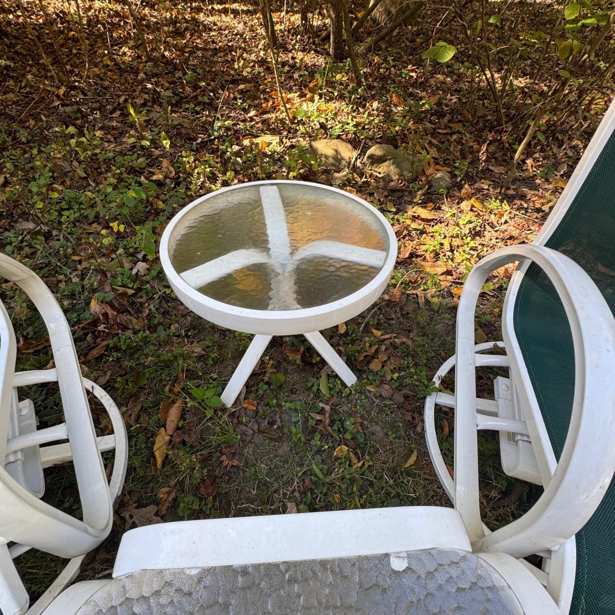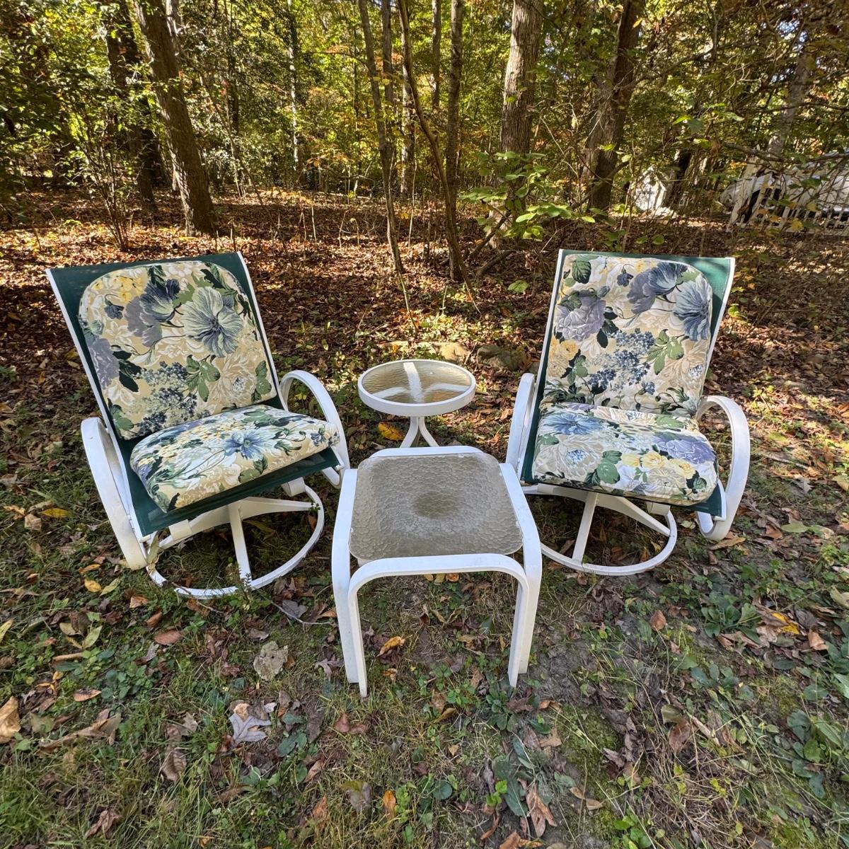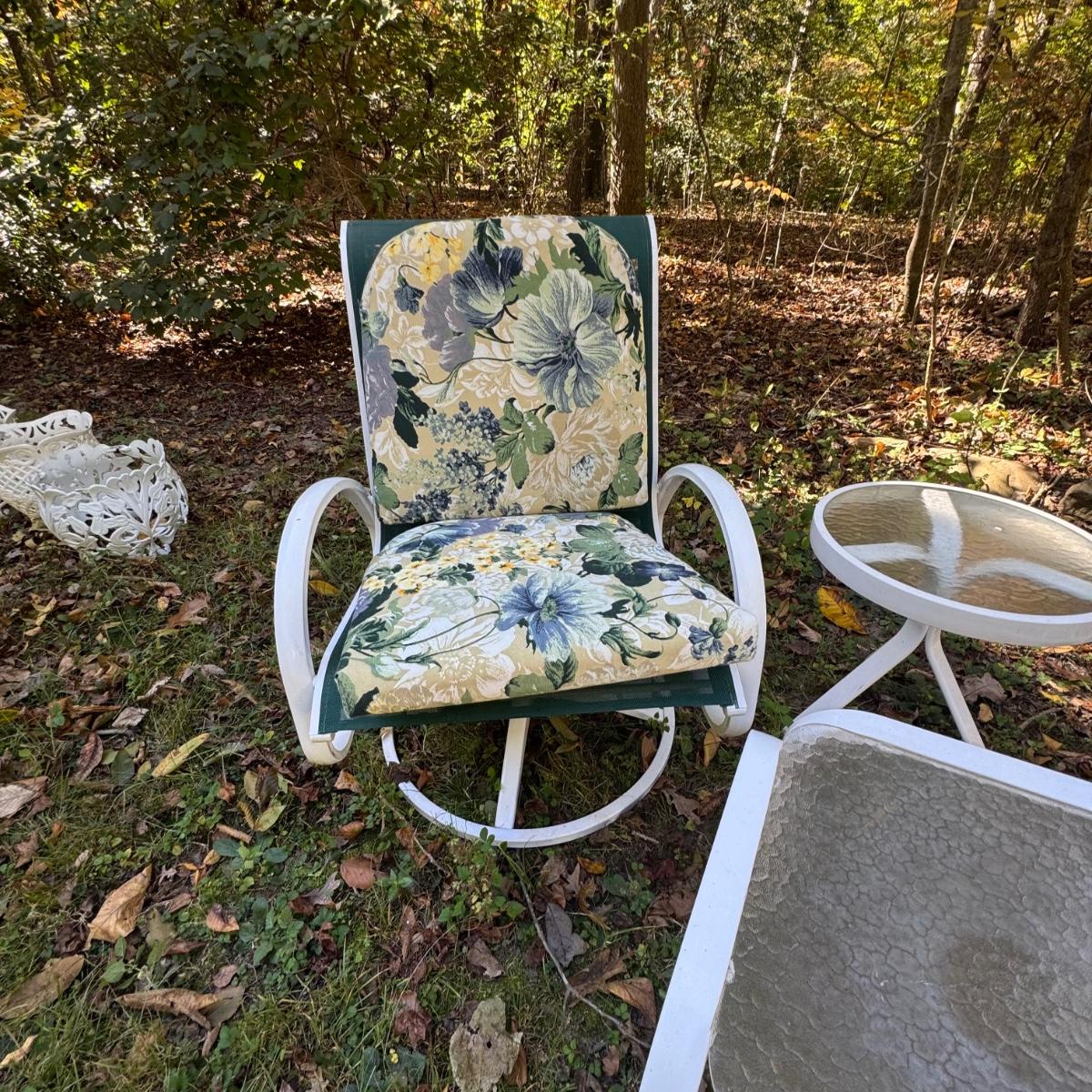 Back 36”H x 24”W x 17.5” seat height x 20” seat width x 17.5” seat depth. Both chairs come with floral seat cushions. Green nylon mesh material. Also included aluminum round and square tables. NOTE: qty (1) cushion is for a bench (not available) that folds for the seat and back and the other cushion is the traditional two pieces for the seat and back.