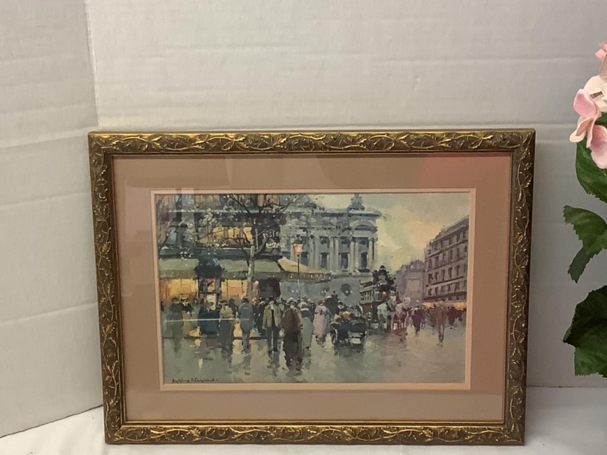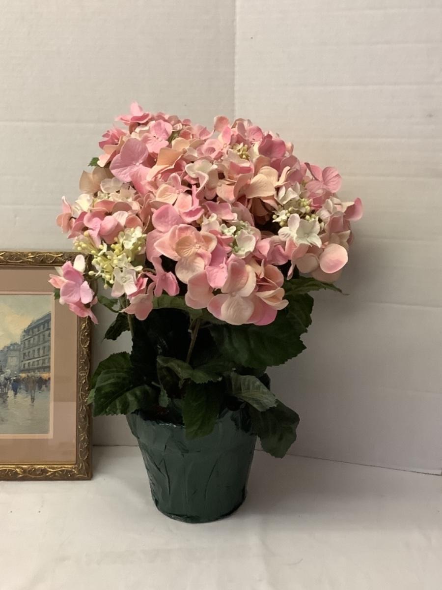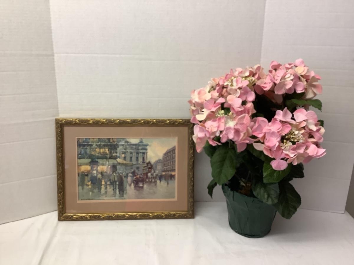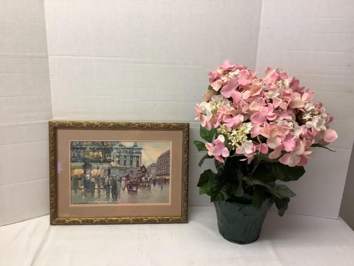 264. REVISED-Signed Framed Print of an Oil Painting by Antoine Blanchard  &. Faux Hydrangeas
