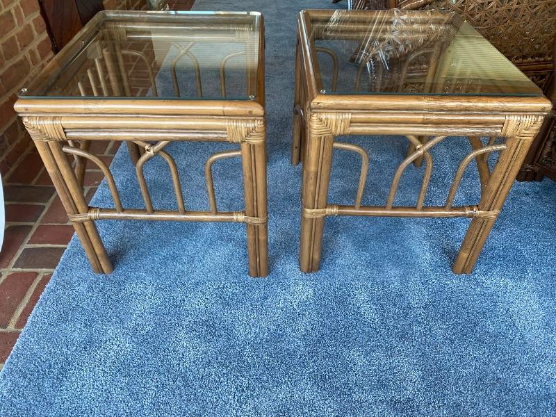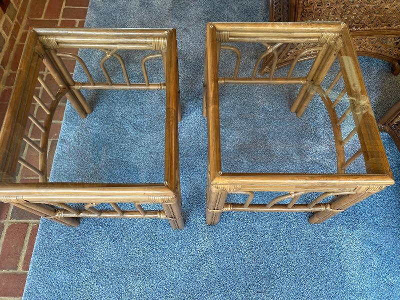 Pair of glass top rattan and tables measuring 20“ x 24“ x 23“ tall