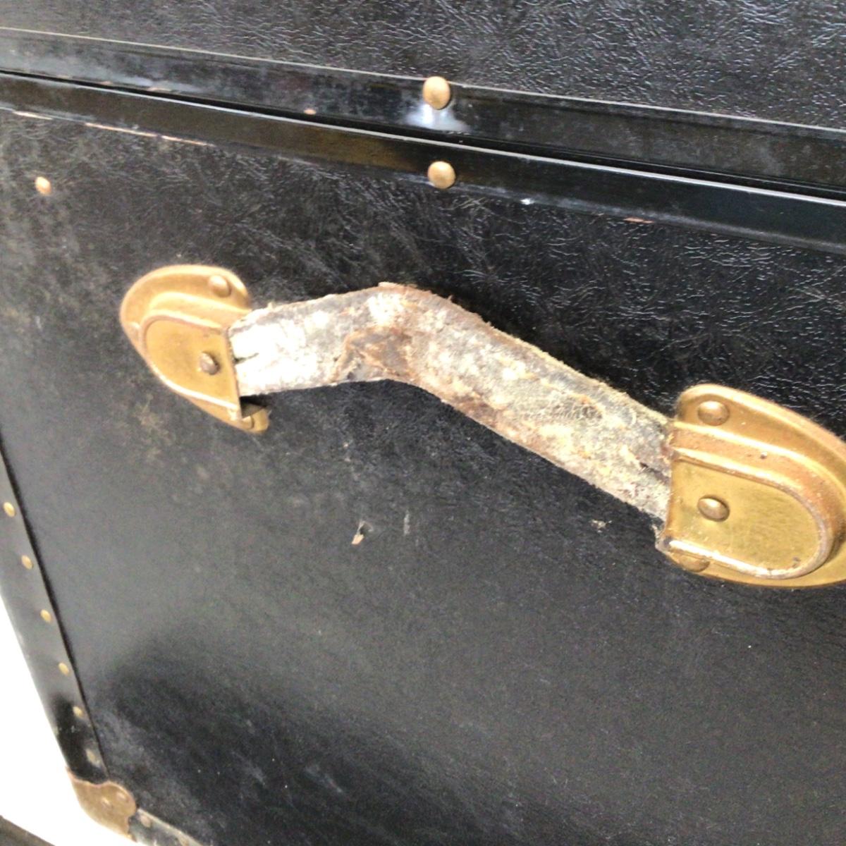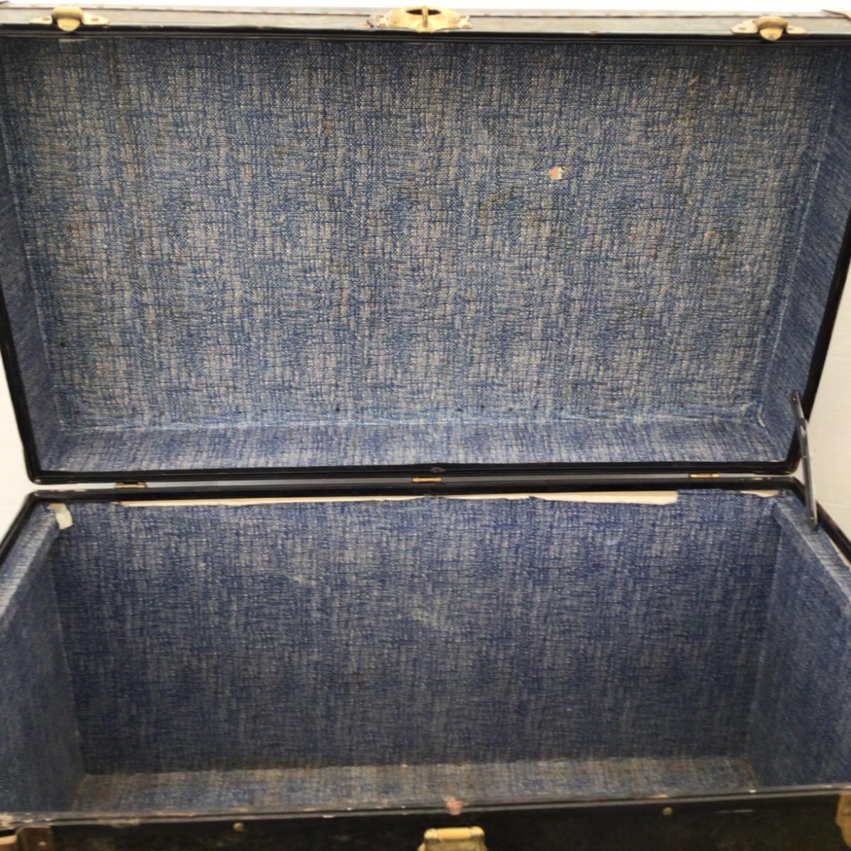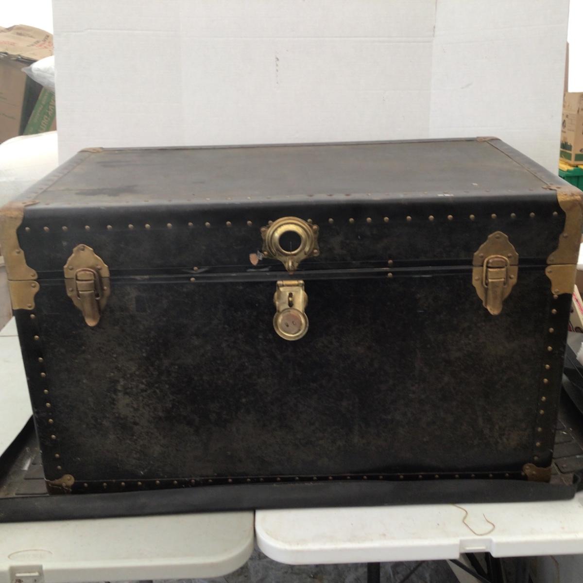Overall good condition for its age. Has both leather handles. Left leather handle appears it might break. Both left and right clamp down latches function. Has center lock, no key available. Inside trunk in good shape. See pics.