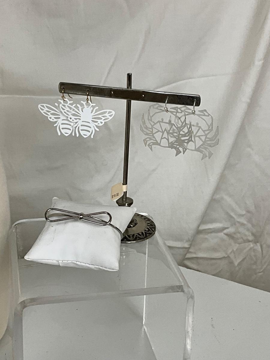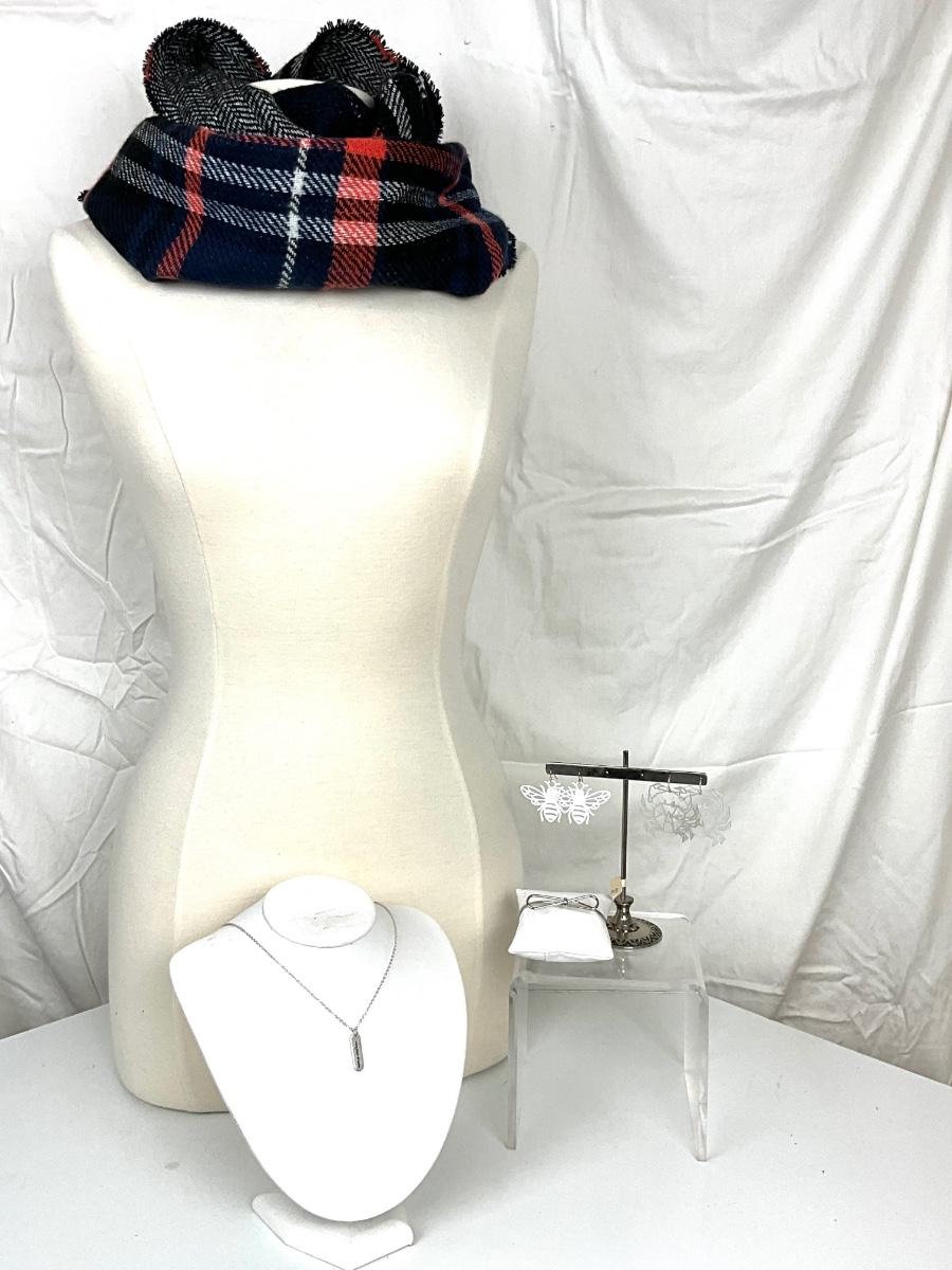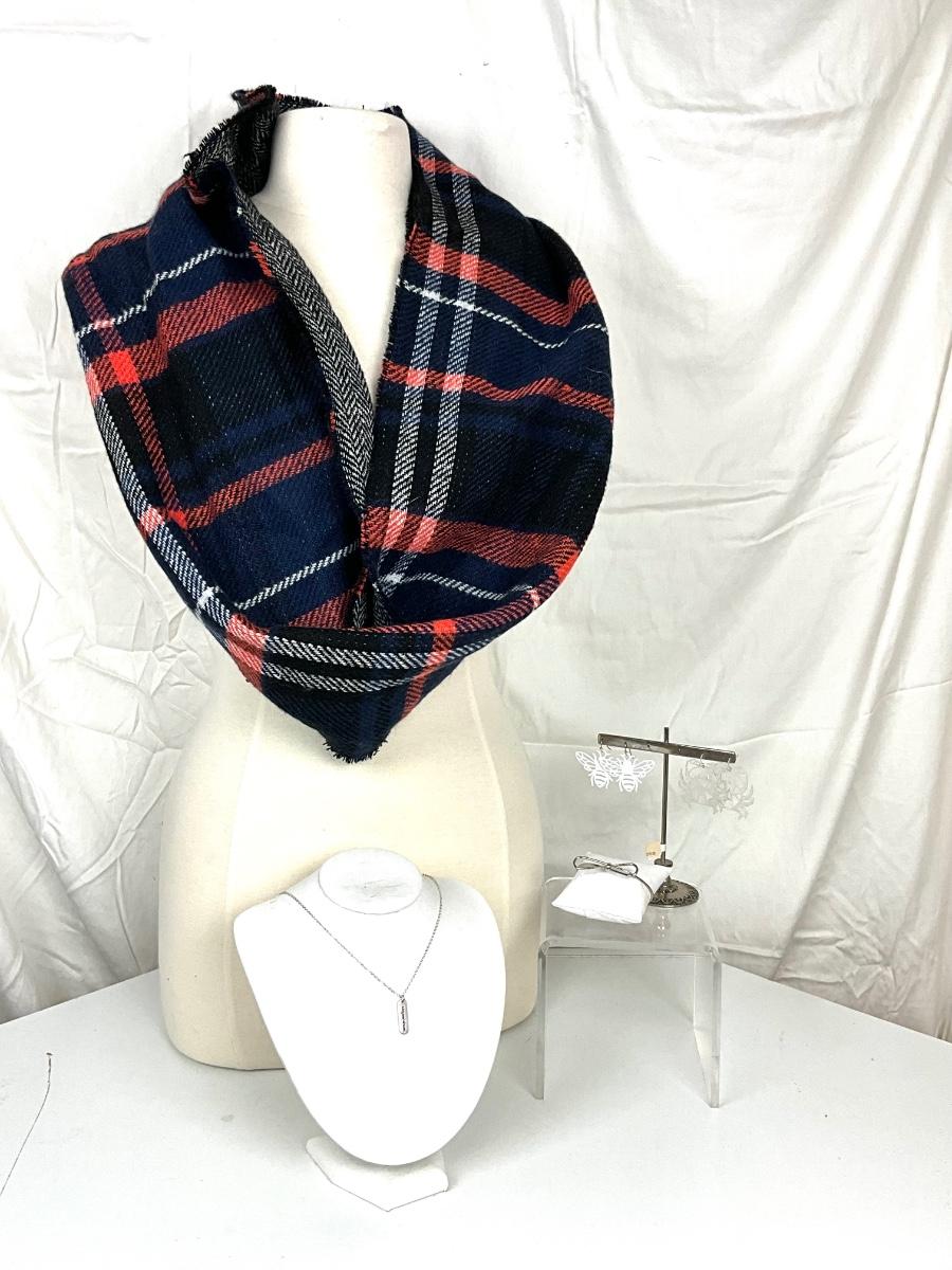 267 Tartan Plaid Wool Infinity Scarf, Necklace, Crab and Bee Earrings, with stand