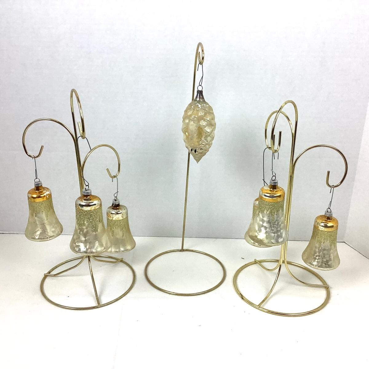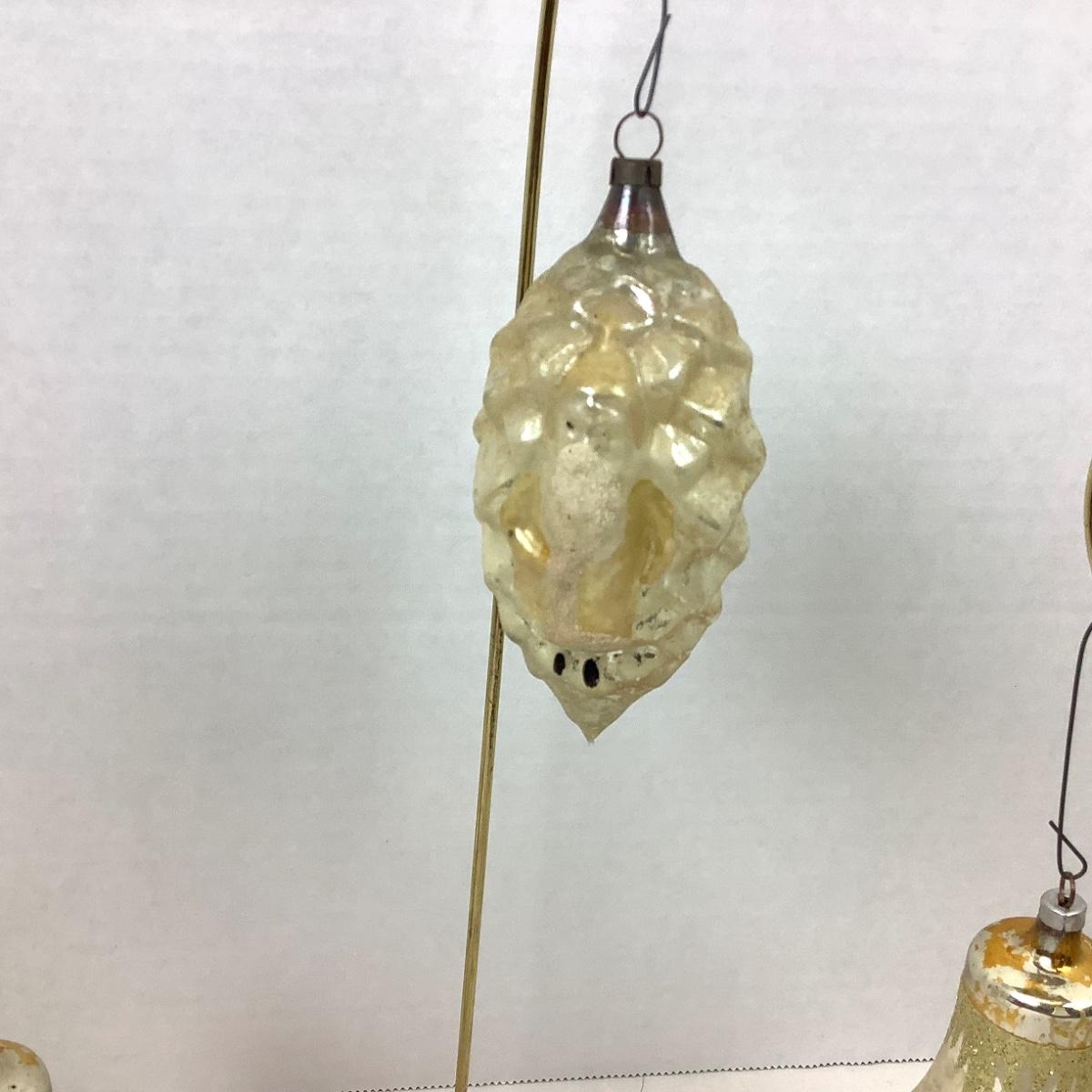 There are 6 vintage mercury glass bell ornaments 3" x 2", kugel pine cone with Santa face.