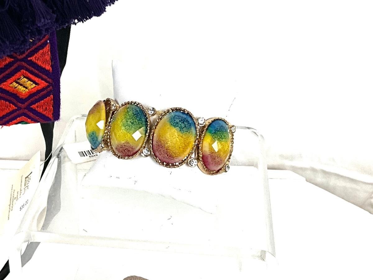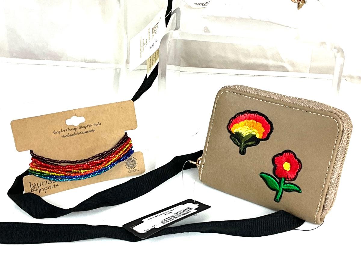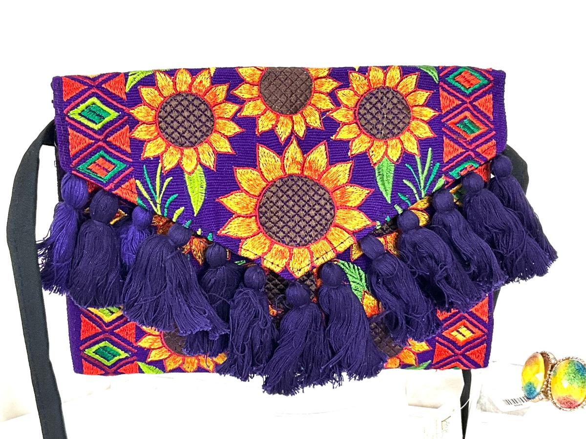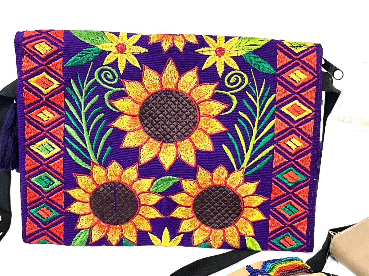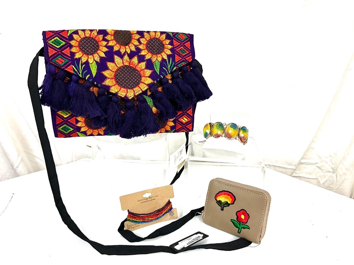 269 Embroidered Sunflower Purse with Rainbow Stretch Bracelets, and Floral Clutch