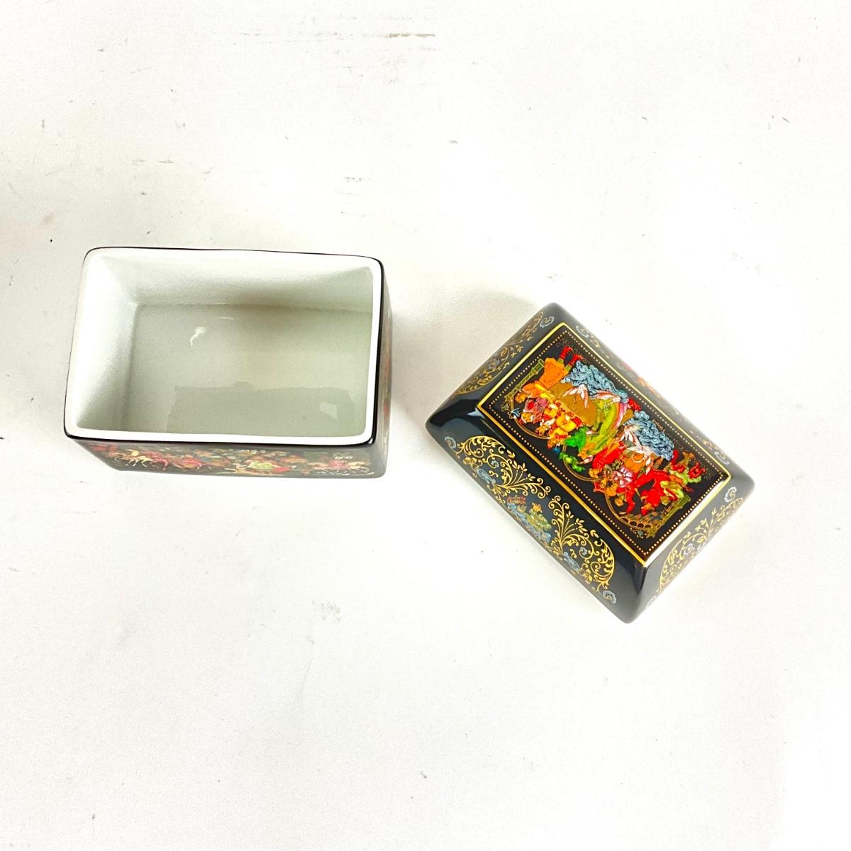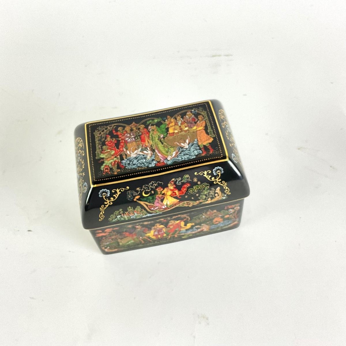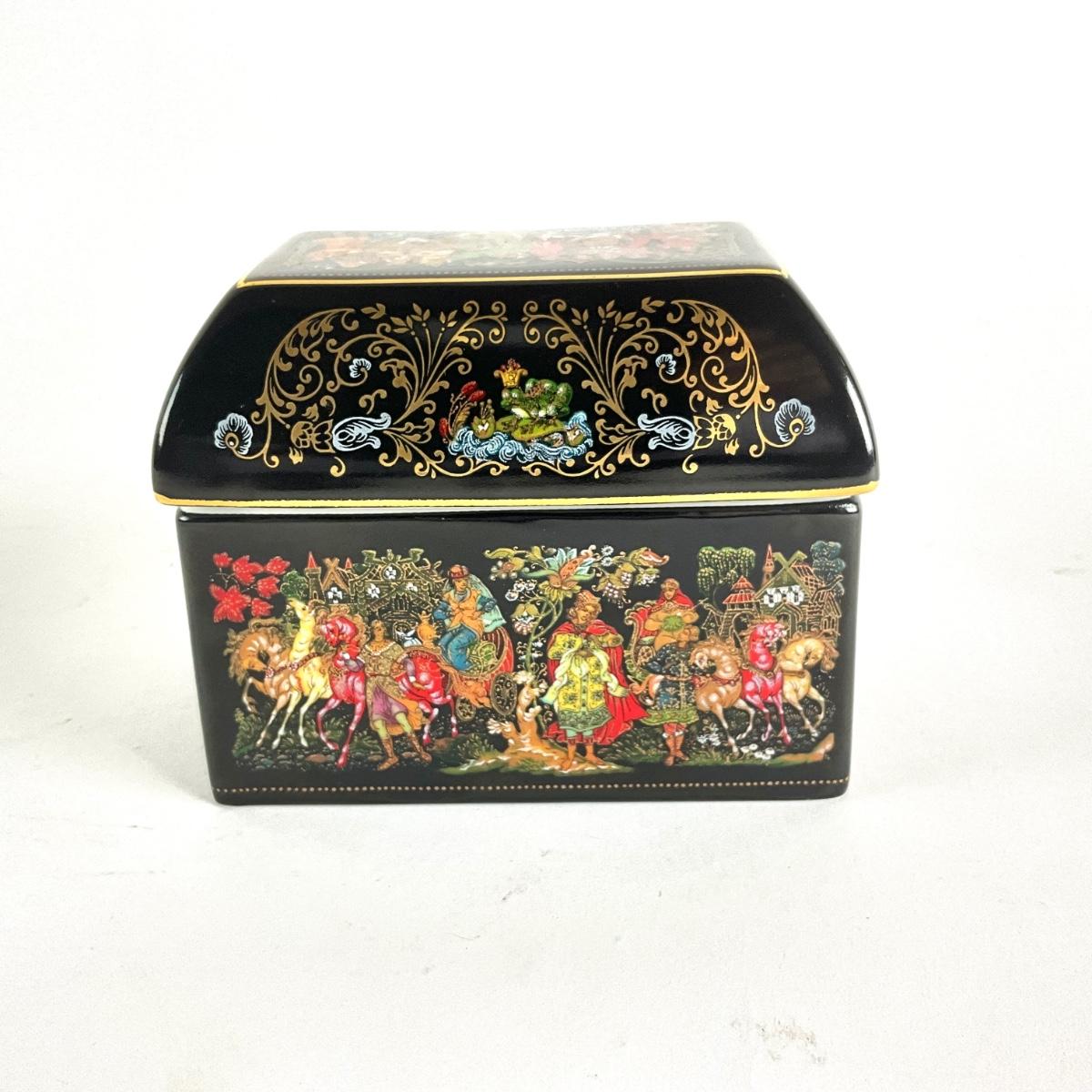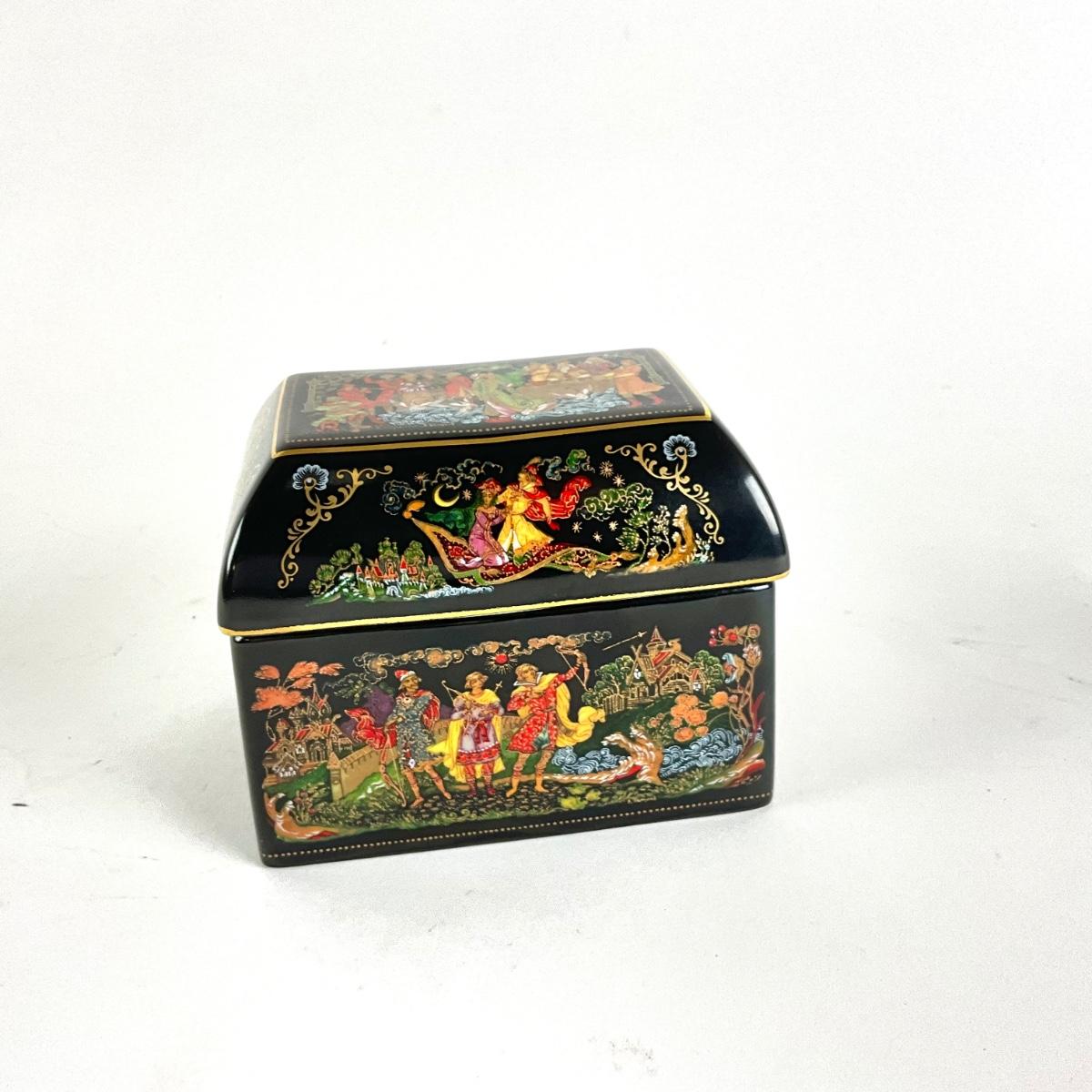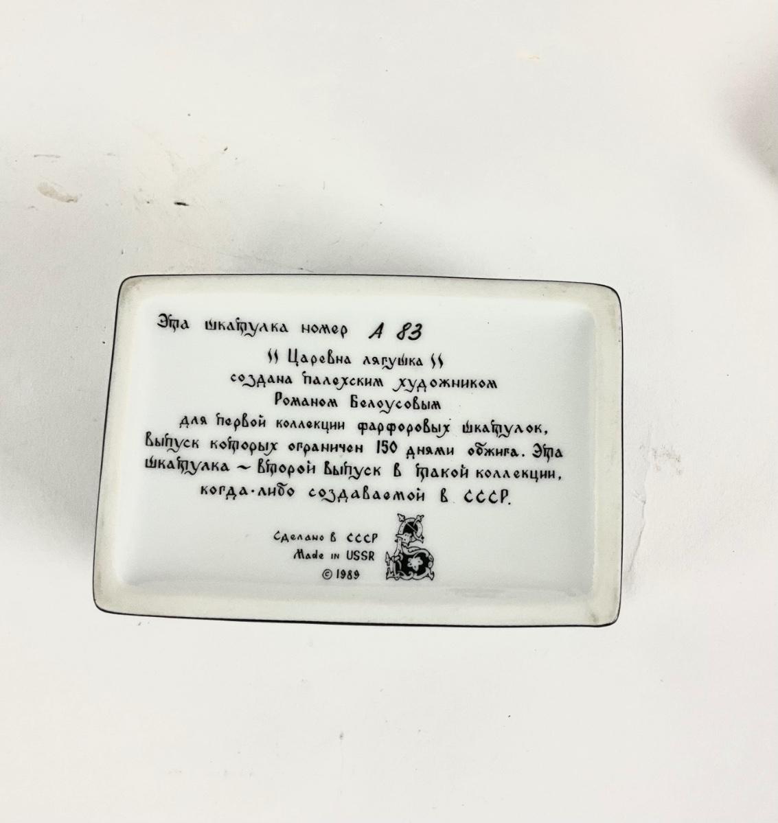 Hand painted black porcelain trinket box with colorful depiction of the Frog Princess by Russian artist Roman Belousov for Pakekh. "Era box number 83" limited edition 1989 USSR, Soviet Union. White interior, measures 4 1/8"W, 2 7/8"D, 3.5"H w/ cover. Excellent condition.