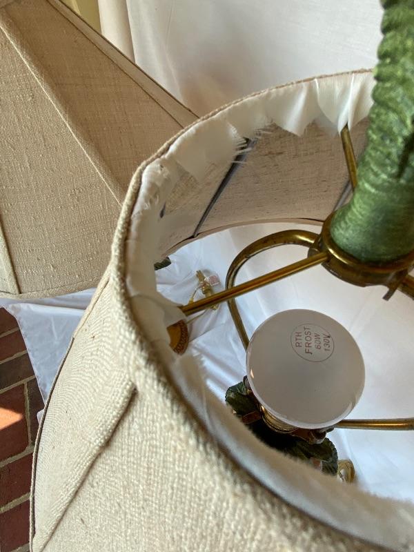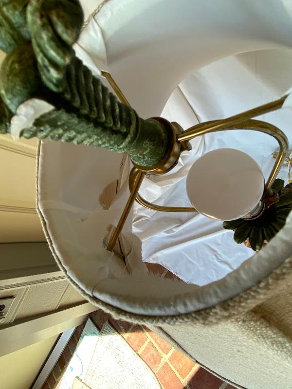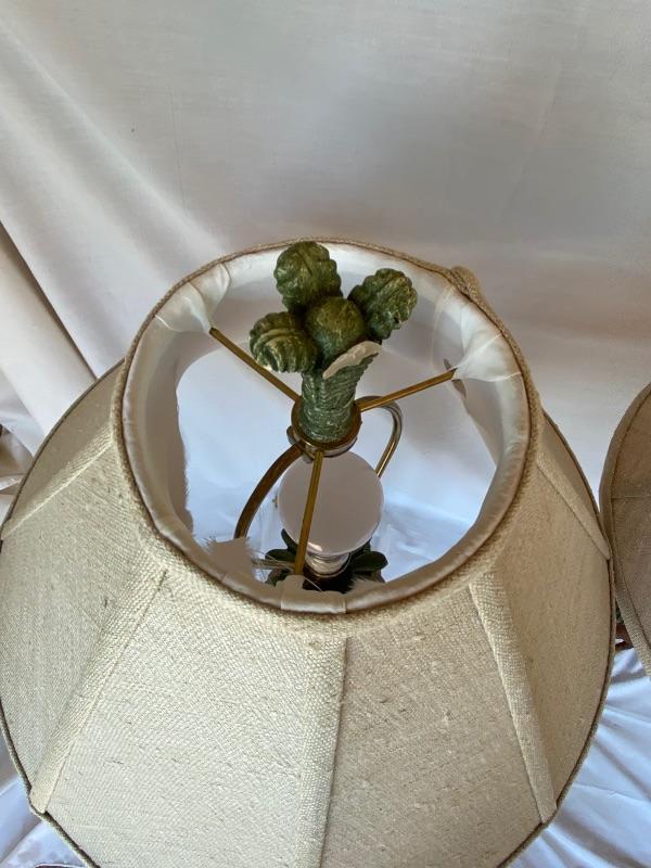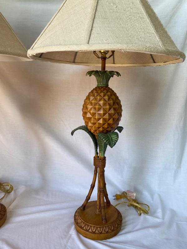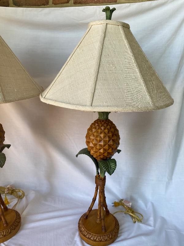 Pair of pineapple lamps made out of composite inside shade is torn on one lamp and has a broken tip on the finial these lamps measures 35 inches tall with the shade