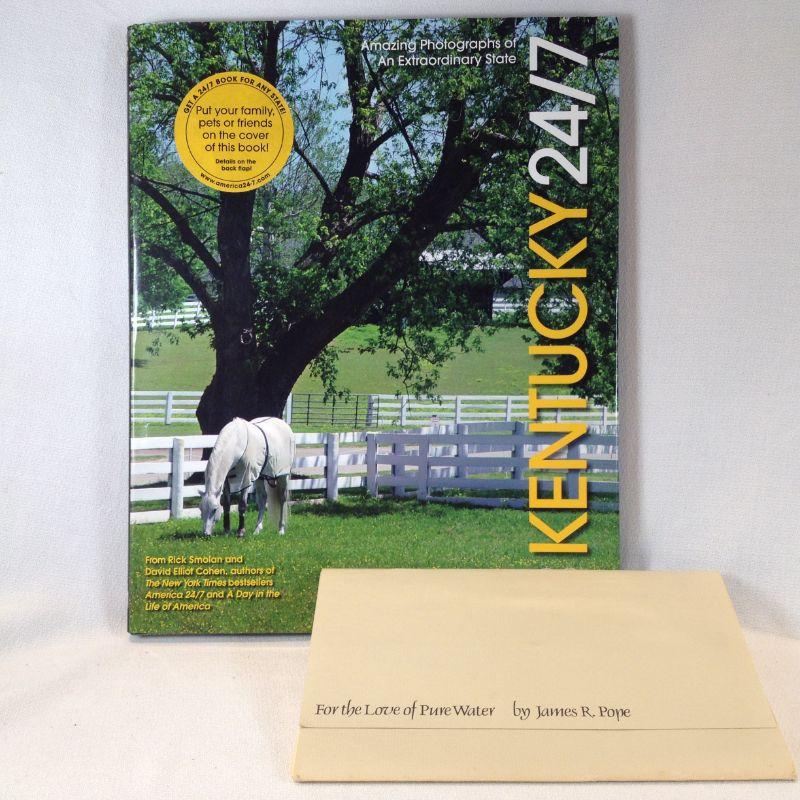 This lot is for two Kentucky Interest Books: one loaded with wonderful pictures our our fair state entitled "Kentucky 24/7" by Rick Smolan and David Cohen. Published by DK Publishing, First Edition. 2004. 144 Pages Book is in good condition with dust jacket in good condition. The second book is an autographed copy of "For the Love of Pure Water by James R. Pope. He is a Kentucky journalist, photographer, farmer and poet. It is a soft cover booklet of his poetry. Paper shows very slight wear.