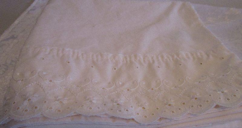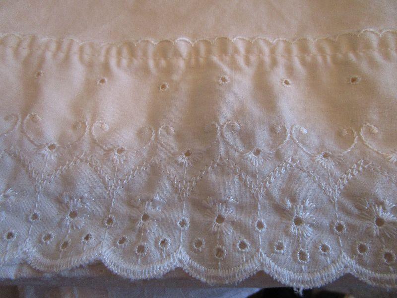 One off white pillowcase 100% cotton with eyelet trim; Four white pillowcases 50% cotton 50% polyester