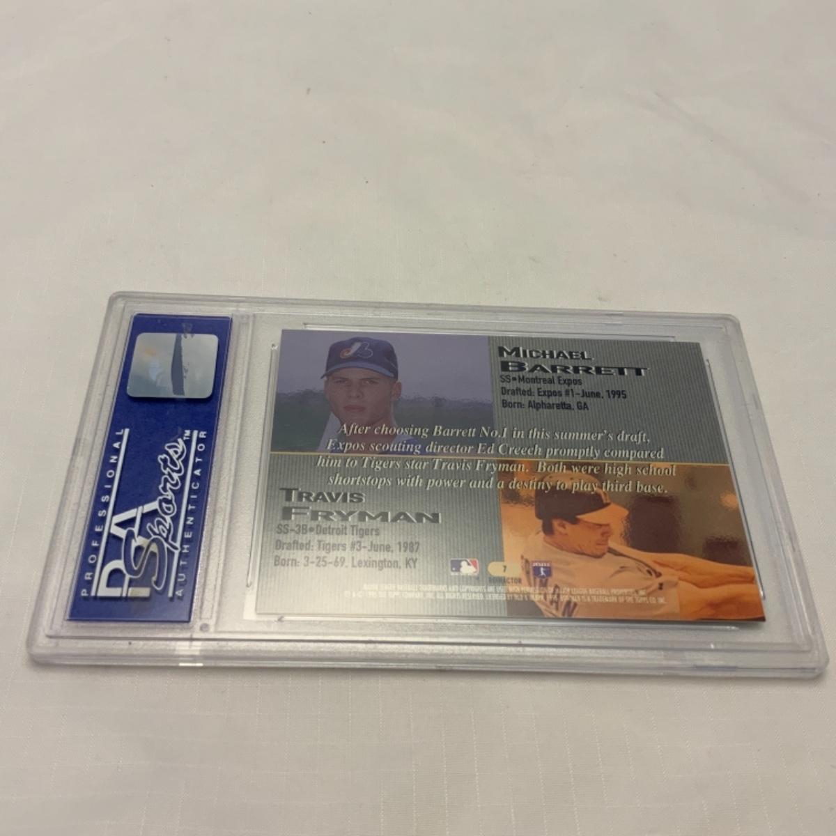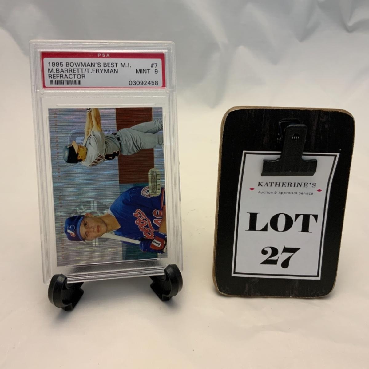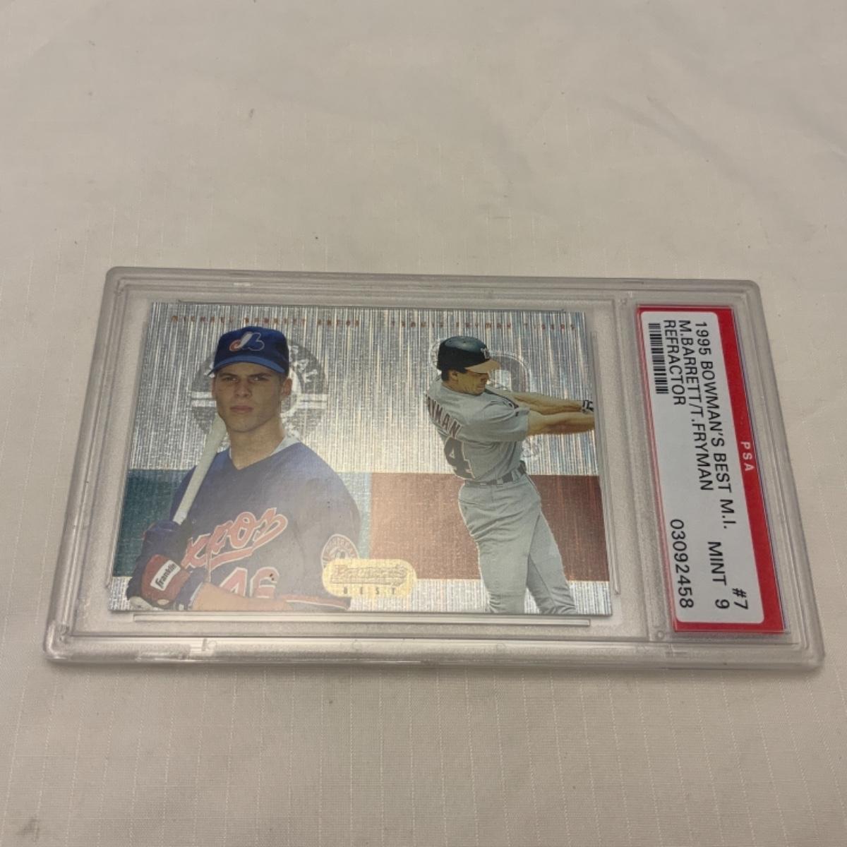 PSA Graded Card, Mint 9. 1995 Bowman Foil card #7. Featuring M Barrett and T. Fryman. Refractor Card. Please see photos for details and condition. ::: Shipping is available on this lot. If you require shipping you must let us know at the close of the auction. We will coordinate with you after the item has been won. Shipping fees will include insurance up to or exceeding the value of all items being mailed. If you have any questions regarding this lot please contact the auctioneer either via this website, by direct email or by phone. PICK UP TIMES and other important information can be found in the TERMS and DESCRIPTION of the auction. Please take a look for pertinent information. Thanks!