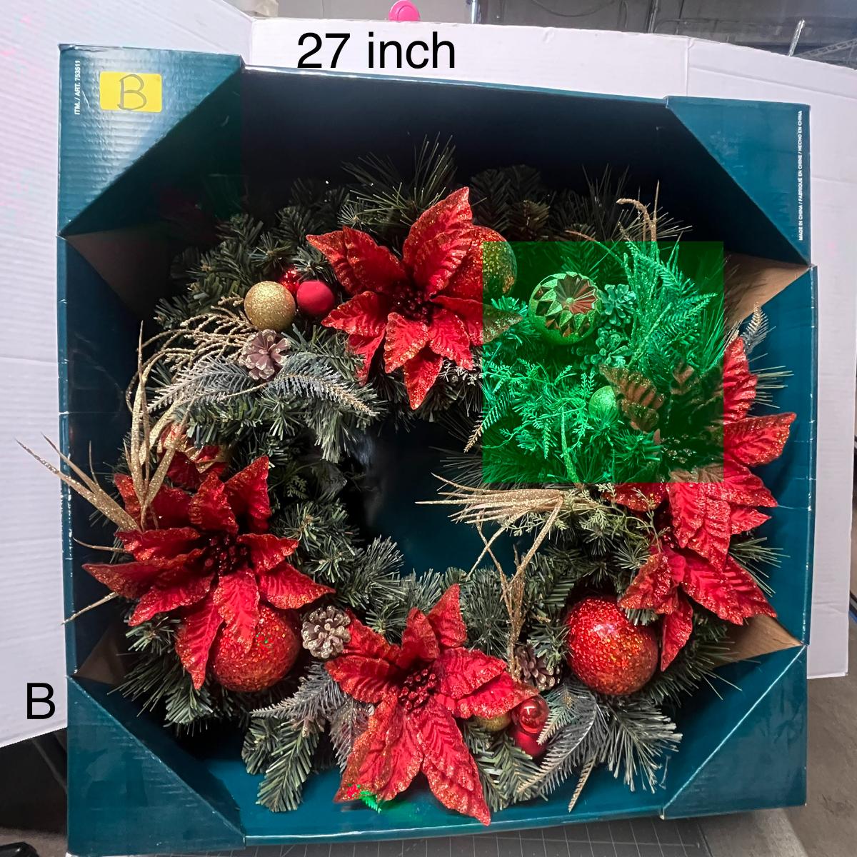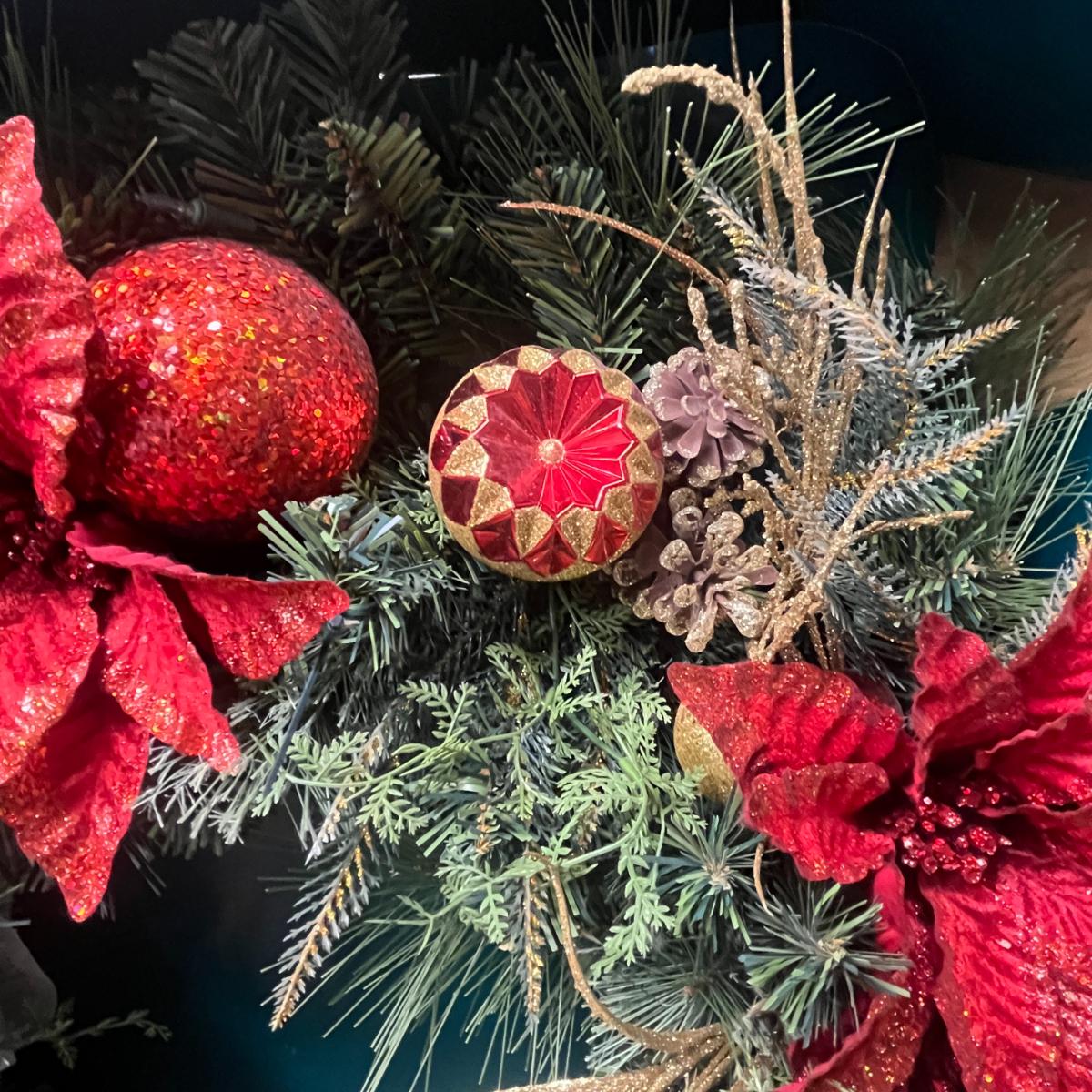 Battery-operated, auto timer, red poinsettias, ornaments, pinecones.