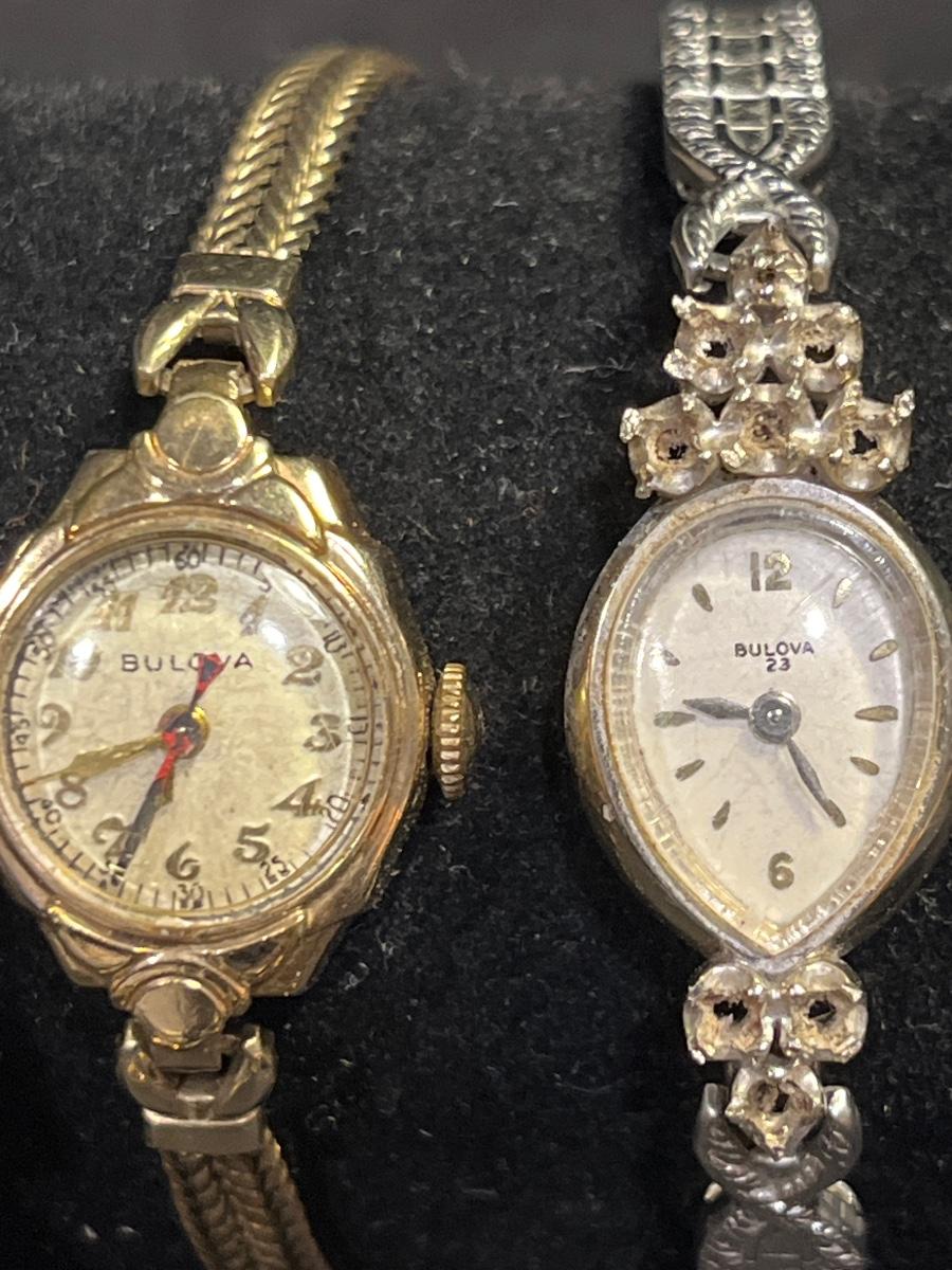 See pics. One Bulova appears to be missing stones but indicates 14K, other Bulova says 10K Rolled Gold Plate)