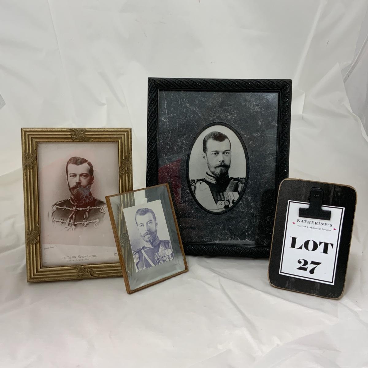 From the Estate of Peter Radovanovich: Three framed photographs of Czar Nicolas Romanov II. The two larger pieces have been professionally framed. The smaller photo, encased in glass was a gift, and does have some chips in the beveled glass, pictured. The gold framed picture looks to be either a cabinet card or postcard. Please see photos for details and condition. ::: Shipping is available on this lot. If you require shipping you must let us know at the close of the auction. We will coordinate with you after the item has been won. Shipping fees will include insurance up to or exceeding the value of all items being mailed. If you have any questions regarding this lot please contact the auctioneer either via this website, by direct email or by phone. PICK UP TIMES and other important information can be found in the TERMS and DESCRIPTION of the auction. Please take a look for pertinent information. Thanks!