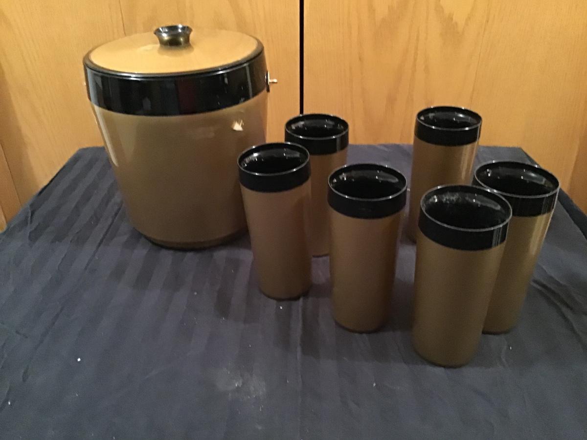 Includes 6 glasses & ice bucket. See pics for what appears to be tape on ice bucket. Items were wrapped in plastic in original box