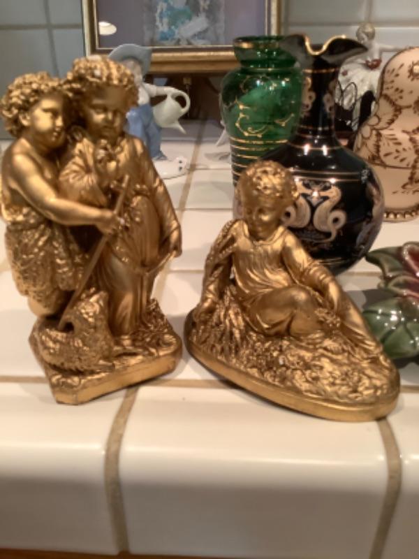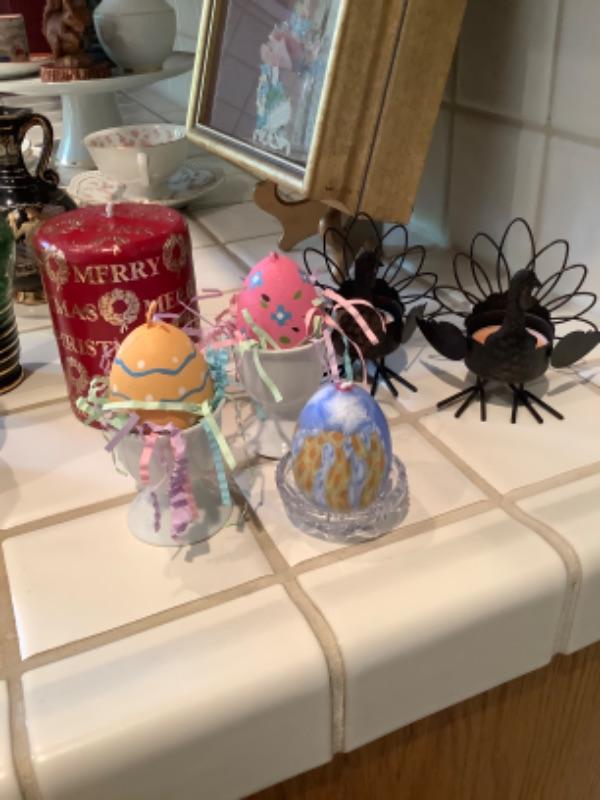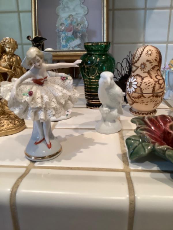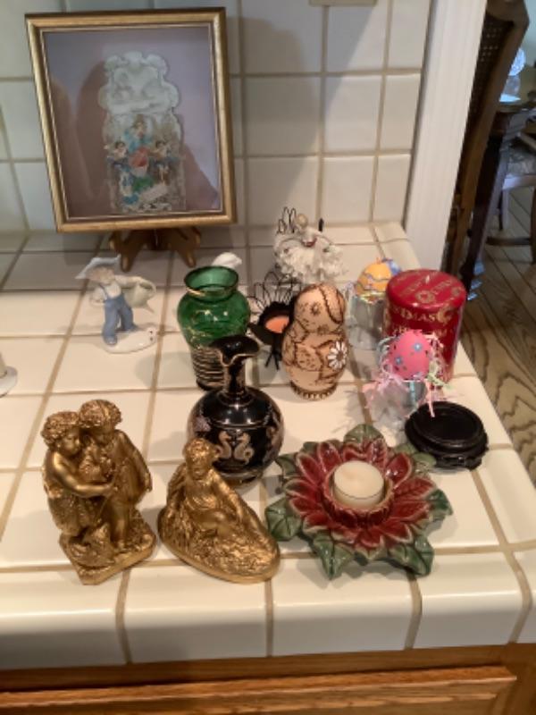 A great collection of seasonal decor and new candle. Framed vintage Valentine. Precious porcelain ballerina, collection of glass and ceramic bud vases.