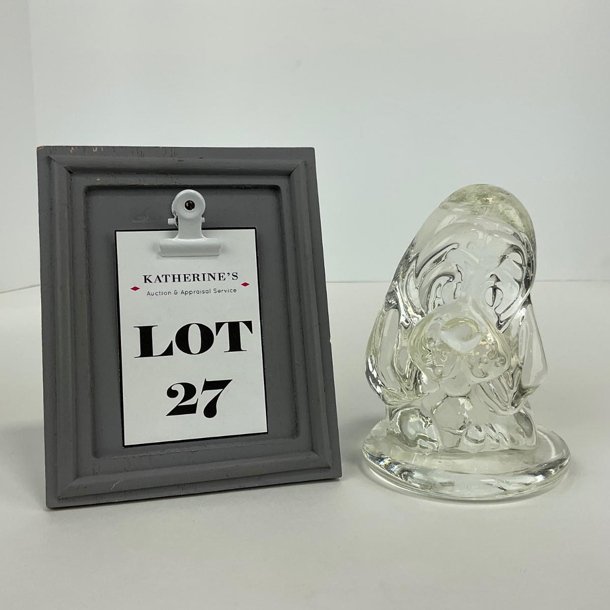 One vintage clear glass hound dog with a few minor scuffs and marks but otherwise appears to be in good shape. Please see photos for details and condition. Any condition statement is given as a courtesy to a client, is an opinion, and should not be treated as a statement of fact. Reference to condition written, oral or within a condition report shall not be regarded as a full account of condition and may not include all defects, alterations, or restorations. Absence of a condition report does not imply a lot is flawless or lacking imperfections or damage. Katherine’s Auction & Appraisal Service shall have no responsibility for any error or omission. Returns shall not be accepted on the basis of condition. ::: Shipping is available on this lot. If you require shipping you must let us know at the close of the auction. We will coordinate with you after the item has been won. Shipping fees will include insurance up to or exceeding the value of all items being mailed. If you have any questions regarding this lot please contact the auctioneer either via this website, by direct email or by phone. PICK UP TIMES and other important information can be found in the TERMS and DESCRIPTION of the auction. Please take a look for pertinent information. Thanks!