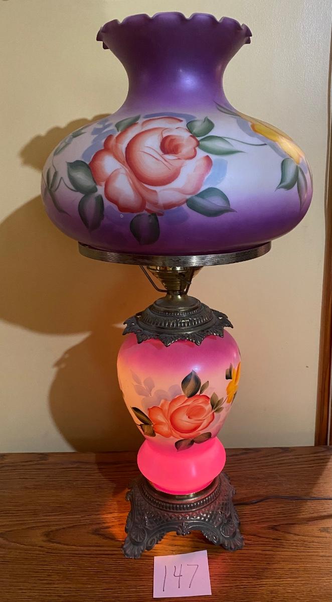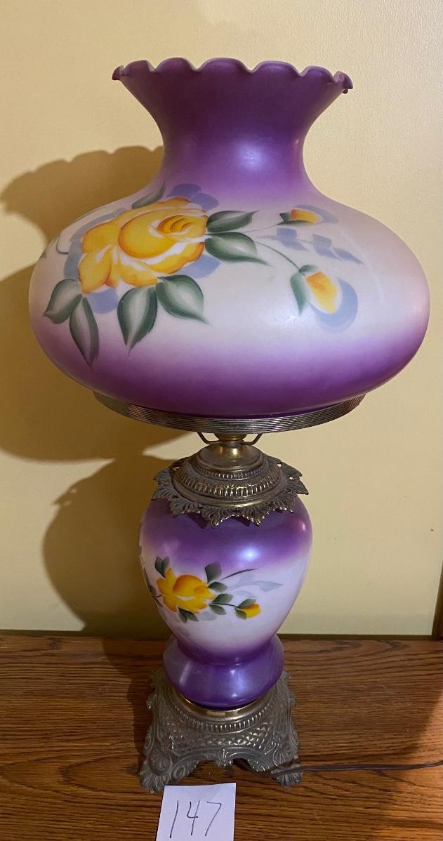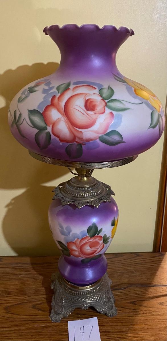 27” Vintage Hand Painted Purple Rose Cast Hurricane Lamp
