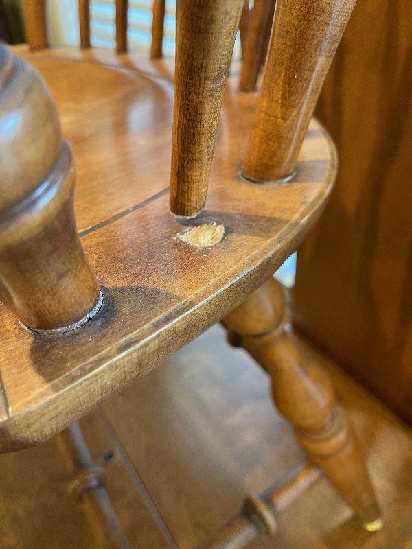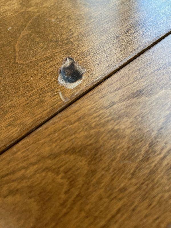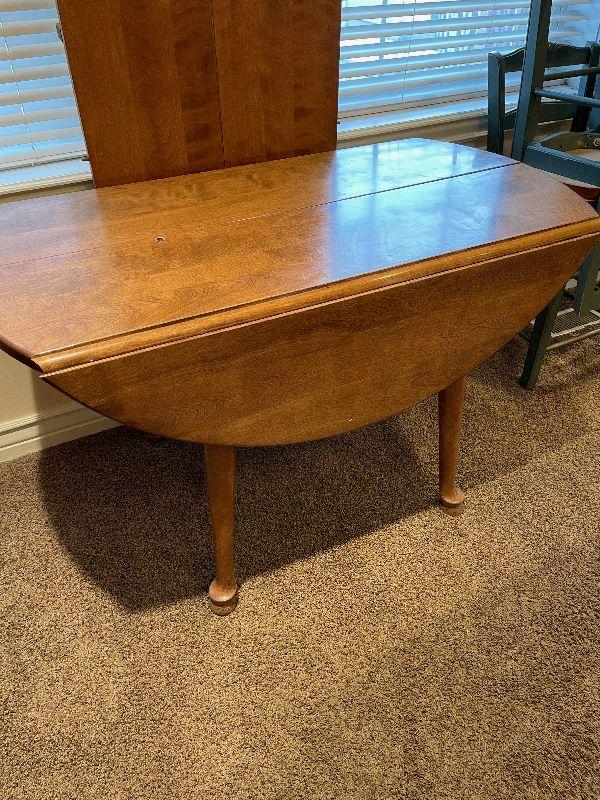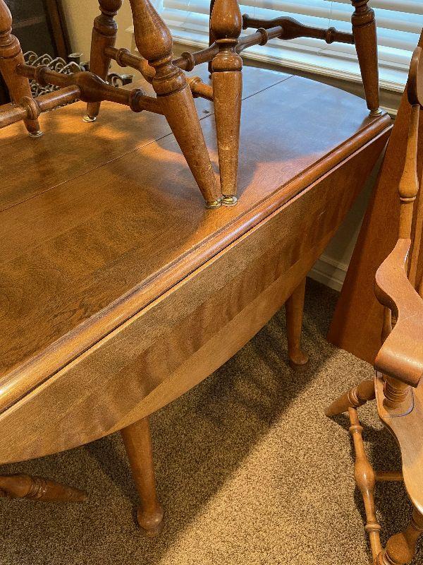 Shows a little wear from use. Table top has a small burn, Great Drop Leaf Sides. All the Chairs a little bit loose. Good Candidate for restoration - Table Makes into 48" Round with out the leaves in it. So it just gets better and bigger.