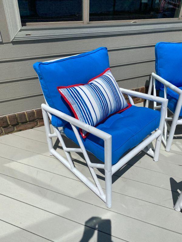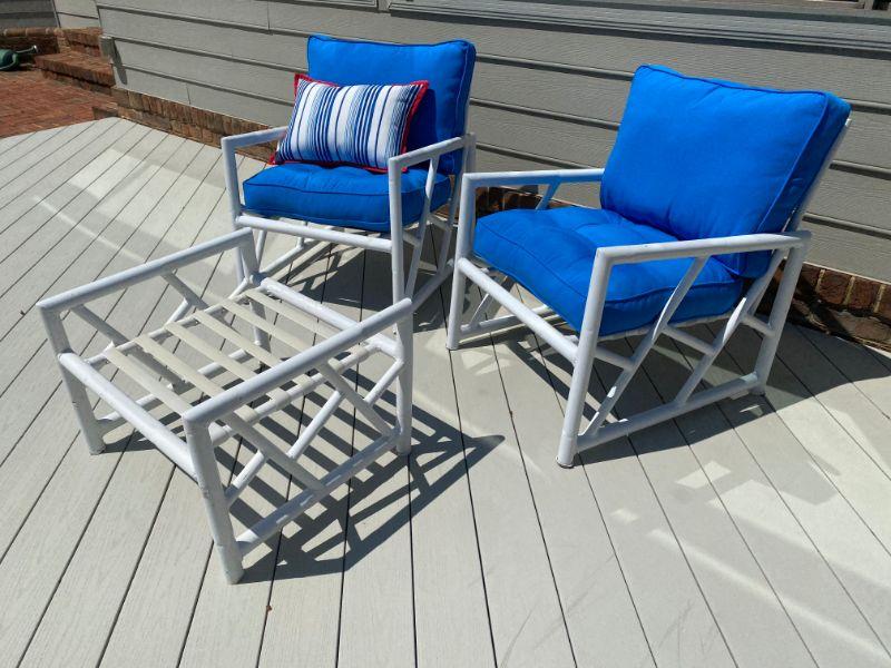 3-pc Outdoor Chippendale Chair Set with cushions chairs are constructed out of rattan and painted white. They measure 29" tall , 29" wide, 29" deep , The ottoman measures 25" x 22" x 27" tall . The cushions were purchased 07/2020